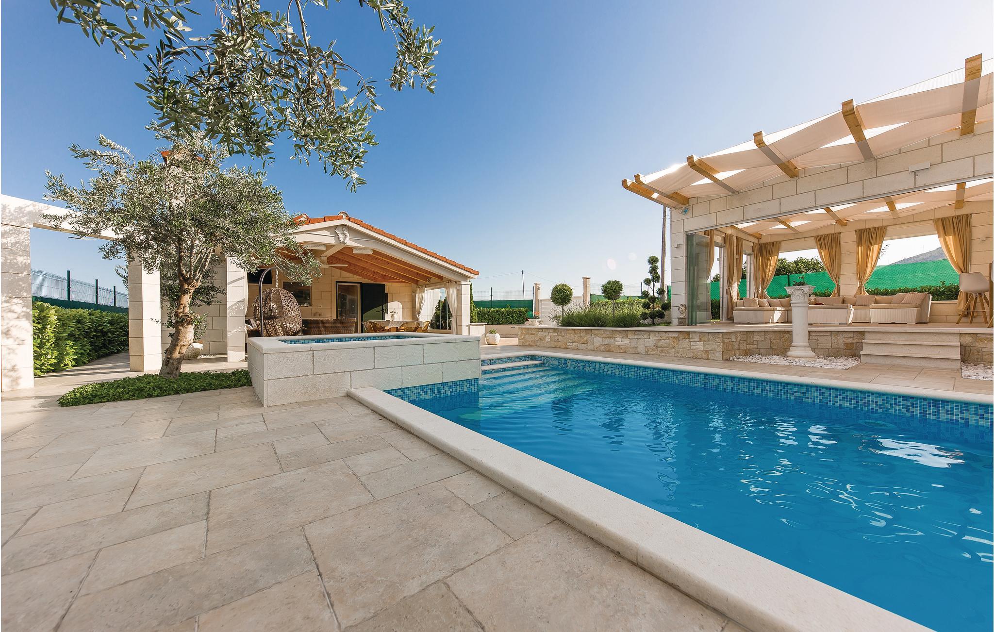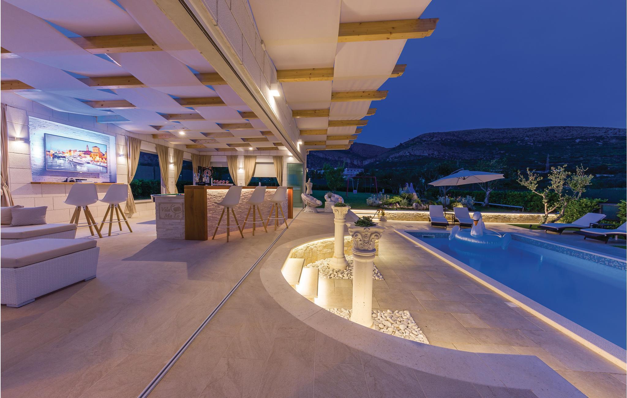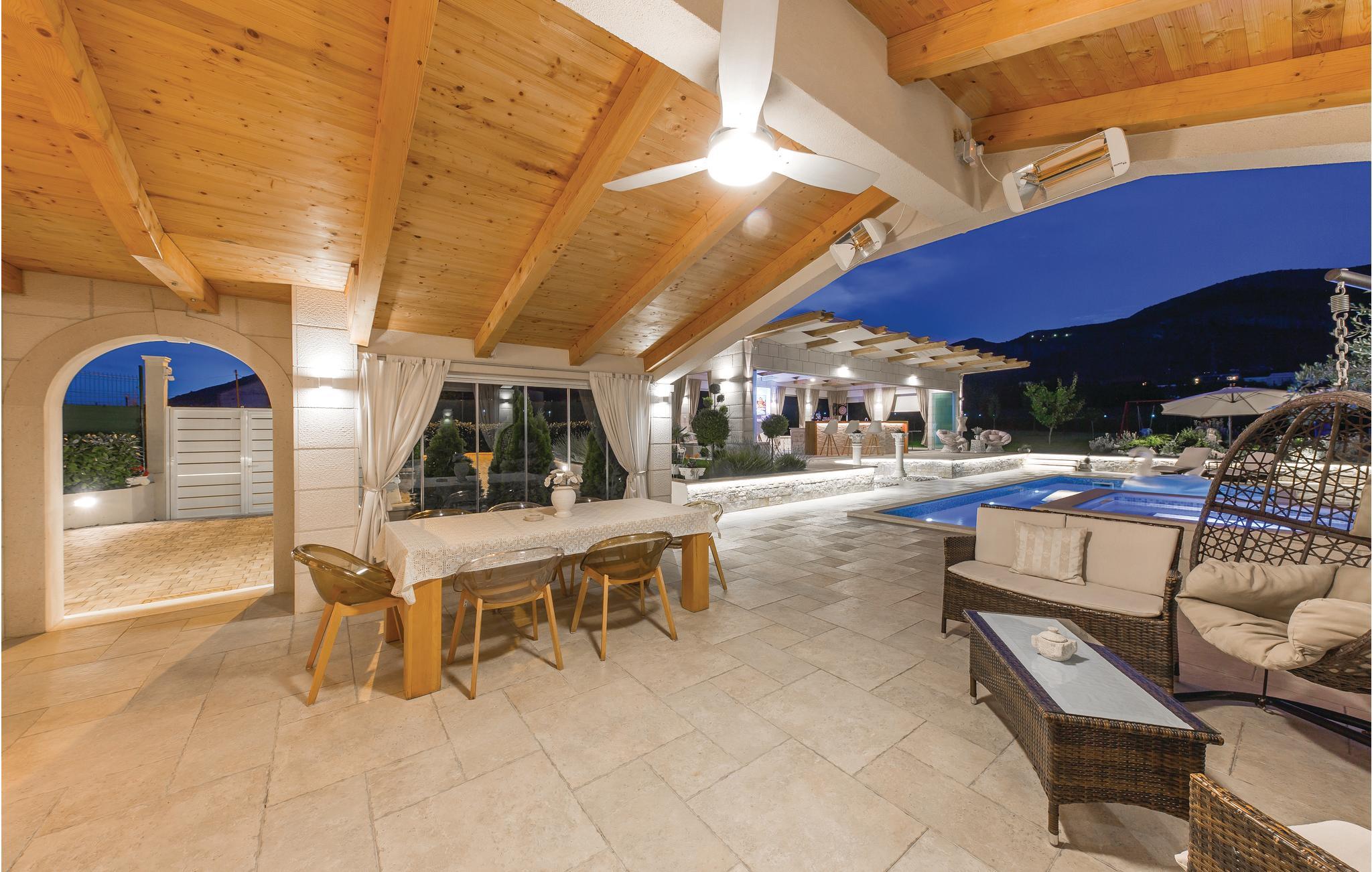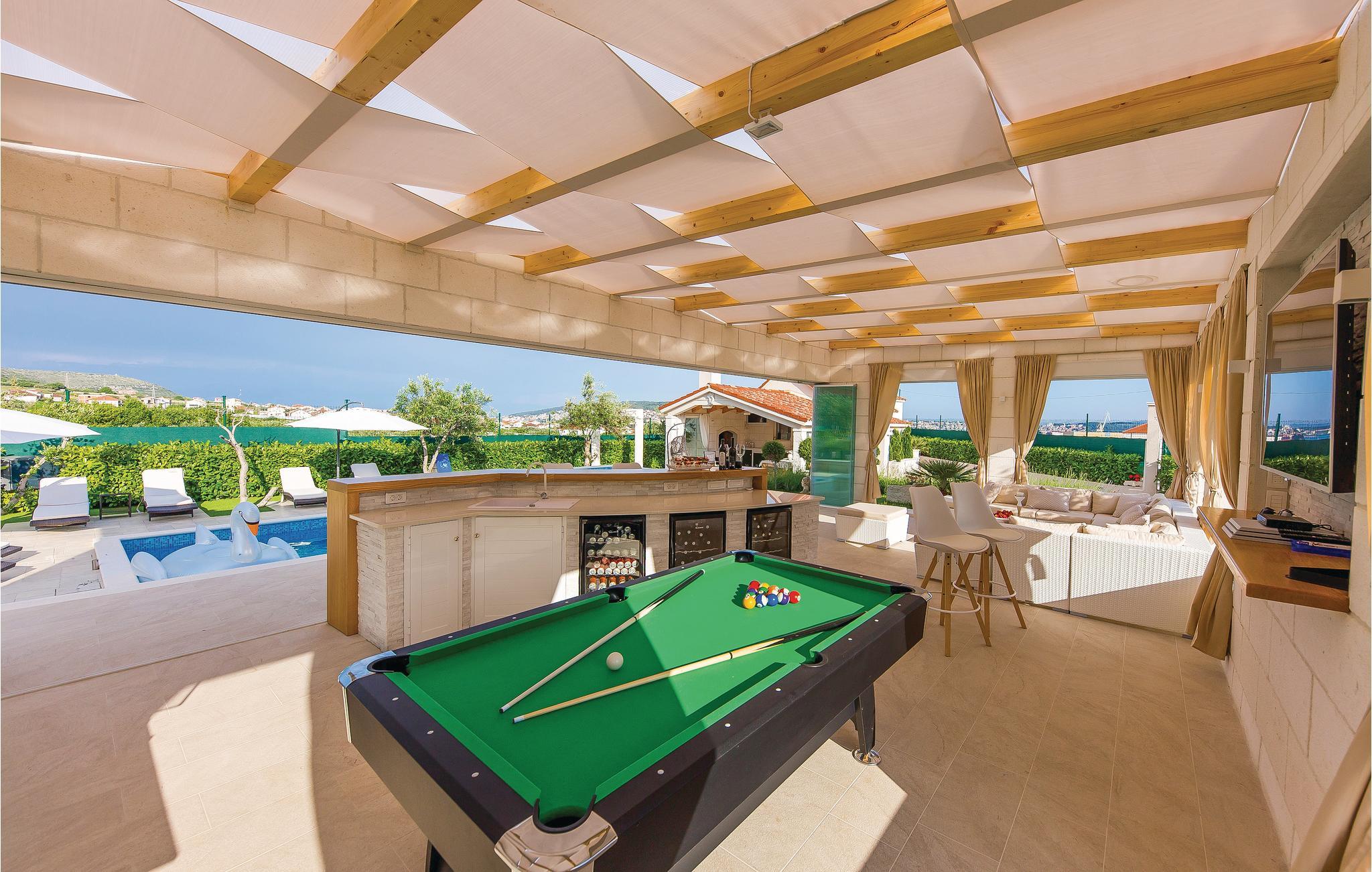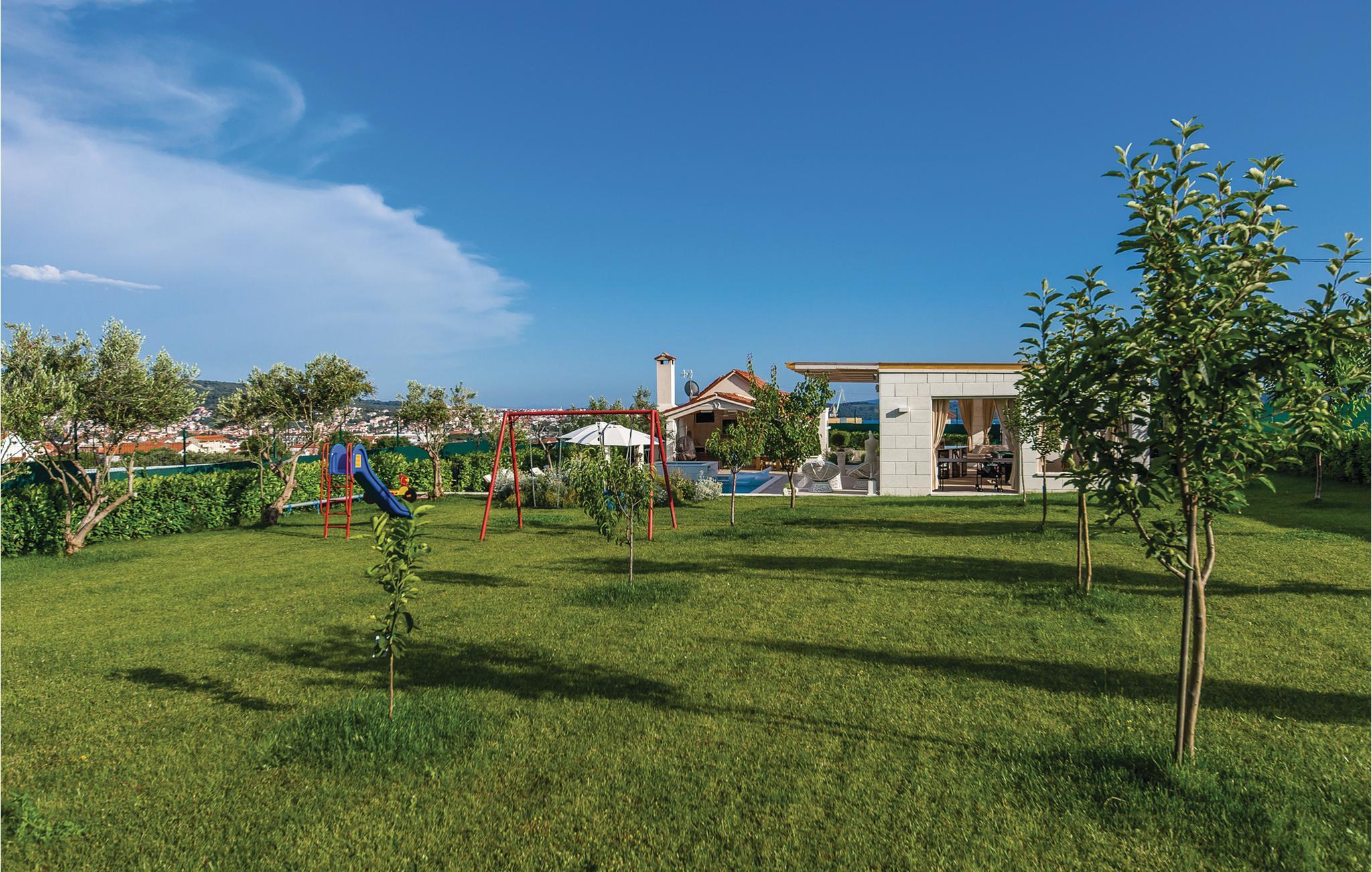 Dette nydelige feriehuset i nydelige grønne omgivelser, er beskyttet mot innsyn fra andre og ligger på en fullstendig inngjerdet tomt. Boligen har tre soverom med egne klimaanlegg. I første etasje er det en komfortabel stue med kjøkken og utgang til den overbygde terrassen, som ligger nær bassenget. På den overbygde terrassen er det også et sommerkjøkken med grill. Selvfølgelig er det også en lekeplass i den vakkert anlagte hagen, samt frukttrær og en liten grønnsakshage. Nyt den vakre utsikten over Trogirbukten og det omkringliggende landskapet. Utforsk det interessante nattelivet i sentrum av Trogir og besøk de mange severdighetene. Takhelling til 135 cm.
