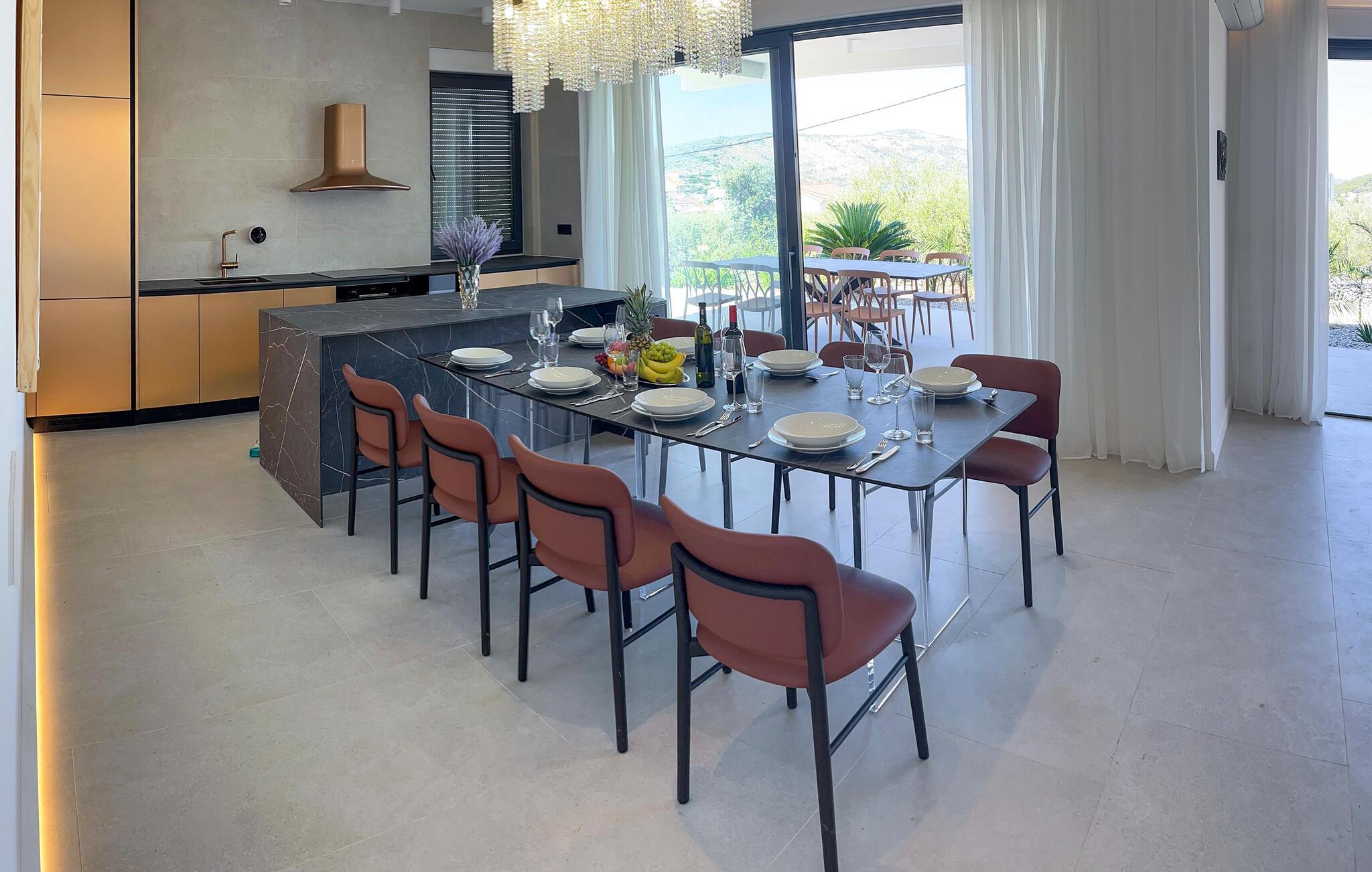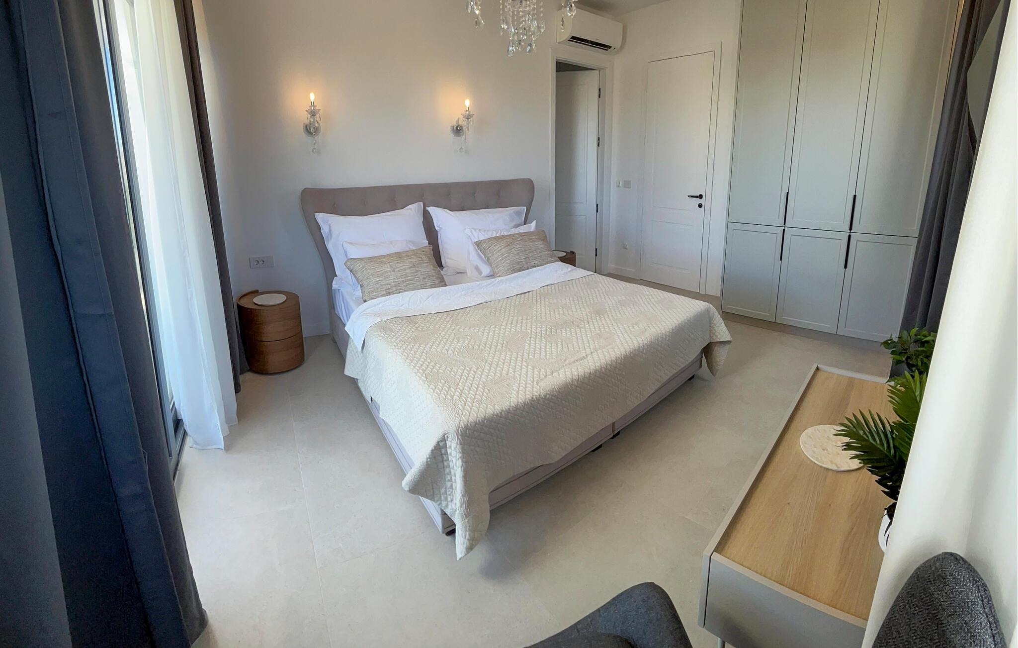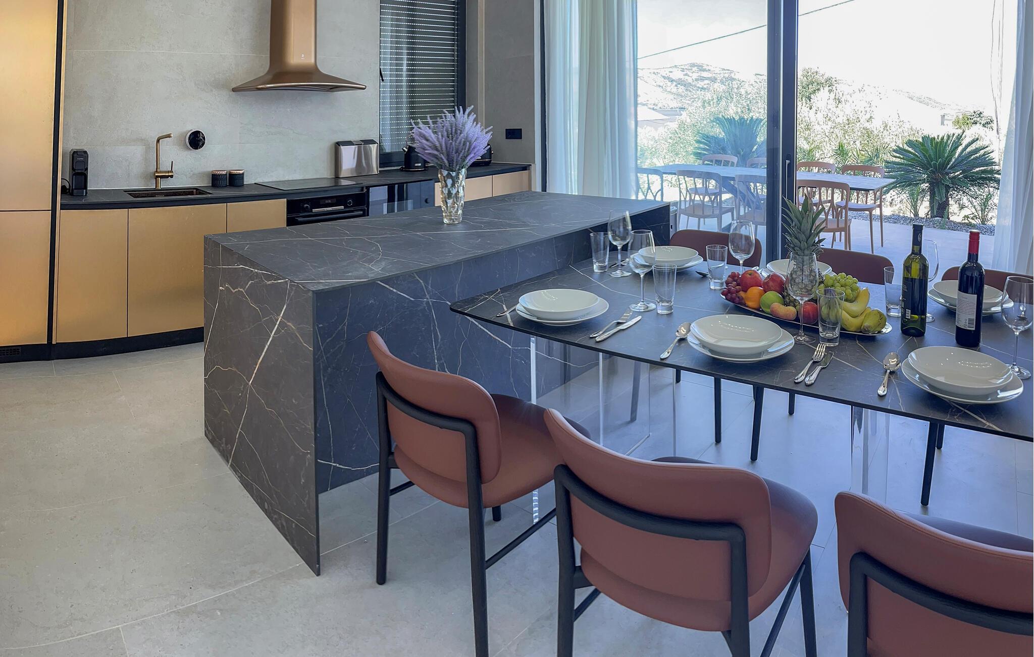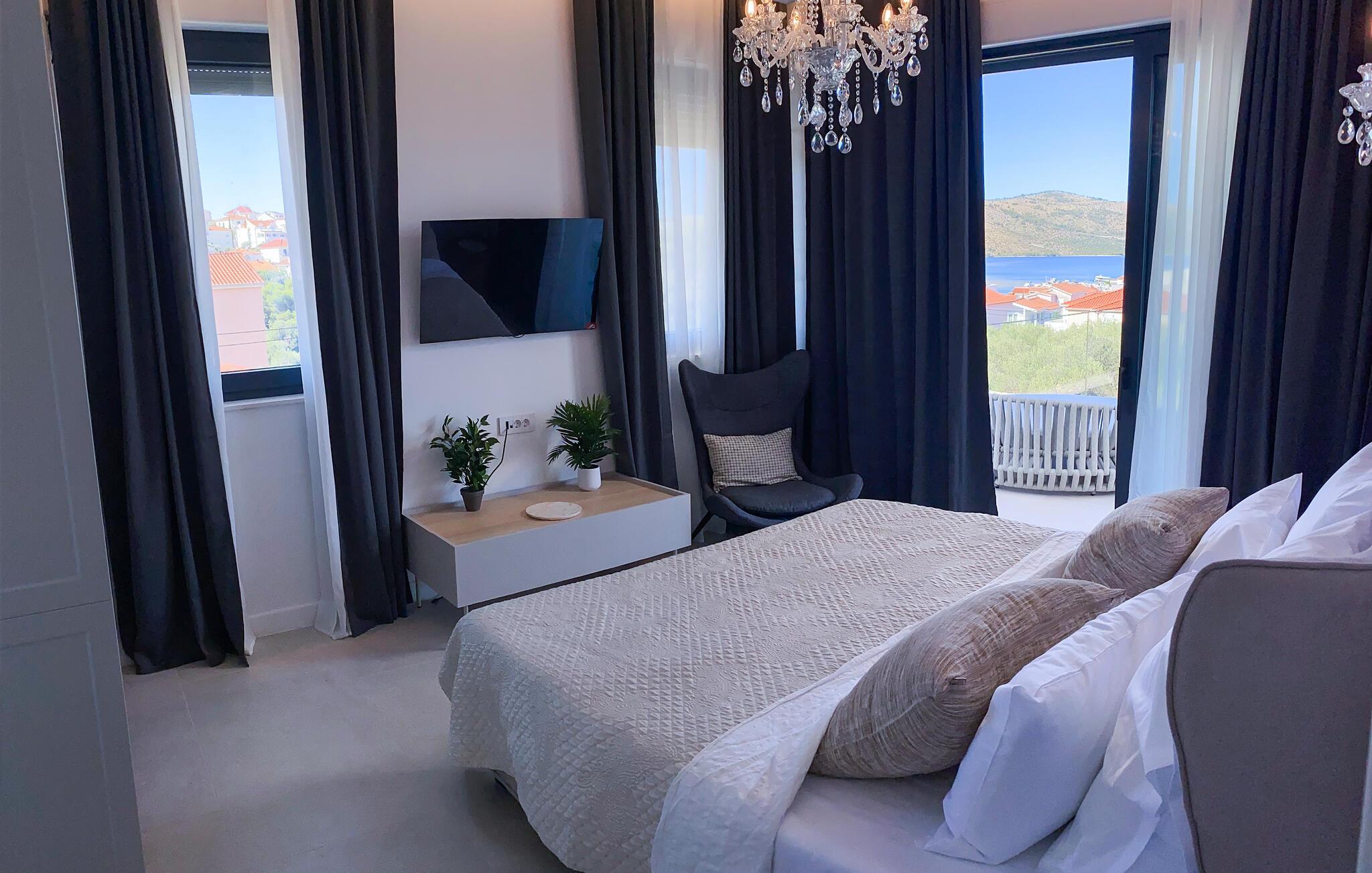 Dette feriehuset av høy kvalitet vil skjemme deg bort med et romslig interiør innredet med stilfulle designermøbler og en fortryllende utsikt over den turkise bukten. La deg friste av kulinariske høydepunkter og nyt harmoniske måltider ved det innbydende spisebordet. Om kvelden kan du prate i den koselige stuen eller slappe av med en god film.