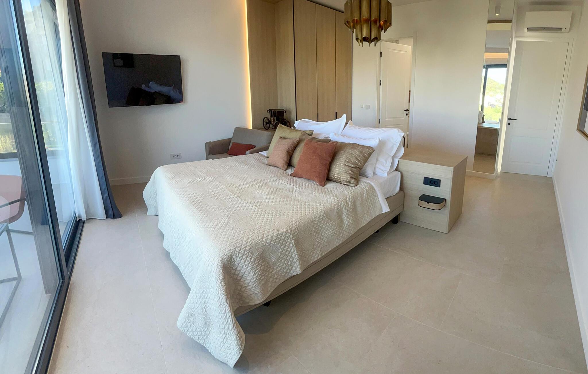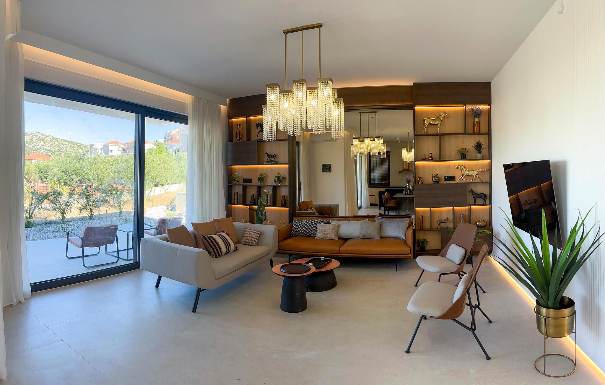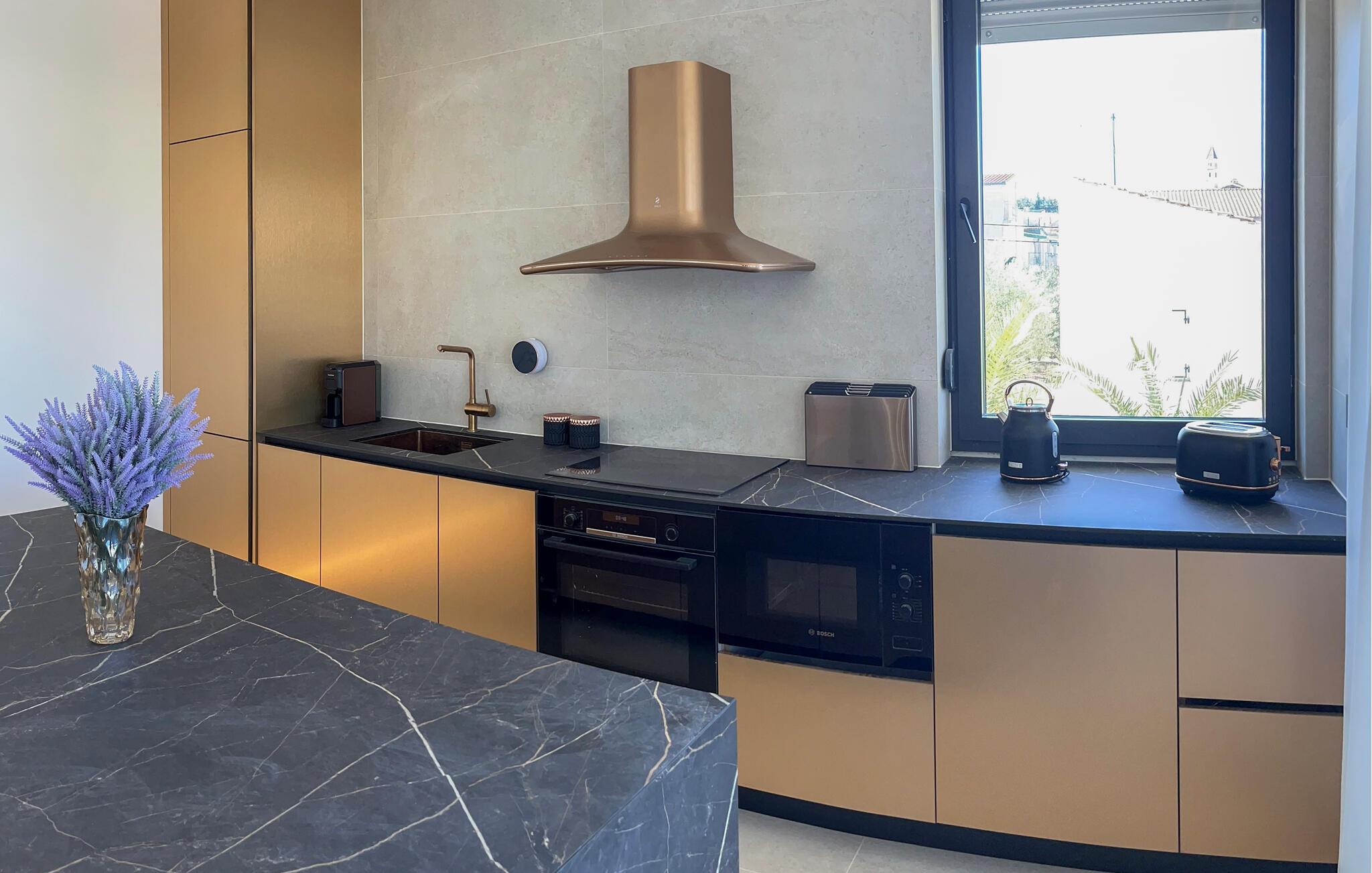 Dette feriehuset av høy kvalitet vil skjemme deg bort med et romslig interiør innredet med stilfulle designermøbler og en fortryllende utsikt over den turkise bukten. La deg friste av kulinariske høydepunkter og nyt harmoniske måltider ved det innbydende spisebordet. Om kvelden kan du prate i den koselige stuen eller slappe av med en god film.