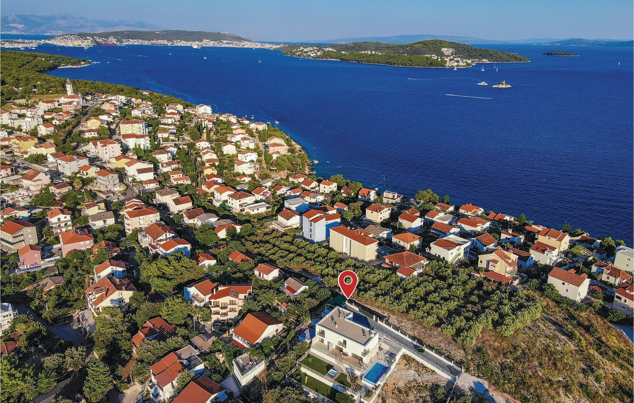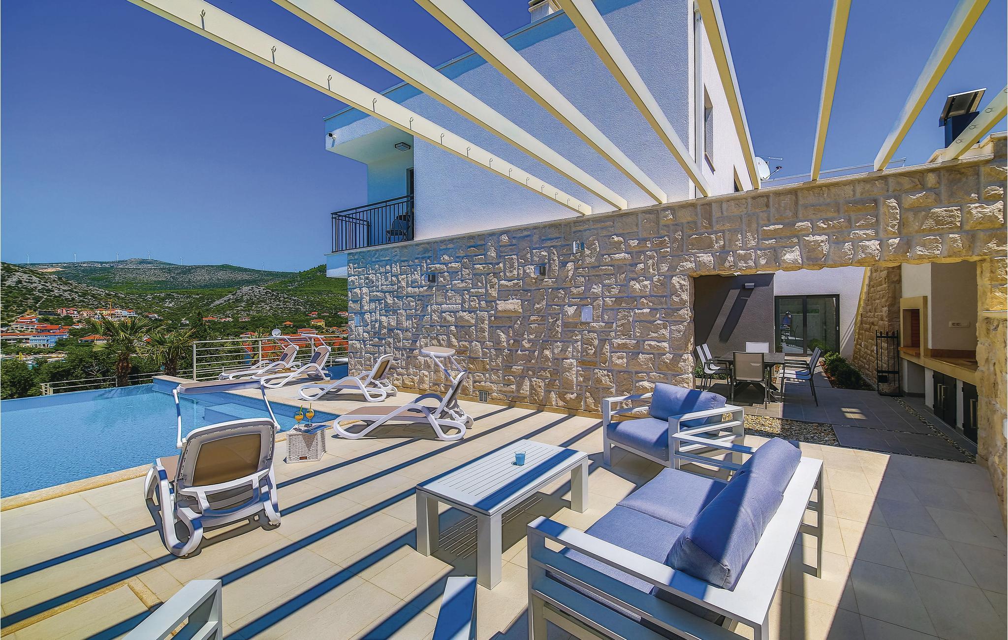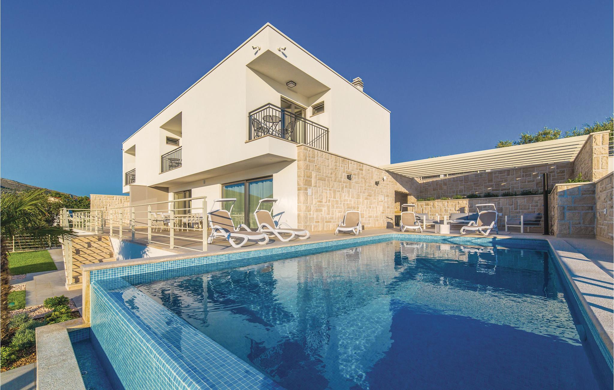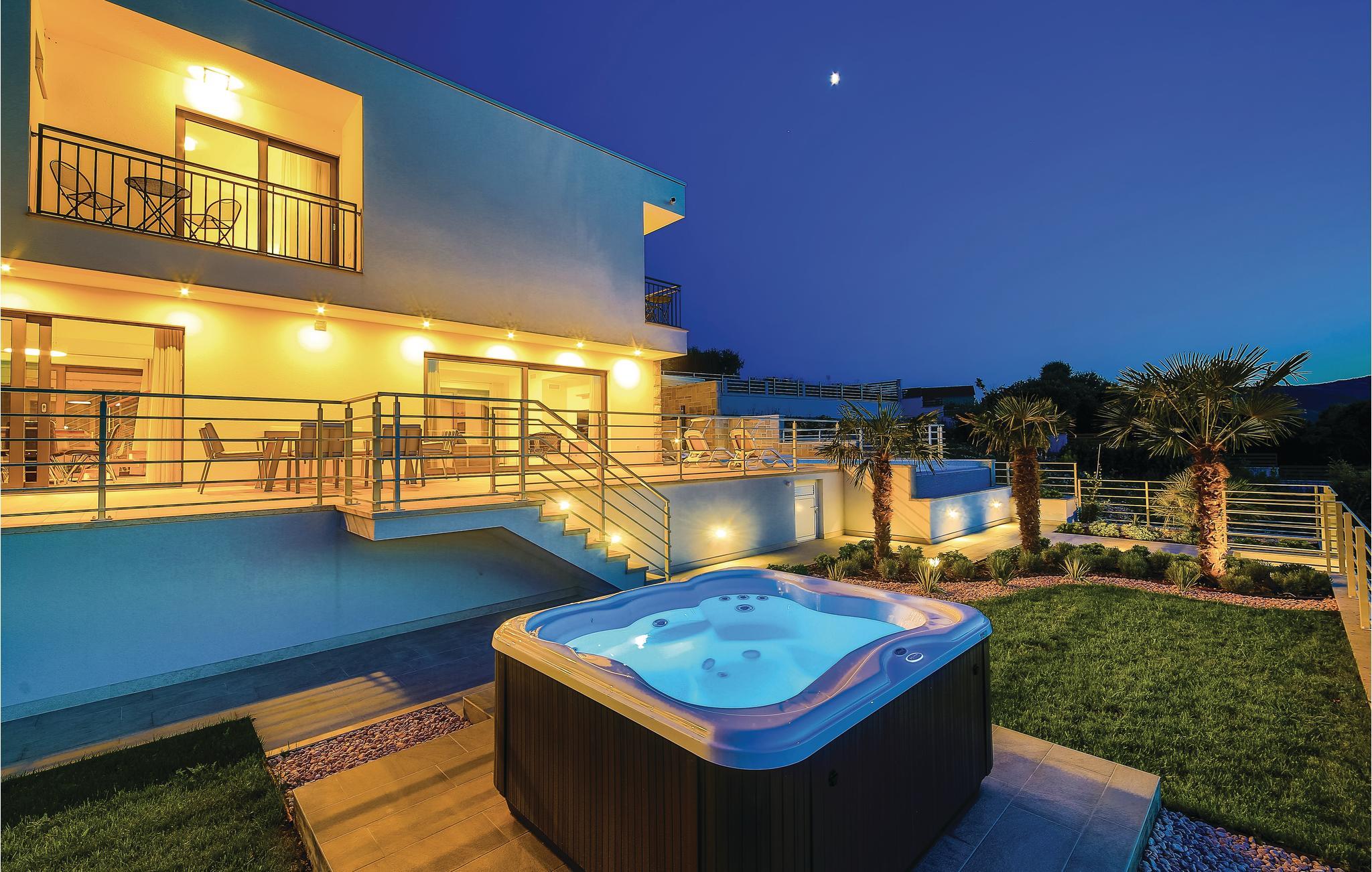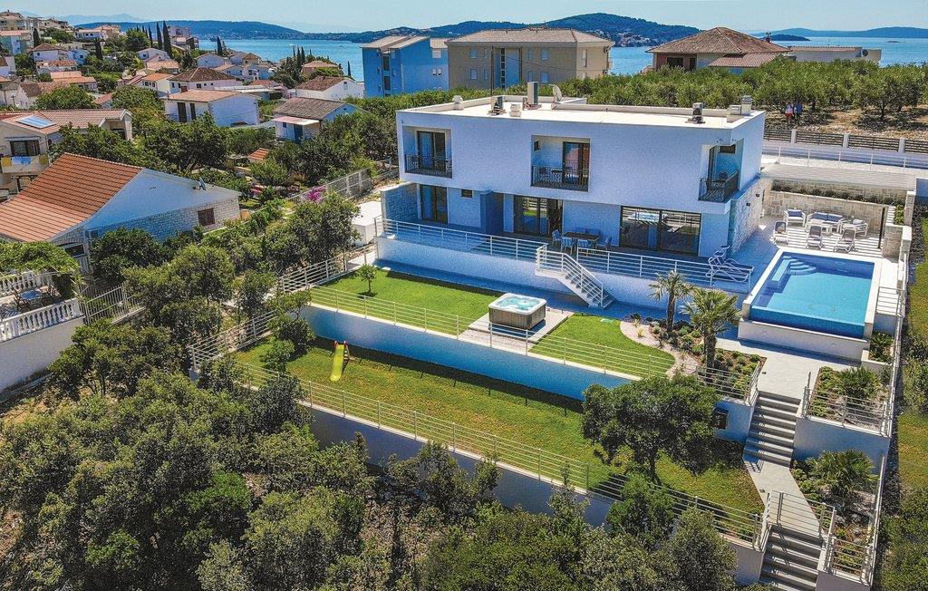 Denne nydelige villaen med basseng ligger i den lille landsbyen Trget Vranjica og har alt for å gjøre en ferie til en uforglemmelig opplevelse. De vakre møblene gir deg hygge og komfort. Badstuen og boblebadet inviterer deg til å tilbringe hyggelige timer med å slappe av, treningsrommet gir sportslig variasjon og det oppvarmede bassenget gir forfriskning selv på kjøligere dager. Ta turen til den nærliggende stranden og nyt det behagelige klimaet ved Adriaterhavet. Spaser gjennom de romantiske smugene i Trogir og beundre de gotiske, romanske, renessanse- og barokke kunstskattene som du finner mange steder i byen. Av de 4 parkeringsplassene er to dekket og en er i garasjen.