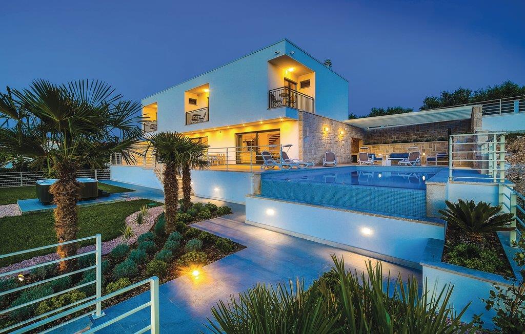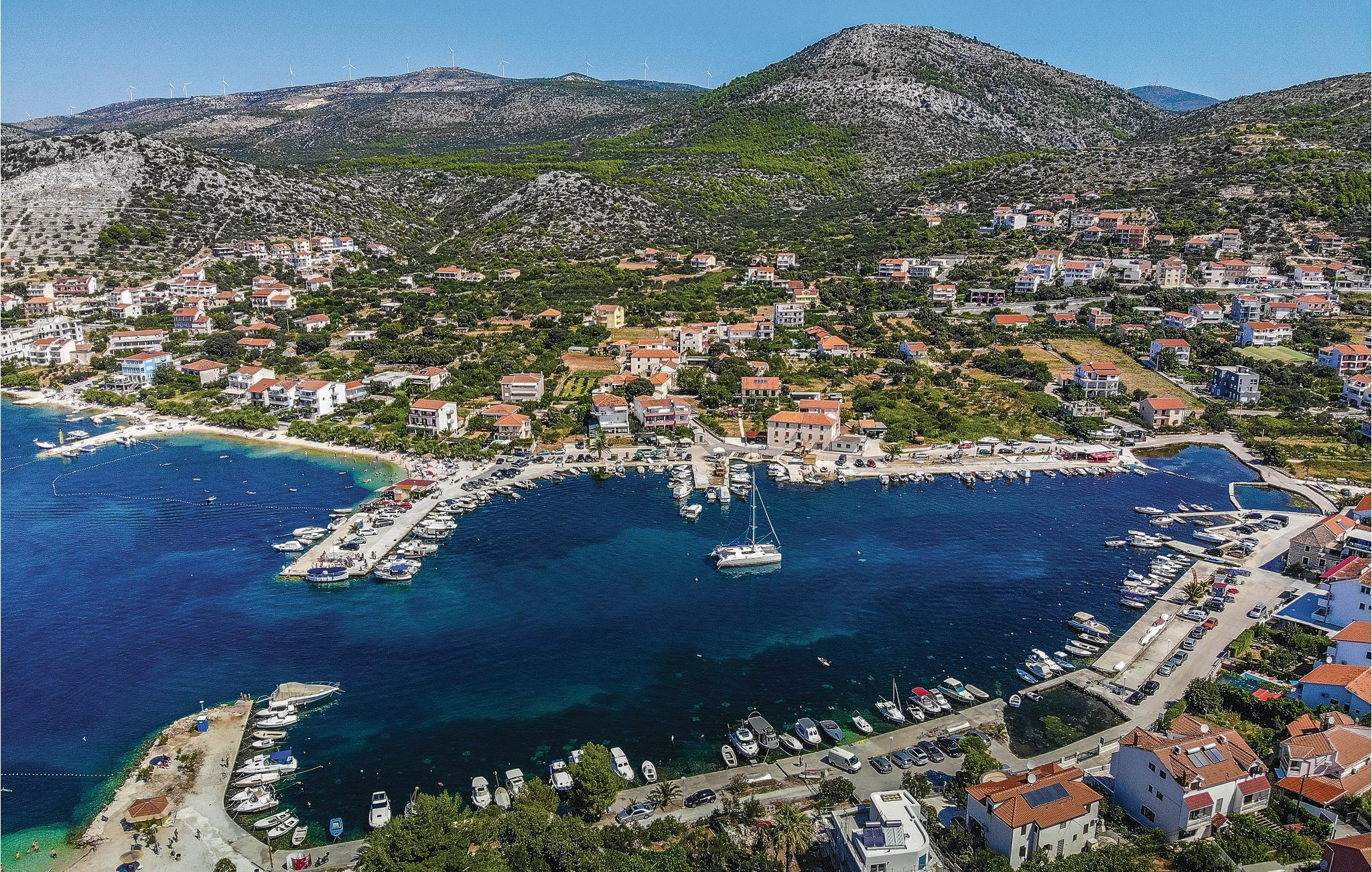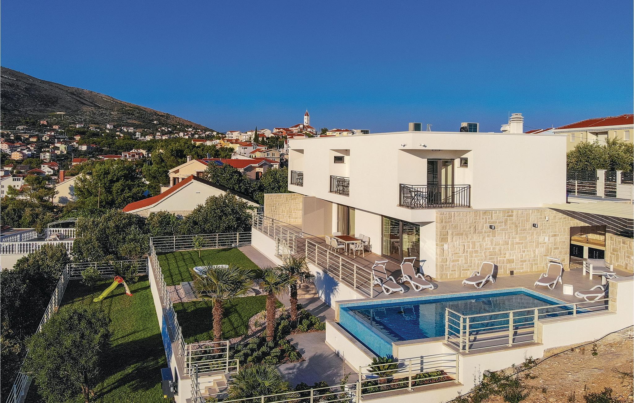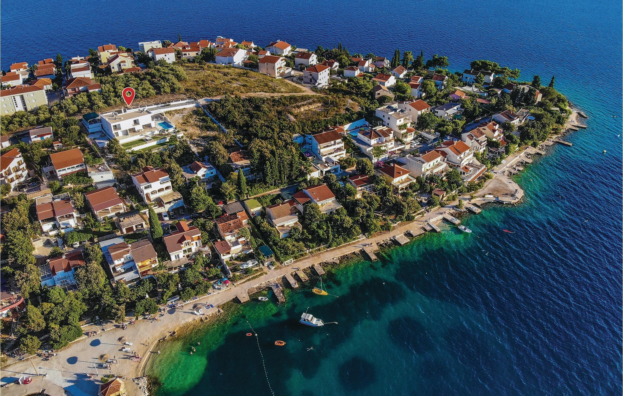 Denne nydelige villaen med basseng ligger i den lille landsbyen Trget Vranjica og har alt for å gjøre en ferie til en uforglemmelig opplevelse. De vakre møblene gir deg hygge og komfort. Badstuen og boblebadet inviterer deg til å tilbringe hyggelige timer med å slappe av, treningsrommet gir sportslig variasjon og det oppvarmede bassenget gir forfriskning selv på kjøligere dager. Ta turen til den nærliggende stranden og nyt det behagelige klimaet ved Adriaterhavet. Spaser gjennom de romantiske smugene i Trogir og beundre de gotiske, romanske, renessanse- og barokke kunstskattene som du finner mange steder i byen. Av de 4 parkeringsplassene er to dekket og en er i garasjen.