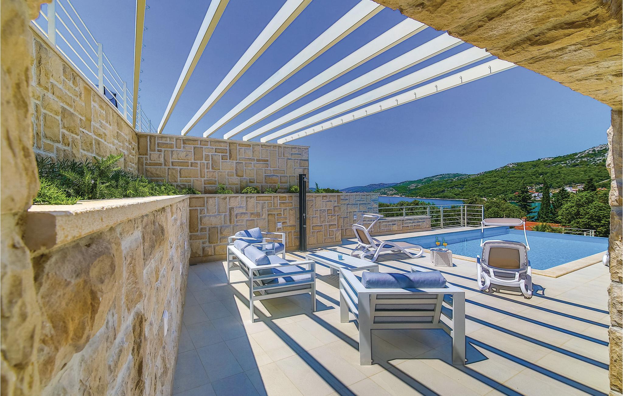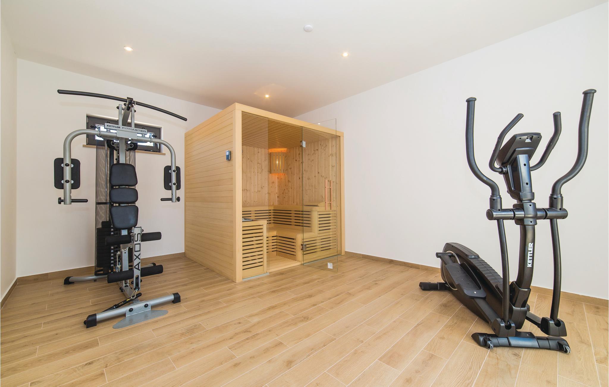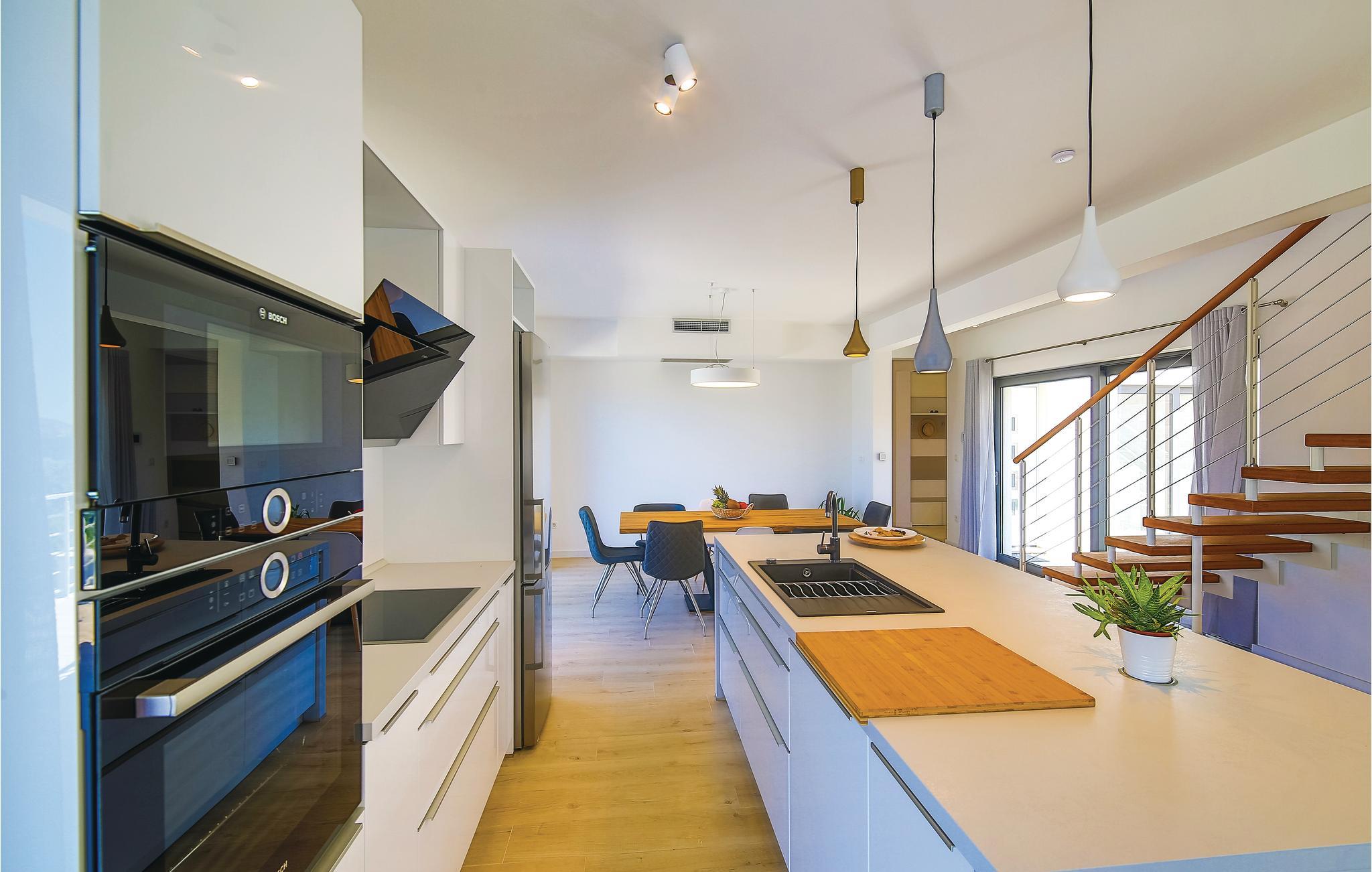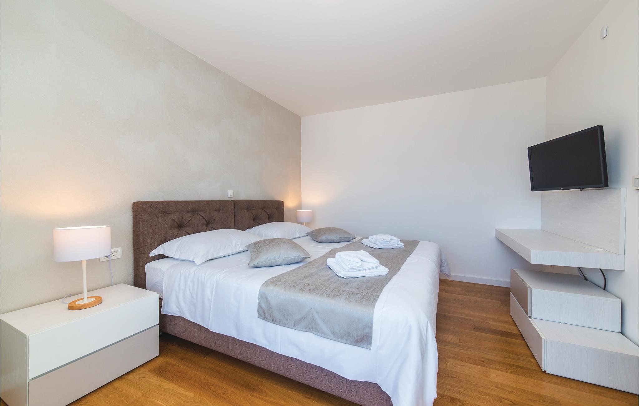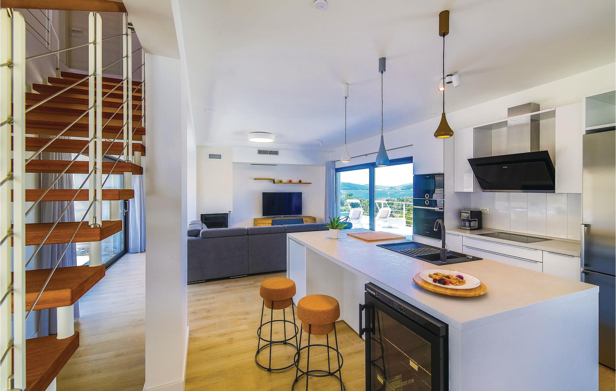 Denne nydelige villaen med basseng ligger i den lille landsbyen Trget Vranjica og har alt for å gjøre en ferie til en uforglemmelig opplevelse. De vakre møblene gir deg hygge og komfort. Badstuen og boblebadet inviterer deg til å tilbringe hyggelige timer med å slappe av, treningsrommet gir sportslig variasjon og det oppvarmede bassenget gir forfriskning selv på kjøligere dager. Ta turen til den nærliggende stranden og nyt det behagelige klimaet ved Adriaterhavet. Spaser gjennom de romantiske smugene i Trogir og beundre de gotiske, romanske, renessanse- og barokke kunstskattene som du finner mange steder i byen. Av de 4 parkeringsplassene er to dekket og en er i garasjen.