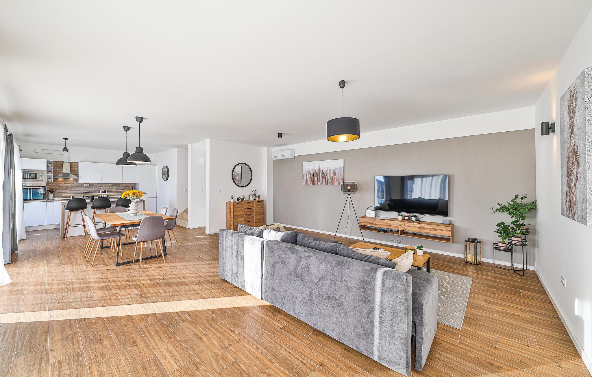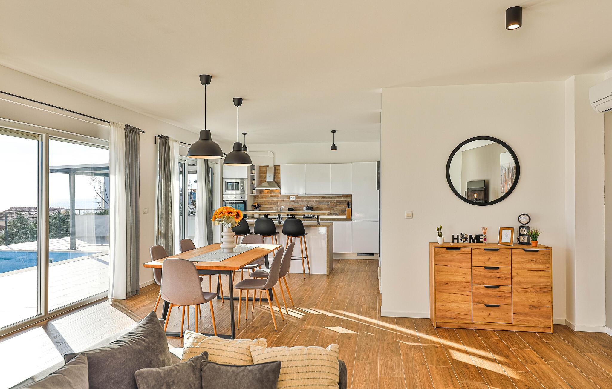 Reis til Trogir-Sevid og tilbring en avslappende ferie i dette lyse og komfortable huset som ikke etterlater noe å savne. Her kan du føle deg hjemme og nyte atmosfæren i den åpne stuen, som strekker seg over hele første etasje og har utgang til terrassen. Ovenpå kan du nyte en god natts søvn på soverommene og våkne sakte om morgenen på balkongene med havutsikt og nyte den første kaffen. Til frokost kan dere samles på den overbygde terrassen eller ta de første svømmeturene i bassenget.