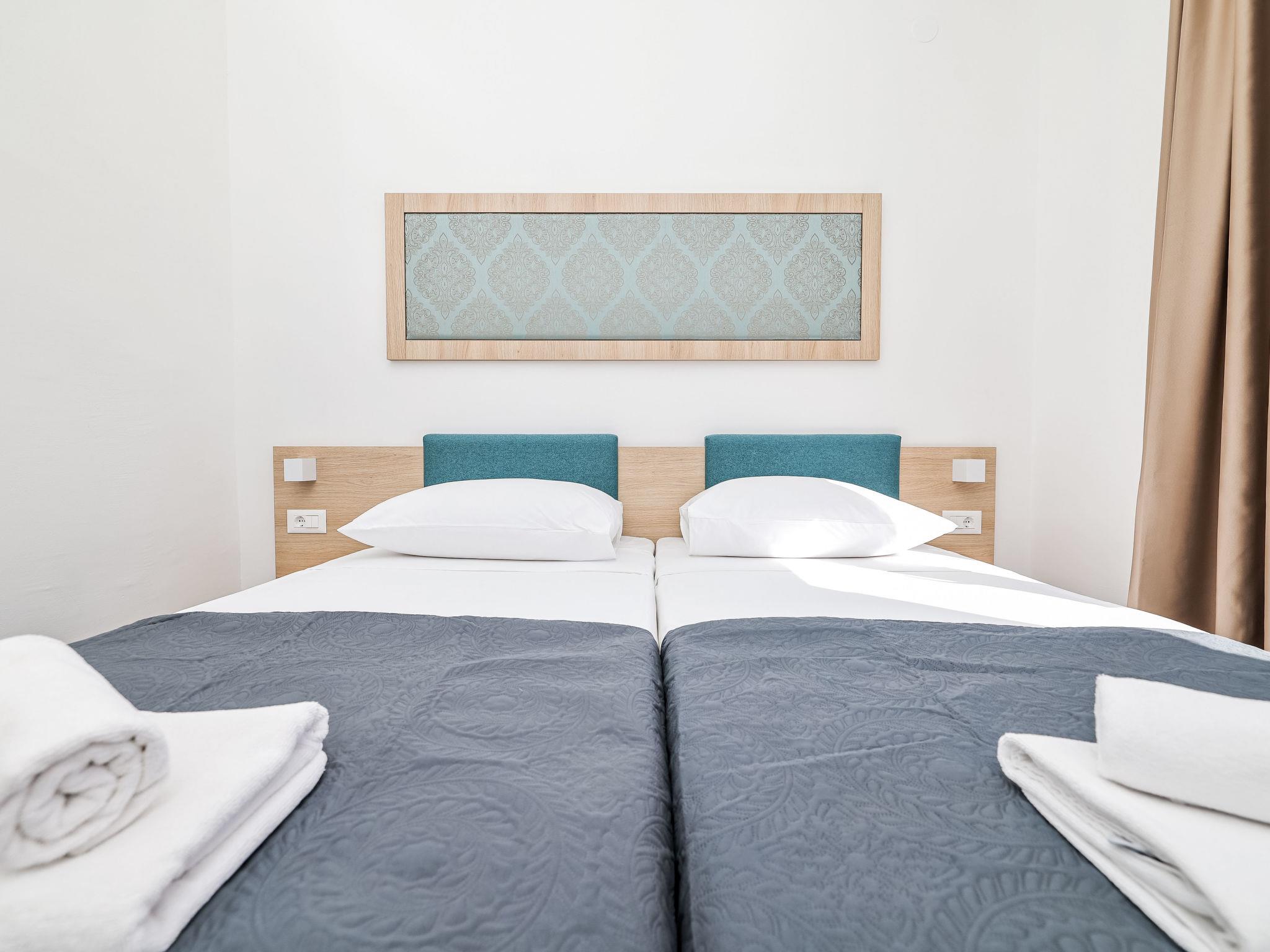 3-room apartment 46 m2 on 1st floor, south facing position. Living/dining room with 1 sofabed (80 cm, length 180 cm), satellite TV (flat screen), air conditioning. Exit to the terrace. 2 rooms, each room with 2 beds (90 cm, length 200 cm). Open kitchen (2 ceramic glass hob hotplates, microwave, electric coffee machine). Shower/WC, sep. WC. No heating option. Terrace 13 m2, roofed. Terrace furniture. Facilities: baby cot (extra). Internet (WiFi, free). Maximum 1 small pet/ dog allowed. The houses are situated 80-140 m from the sea and the beach.