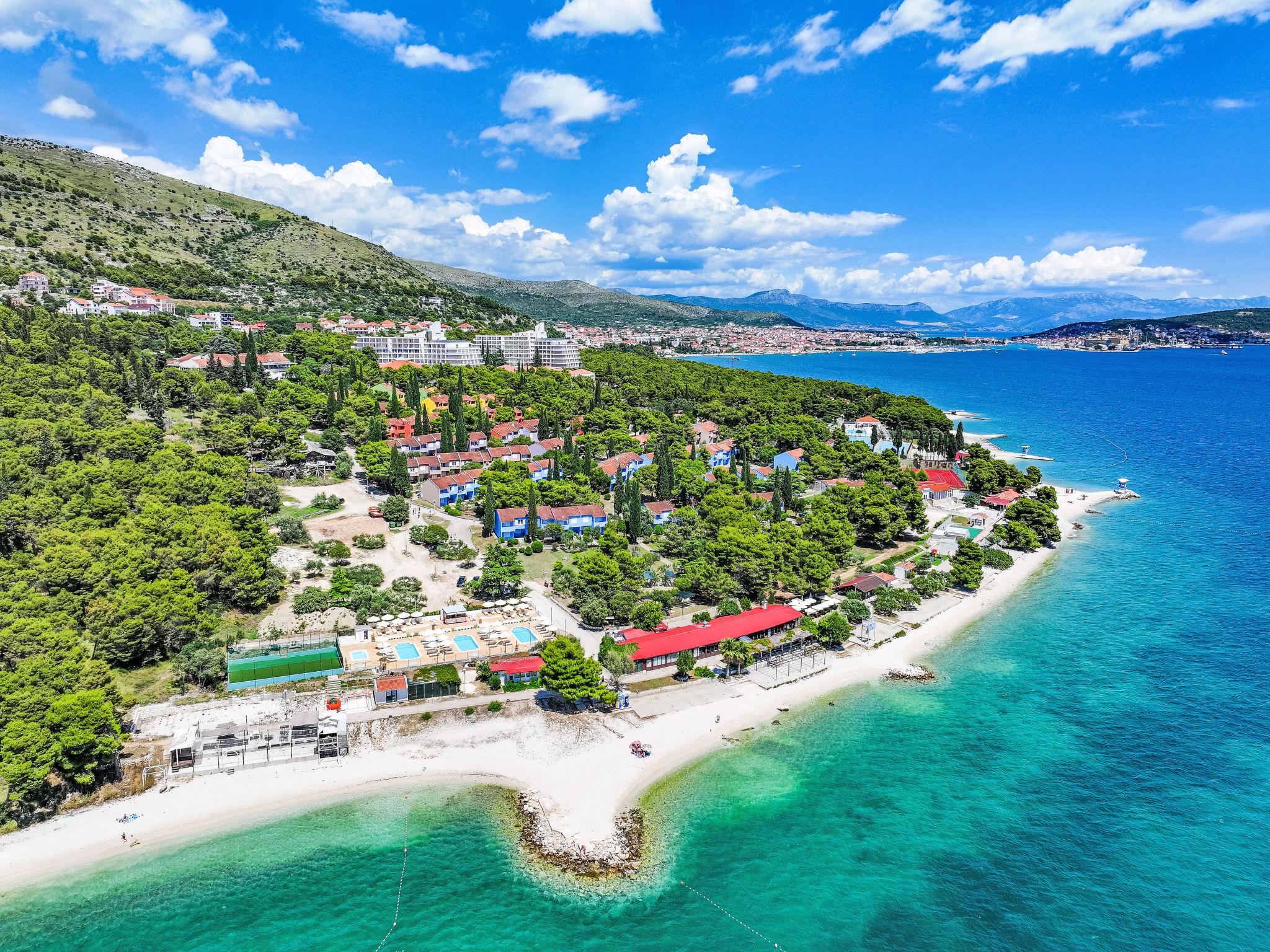 Resort "Medena". In the district of Seget Donji 3 km from the centre of Trogir, 30 km from the centre of Split, at the seaside. For shared use: property with plants and trees, 3 swimming pools (31 m2, depth 140 cm, seasonal availability: 01.Apr. - 01.Nov.) with internal staircase. Children's pool, outdoor shower, tennis (extra), basketball (extra), children's playground. In the complex: reception, restaurant, internet access, laundry. Available: bicycles (extra). Breakfast full board half board possible on request (extra). Airport transfer (extra). Parking (extra) on the premises. Bus stop 650 m. Object suitable for 4 adults + 1 child. Please note: airfield 8 km from the property. The photograph shows a typical example. 1 sofabed in living/dining area is only for 1 child up to 12 years old. For shared use mini golf and cageball court (on request, extra).