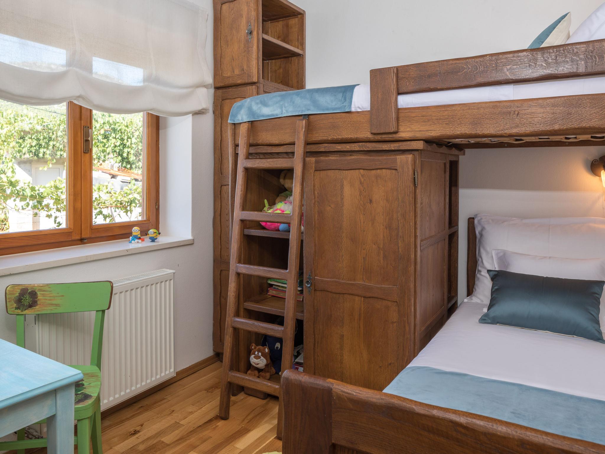 4-room house 134 m2, south facing position. Living/dining room with 1 double sofabed (140 cm, length 200 cm), open-hearth fireplace, cable TV, hi-fi system, DVD and air conditioning. Exit to the terrace. 1 room with 1 double bed (2 x 80 cm, length 200 cm), shower/WC. 1 room with 1 double bed (2 x 80 cm, length 200 cm). 1 children's room with 1 x 2 bunk beds (90 cm, length 200 cm), TV. Open kitchen (4 hot plates, oven, dishwasher, microwave, freezer, electric coffee machine). Shower/WC. Terrace 65 m2, roofed. Terrace furniture, deck chairs. Facilities: safe, iron, children's high chair, baby cot, hair dryer. Internet (WiFi, free). Parking (fenced).
