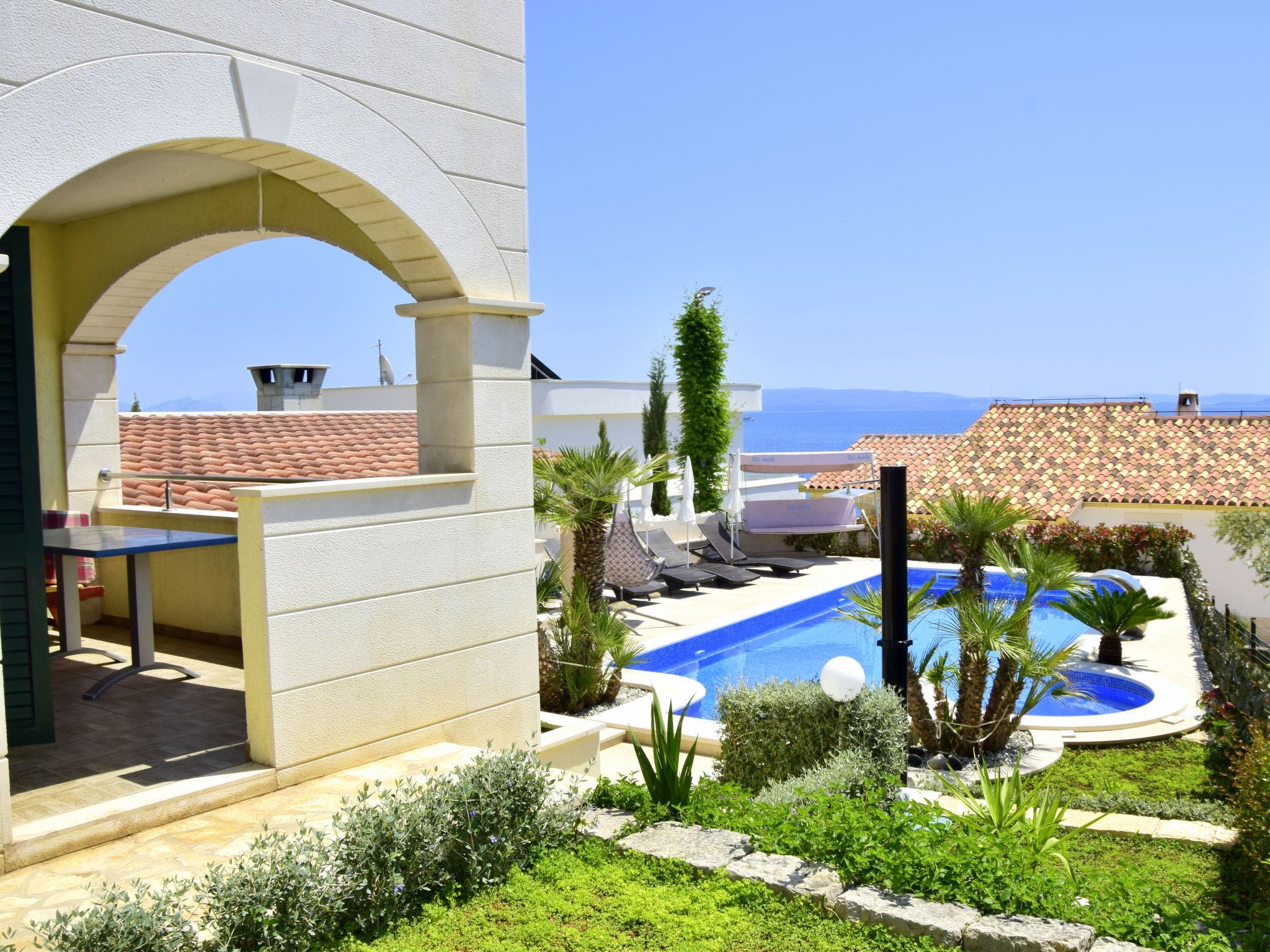 Okrug Gornji (Ciovo), 6 km from Trogir: Beautiful apartment house "Villa Andjelka". 1 km from the centre of Okrug Gornji, in a quiet, sunny, elevated position, 50 m from the sea, 50 m from the beach. For shared use: property, swimming pool heated (38 m2, depth 130 - 160 cm, seasonal availability: 25.Apr. - 03.Oct.) with internal staircase. WC in the pool area, outdoor shower, poolhouse with fridge, terrace, garden furniture, barbecue. In the house: internet access, sauna (extra). Washing machine, tumble dryer. Towel change 2 times per week. Parking at the house on the premises. E-charging station. Shop 200 m, restaurant 1 km, café 1 km, bus stop 1.7 km, pebble beach 500 m, rocky beach 50 m. Please note: Additional accommodations can be booked. Swimming pool with counterflow, geysir and hydromassage. For shared use: outdoor kitchen (fridge, ice maker, coffee machine, dishwasher).