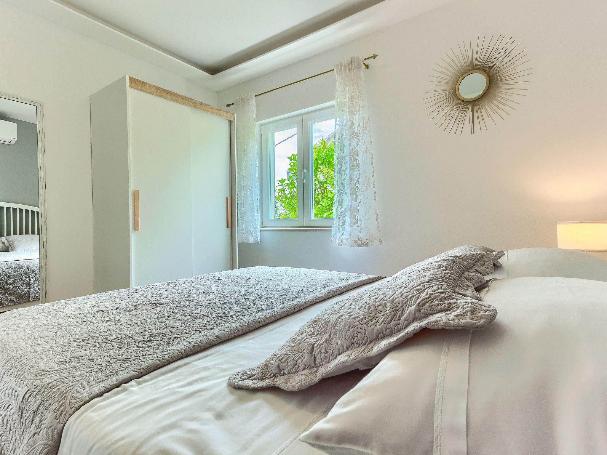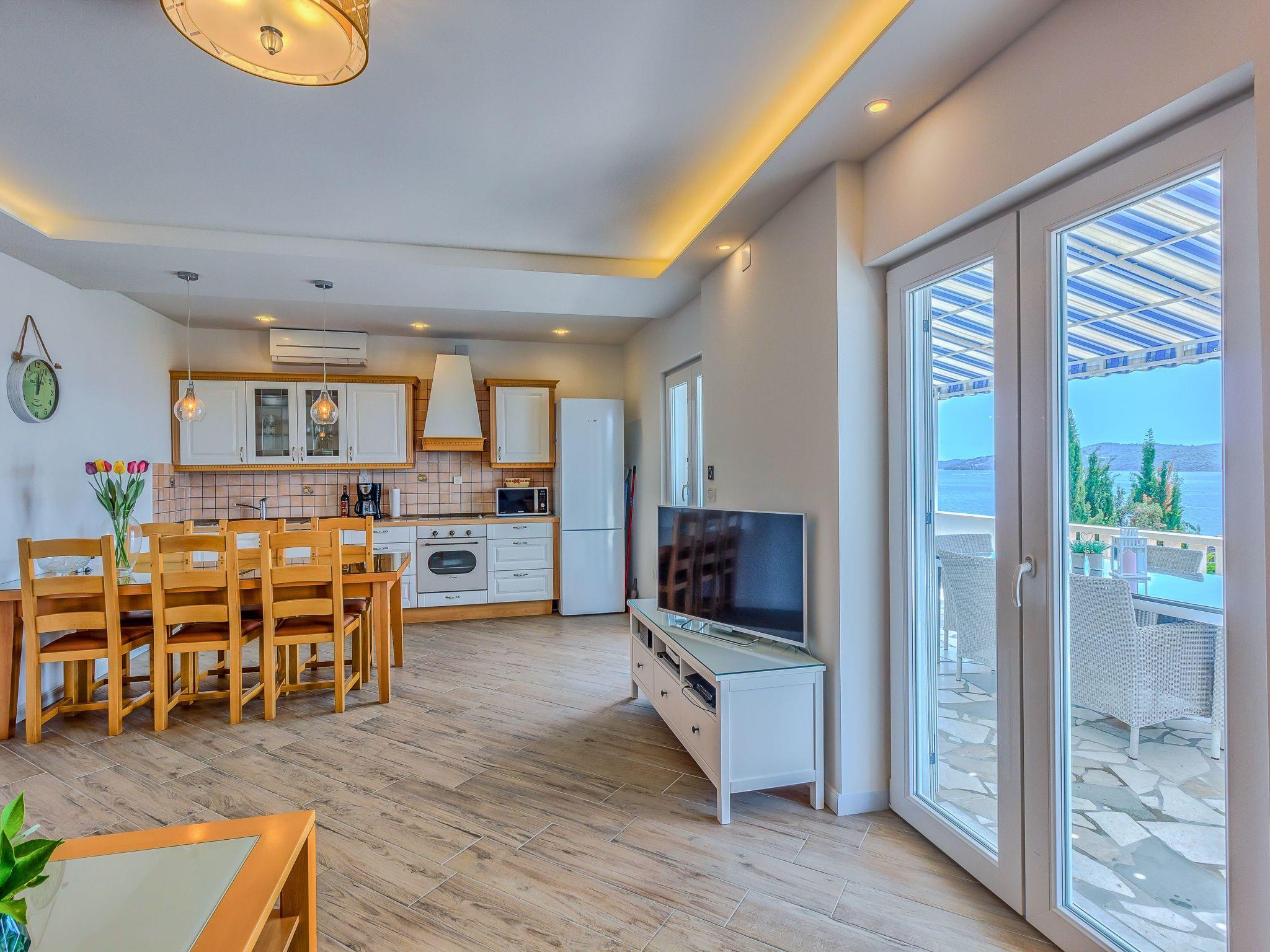 It is just 30 meters from the sea. There are restaurants and shopping facilities within a couple of hundred meters. The town of Trogir is just 5km away and Split 30km.