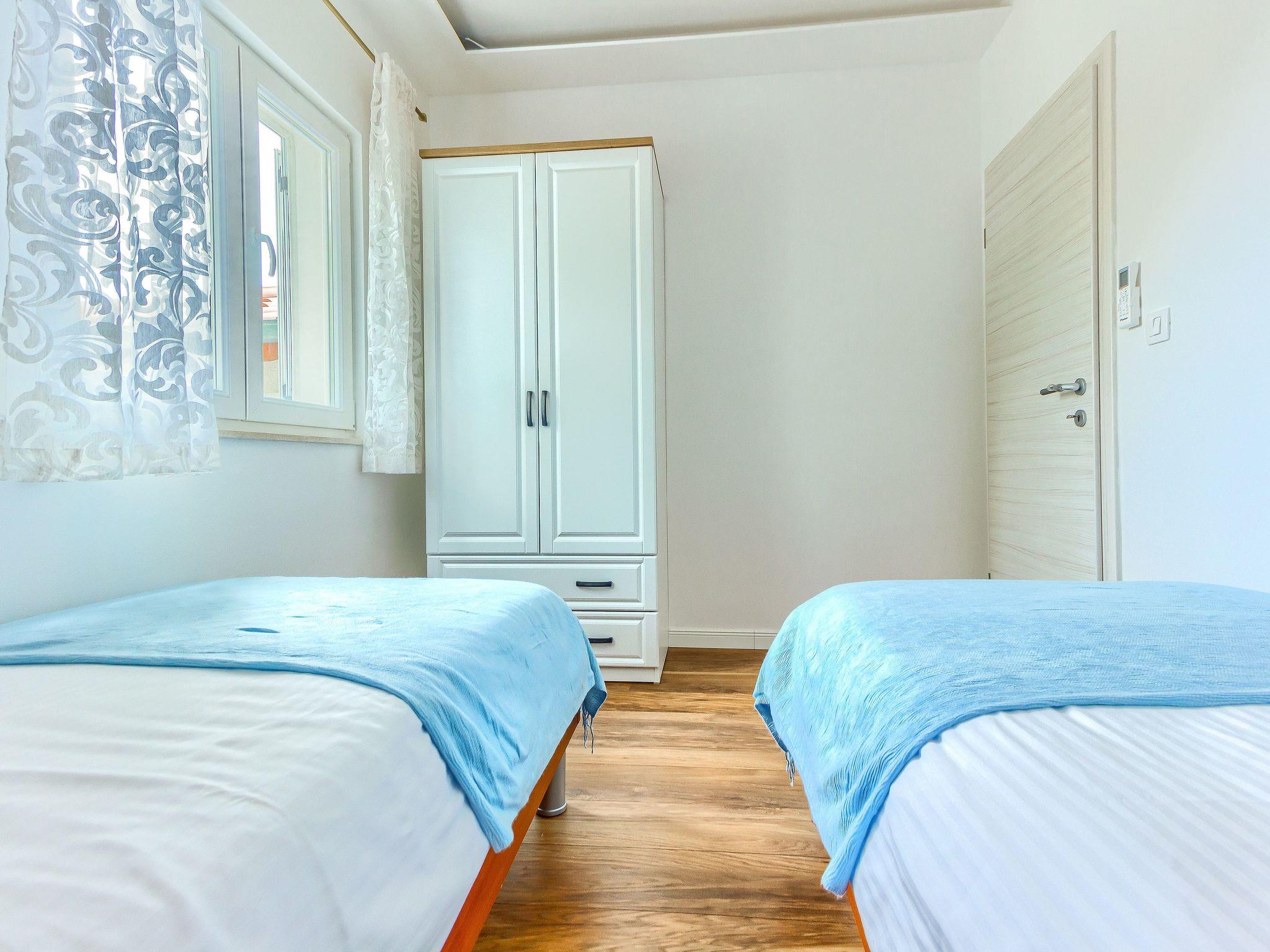 The detached holiday house is suitable for up to eight people and faces the sea towards the south. It has three bedrooms with two double beds and two single beds. The living room and the bedrooms have separate air conditioning units. In total there are four air conditioning units. The kitchen is fully-equipped with a stove, oven, fridge-freezer, microwave, kettle, toaster, coffee machine and dishwasher, as well as a big dining table with chairs. The living room has a sofa bed for two people and satellite TV. Wireless Internet access is available. The bathrooms each have a shower, washbasin and toilet. There is also a washing machine.