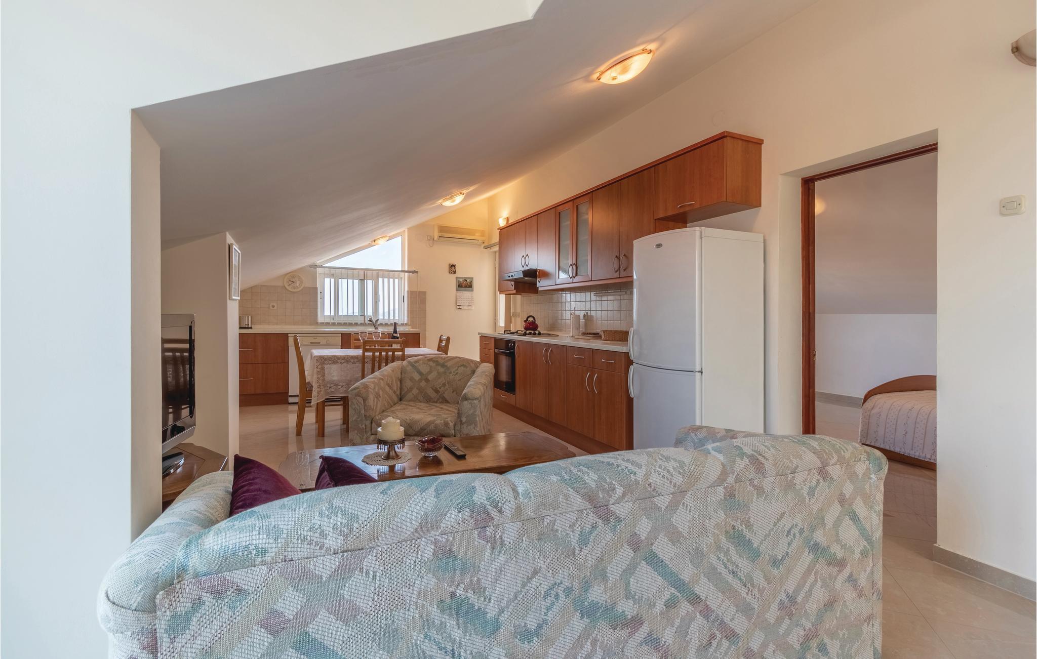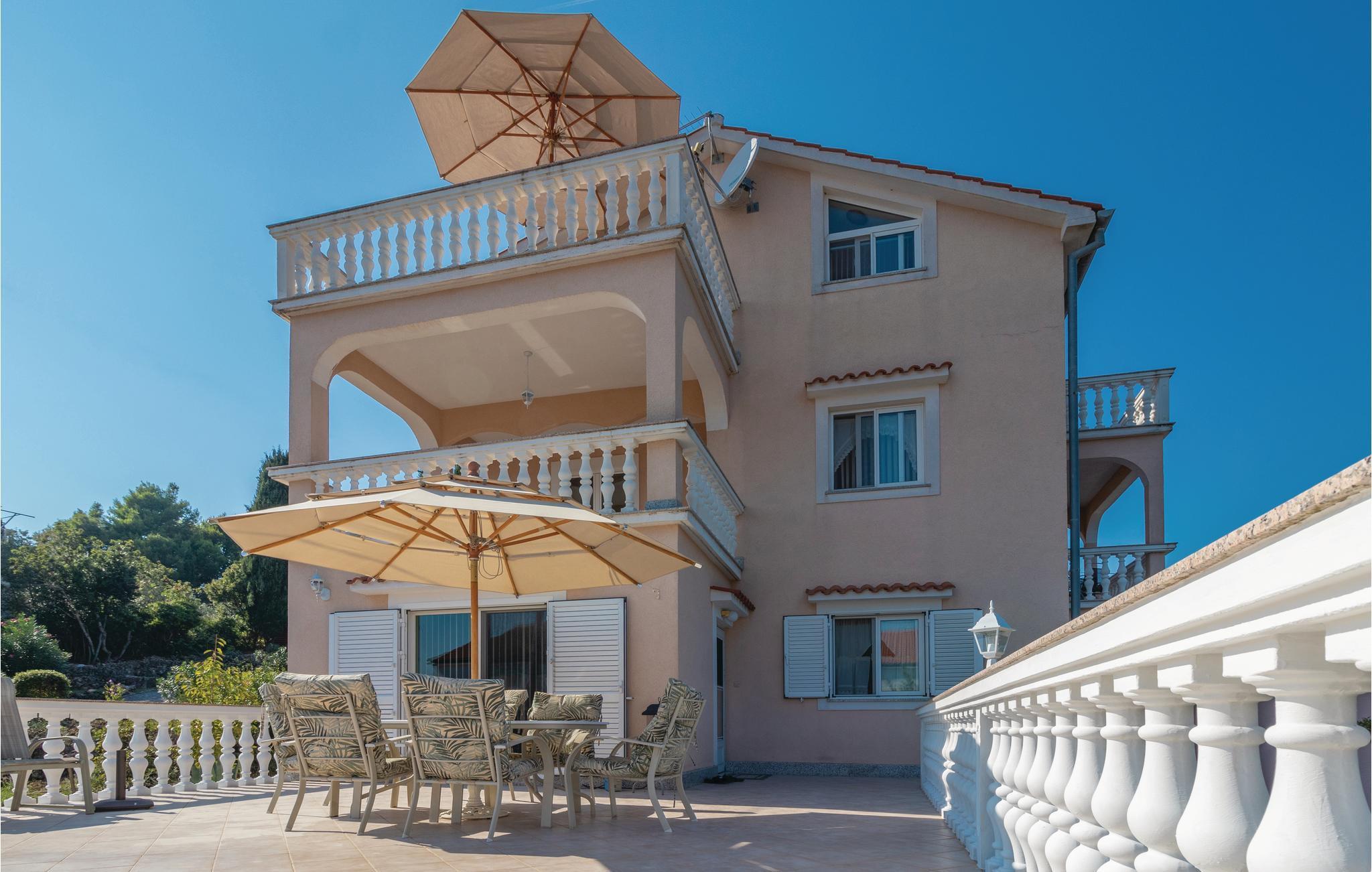 Denne komfortable ferieleiligheten ligger i et familiehus, fordelt på to etasjer og har totalt fire terrasser med utsikt over havet og stranden. Begge etasjene har kjøkken med stue og to soverom. Leilighetene er forbundet med en innvendig trapp, og minste takhøyde er 110 cm i øverste etasje. Det er en grill i hagen. I nærheten ligger sandstranden Jaz, som er ideell for barnefamilier. Preko er sentrum av øya Ugljan, som er lett tilgjengelig med ferge fra Zadar. Benytt anledningen til å besøke den historiske byen Zadar.