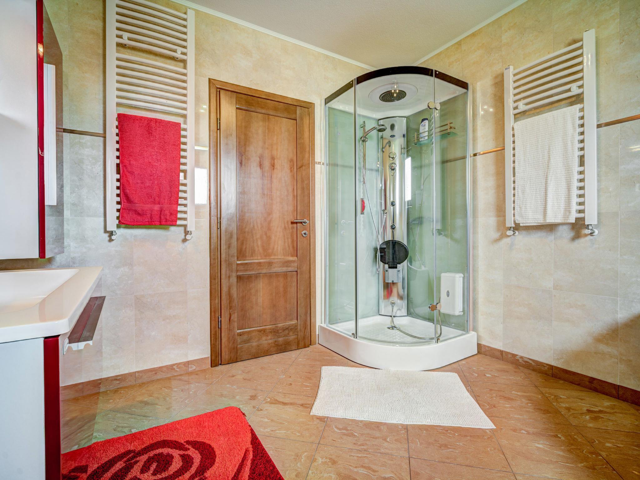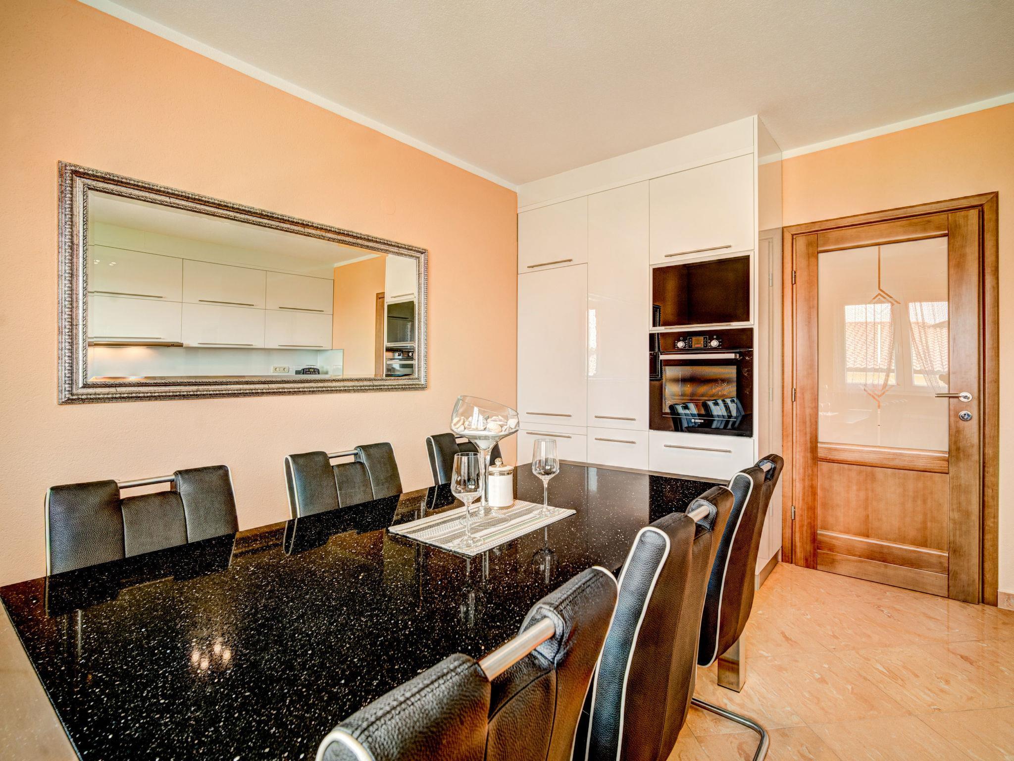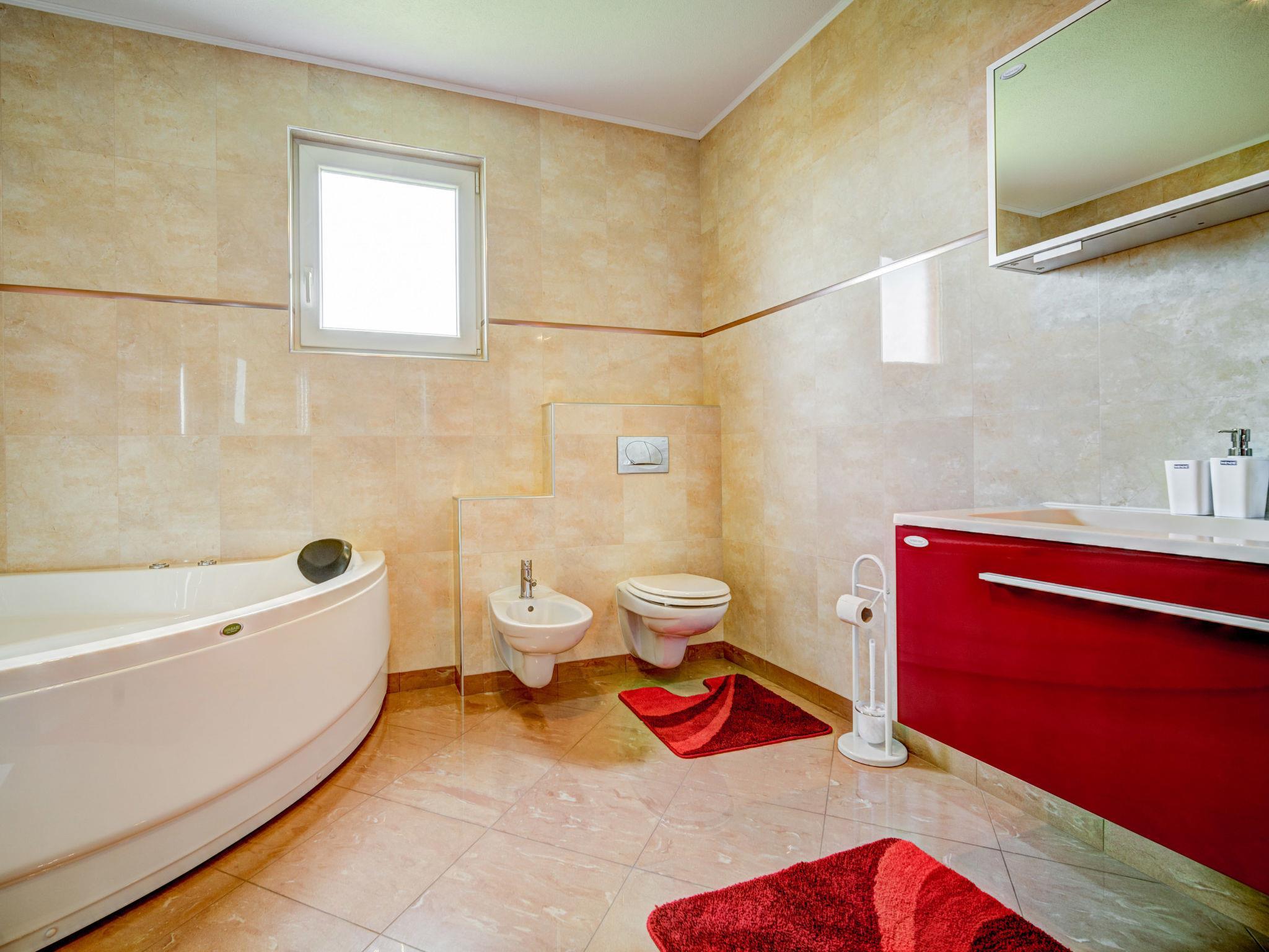3-room apartment 120 m2 on 1st floor. Beautiful and tasteful furnishings: living room with satellite TV (flat screen), air conditioning. Exit to the terrace. 1 room with 1 double bed (2 x 90 cm, length 200 cm). Exit to the terrace. 1 room with 1 french bed (160 cm, length 200 cm). Exit to the terrace. Dining room. Open kitchen (oven, dishwasher, 4 ceramic glass hob hotplates, microwave, freezer, electric coffee machine). Sep. WC, bath/shower/bidet/WC, hydro massage bath. Heating (extra). 2 terraces 16 m2, covered, 2 terraces 5 m2 partly roofed. Terrace furniture. Partial distant view of the sea. Facilities: Internet (WiFi, free). Please note: fire extinguisher.
