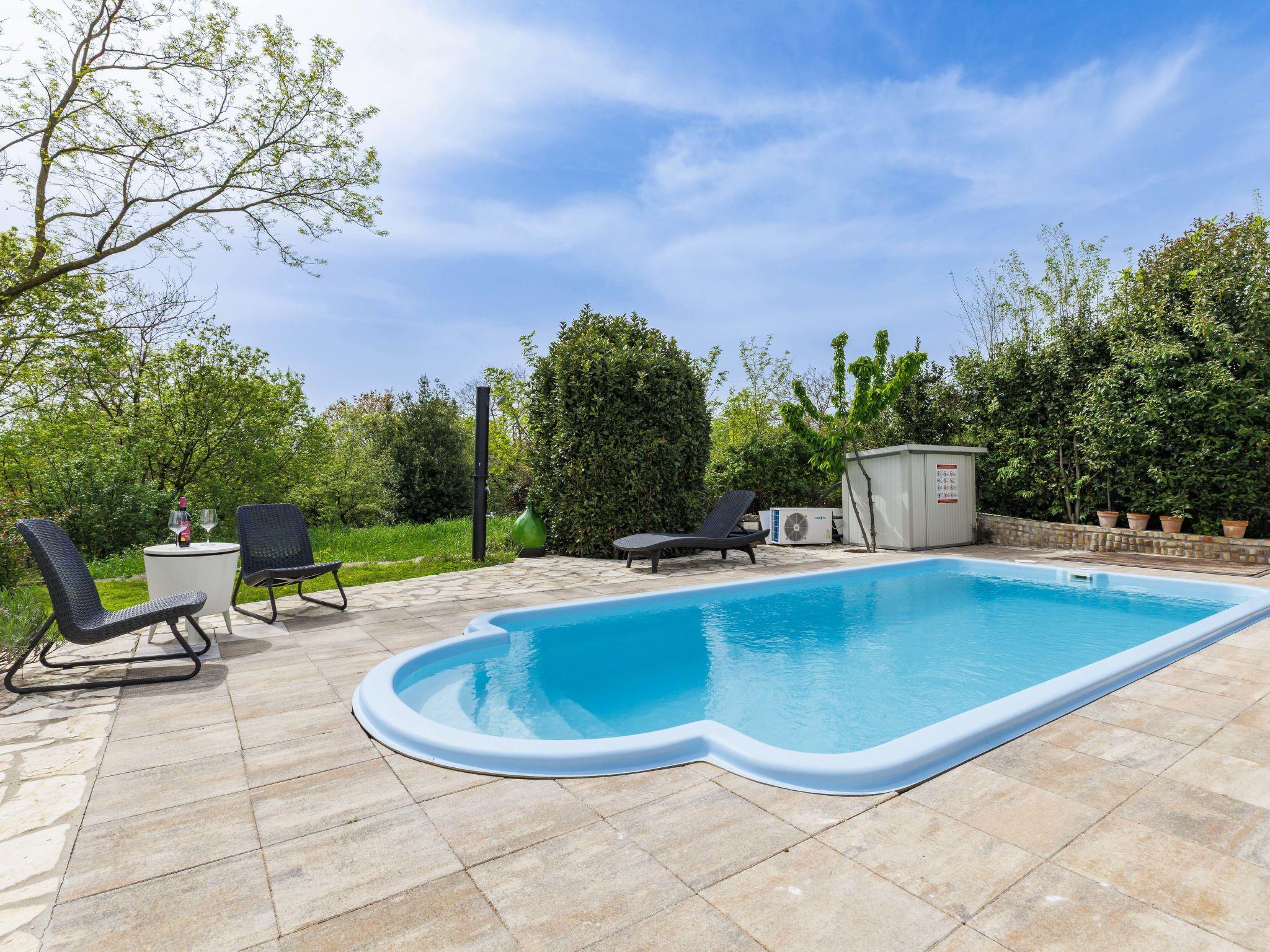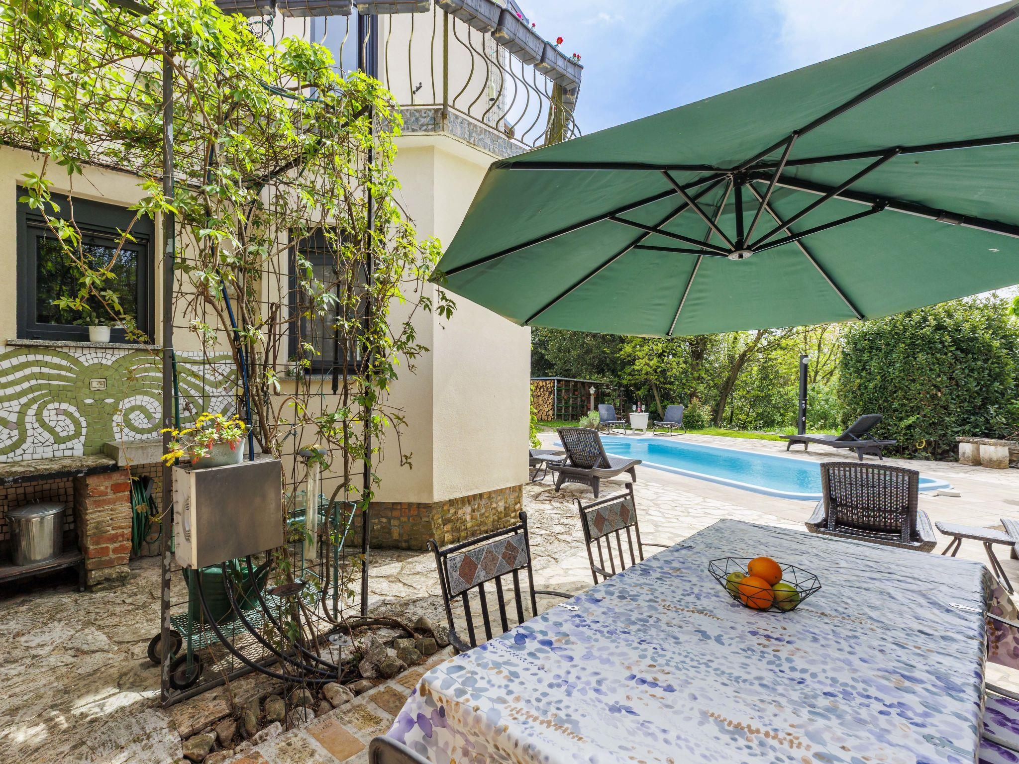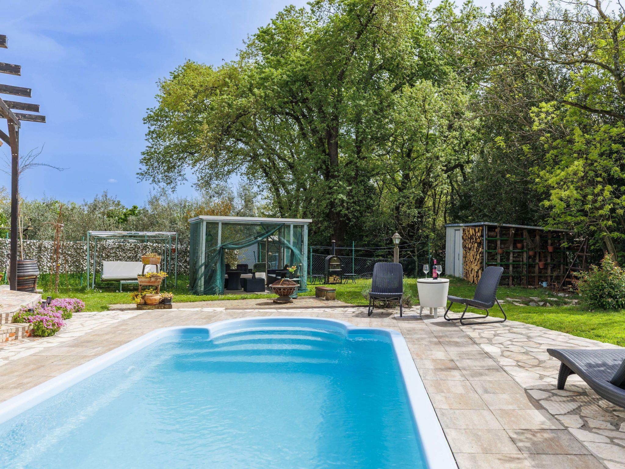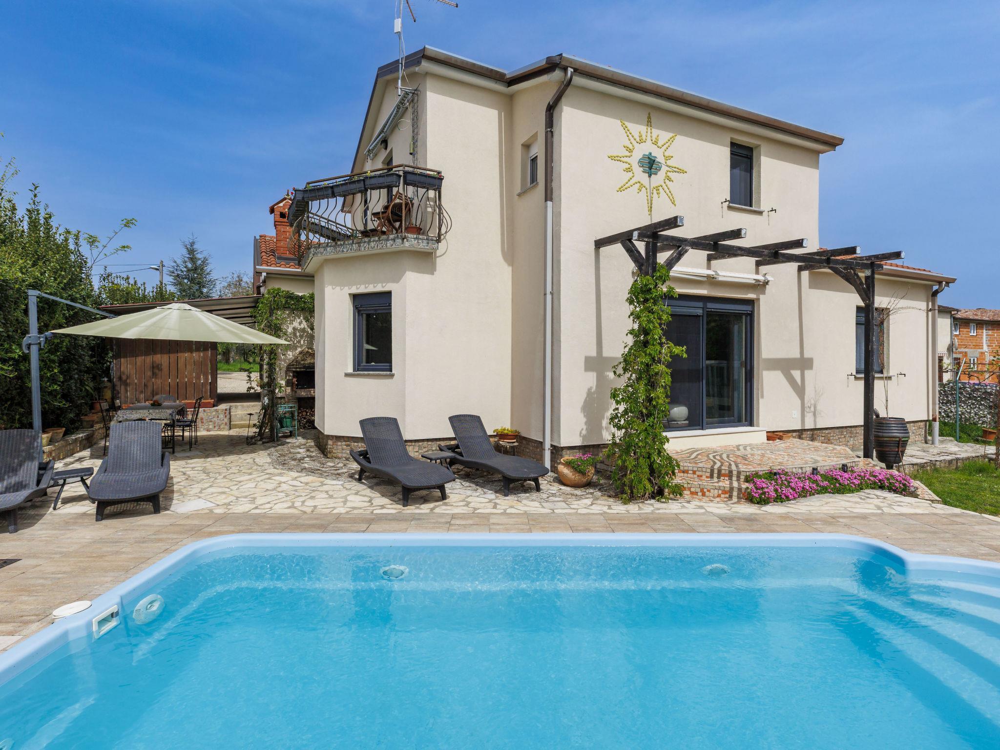 Beautiful house "Acquila", 2 storeys in 2025, surrounded by trees. In the hamlet Lokvini 4.5 km from the centre of Umag, in a quiet position, 4.5 km from the sea, 4.5 km from the beach. Private: property 600 m2, garden, swimming pool (24 m2, depth 155 cm, seasonal availability: 01.May. - 15.Oct.) with internal staircase. Outdoor shower, hot tub, terrace (30 m2), garden furniture, barbecue, pool maintenance by the owner/gardener. In the house: internet access. Parking (for 2 cars) at the house on the premises. Shop 4 km, supermarket 4 km, restaurant 1 km, bus stop 4.5 km, railway station 27 km, pebble beach 4.5 km. Golf course (18 hole) 9.5 km, tennis 4.5 km, cycle lane 50 m. Nearby attractions: Aquapark 15 km. The owner does not accept any groups. The owner does not accept any youth groups.