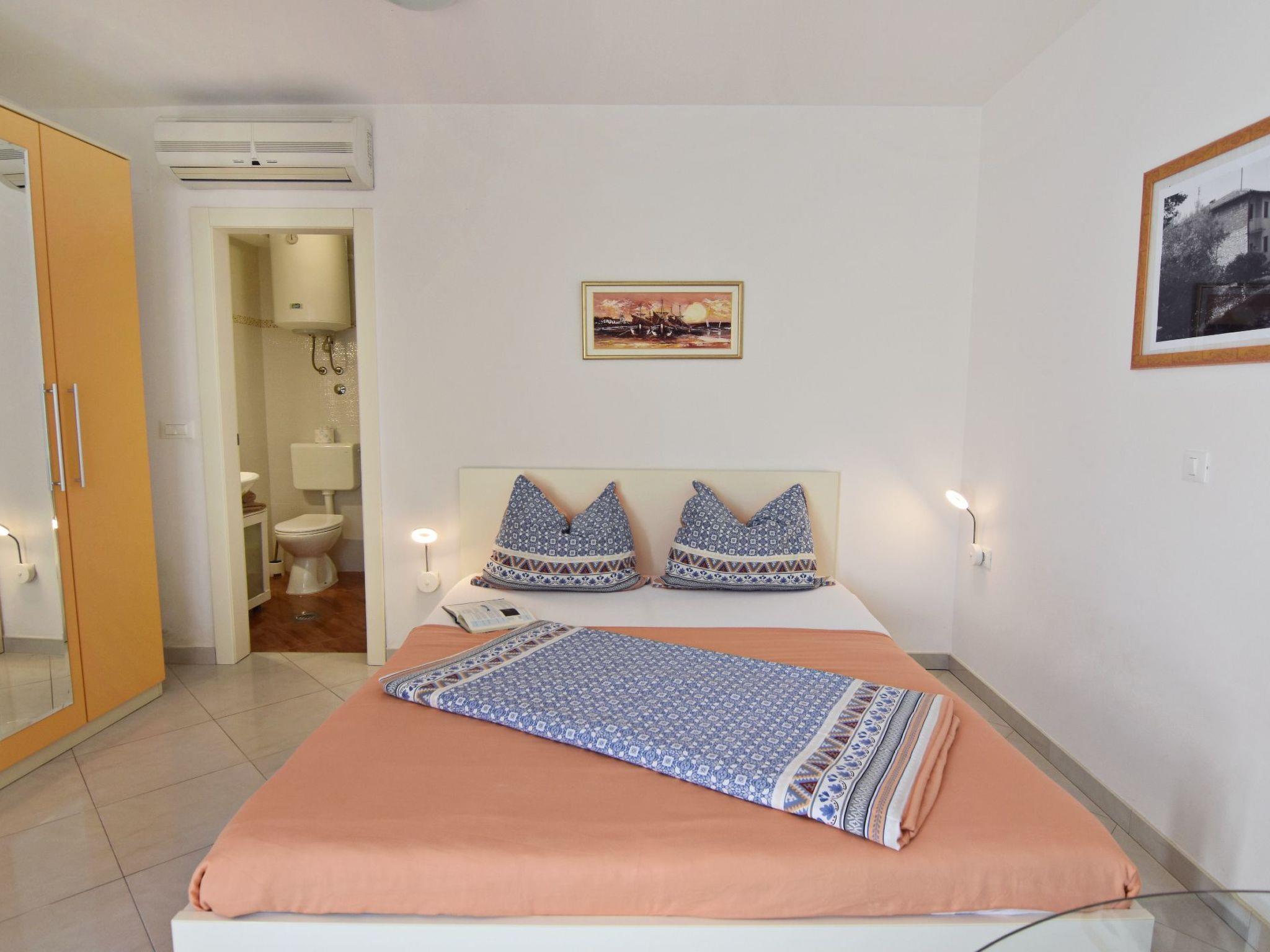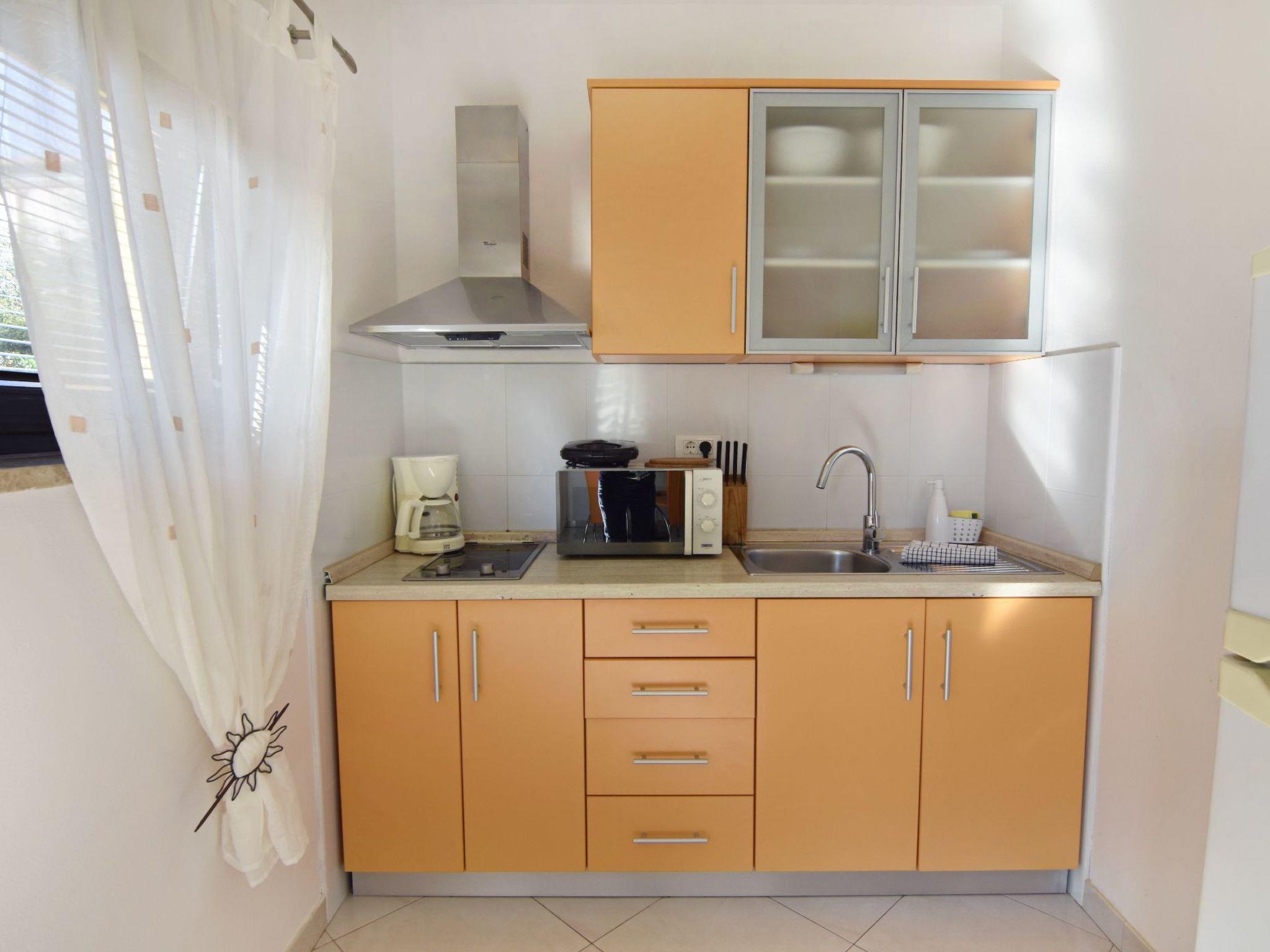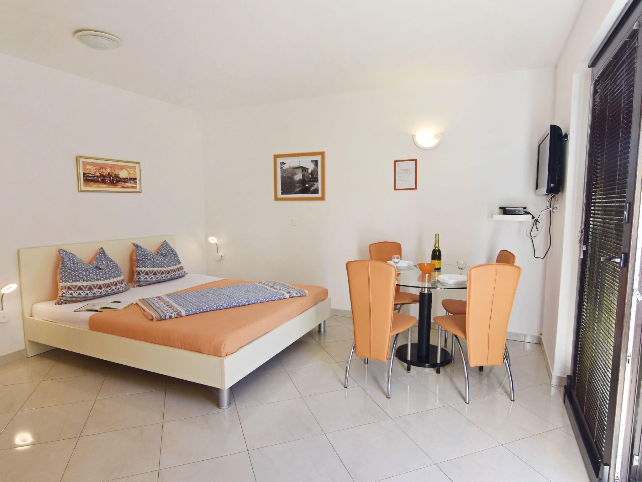 In Villa Alpa you will find the modern and lovingly designed interior of our studio flat Alpa 3 on the ground floor. Equipped with a comfortable double bed, a fully functional kitchenette with microwave, fridge and electric cooker as well as a stylish bathroom, the flat is an oasis of peace. For your comfort, the bed linen is changed weekly and the living area offers amenities such as a flat-screen satellite TV, air conditioning and free Wi-Fi. A door leads from the living area to the private terrace overlooking the green garden.