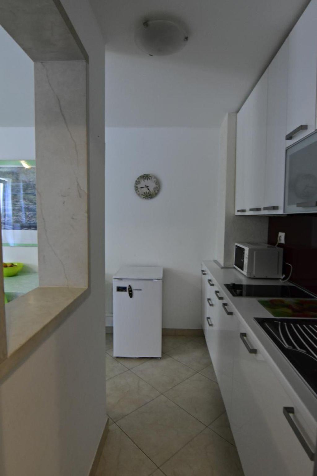 The flat has a bedroom with double bed (160x 200cm), 2 bedside tables with bedside lamps, wardrobe, bed linen available (weekly change), bathroom with shower, WC, washbasin and mirror, two bath towels per person available (weekly change). The kitchen is equipped with fridge, coffee machine, kettle, cooker with 2 electric ceramic hobs. The living area with sofa bed for two persons, dining table with 4 chairs, air conditioning, flat screen satellite TV, free WLAN internet connection. From the living area exit to the large open terrace with sofa and garden armchairs with coffee table and dining table with chairs. Free public car park near the house.