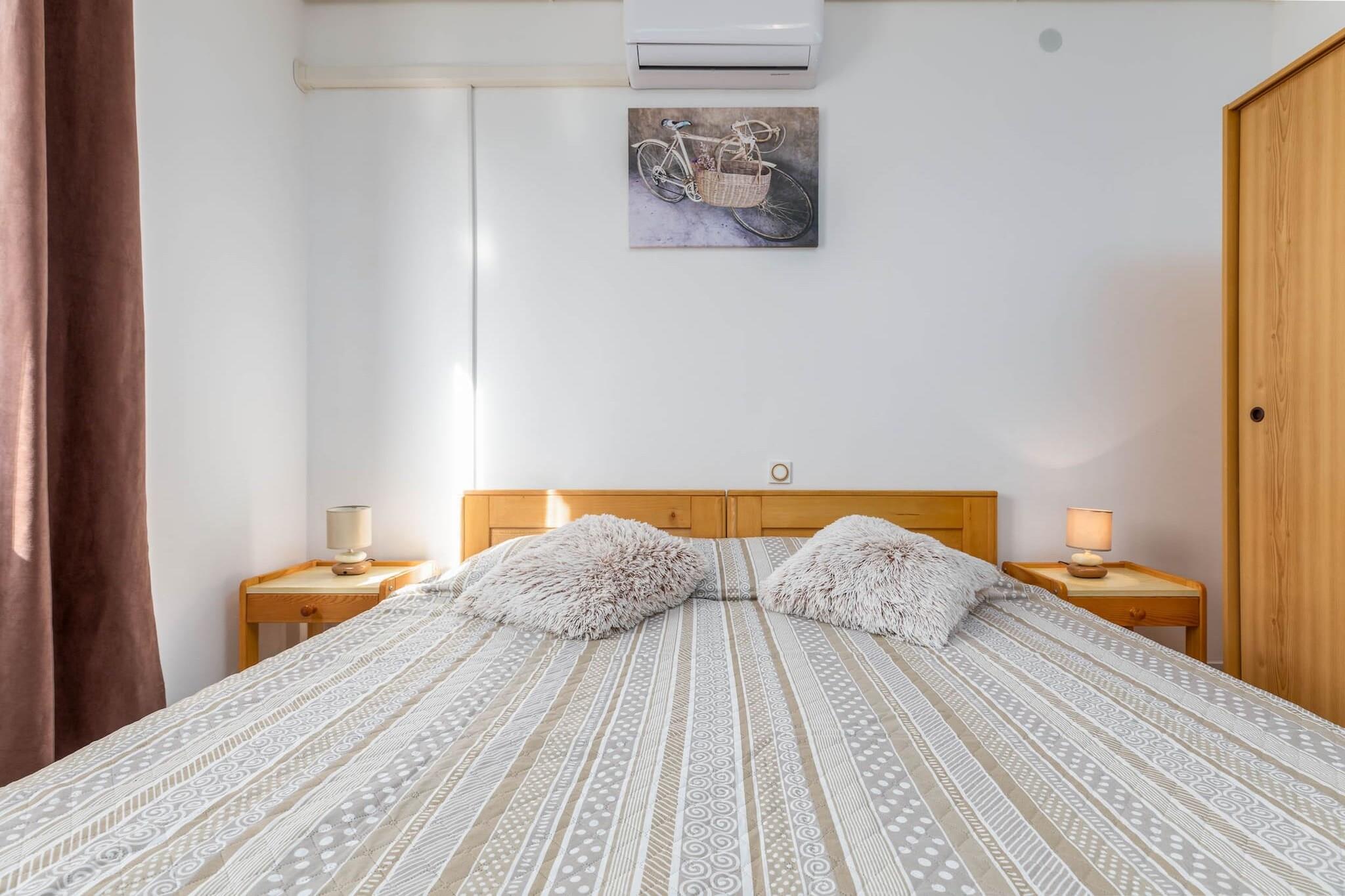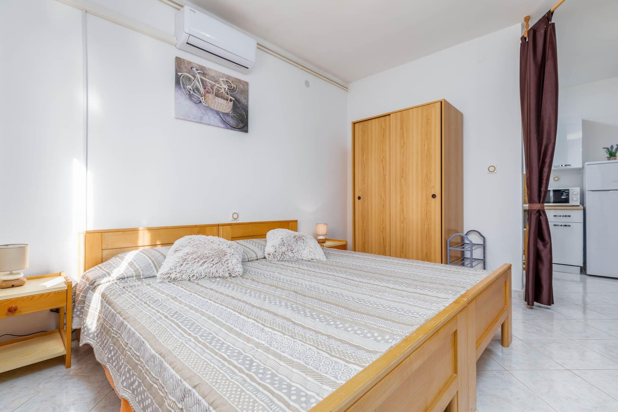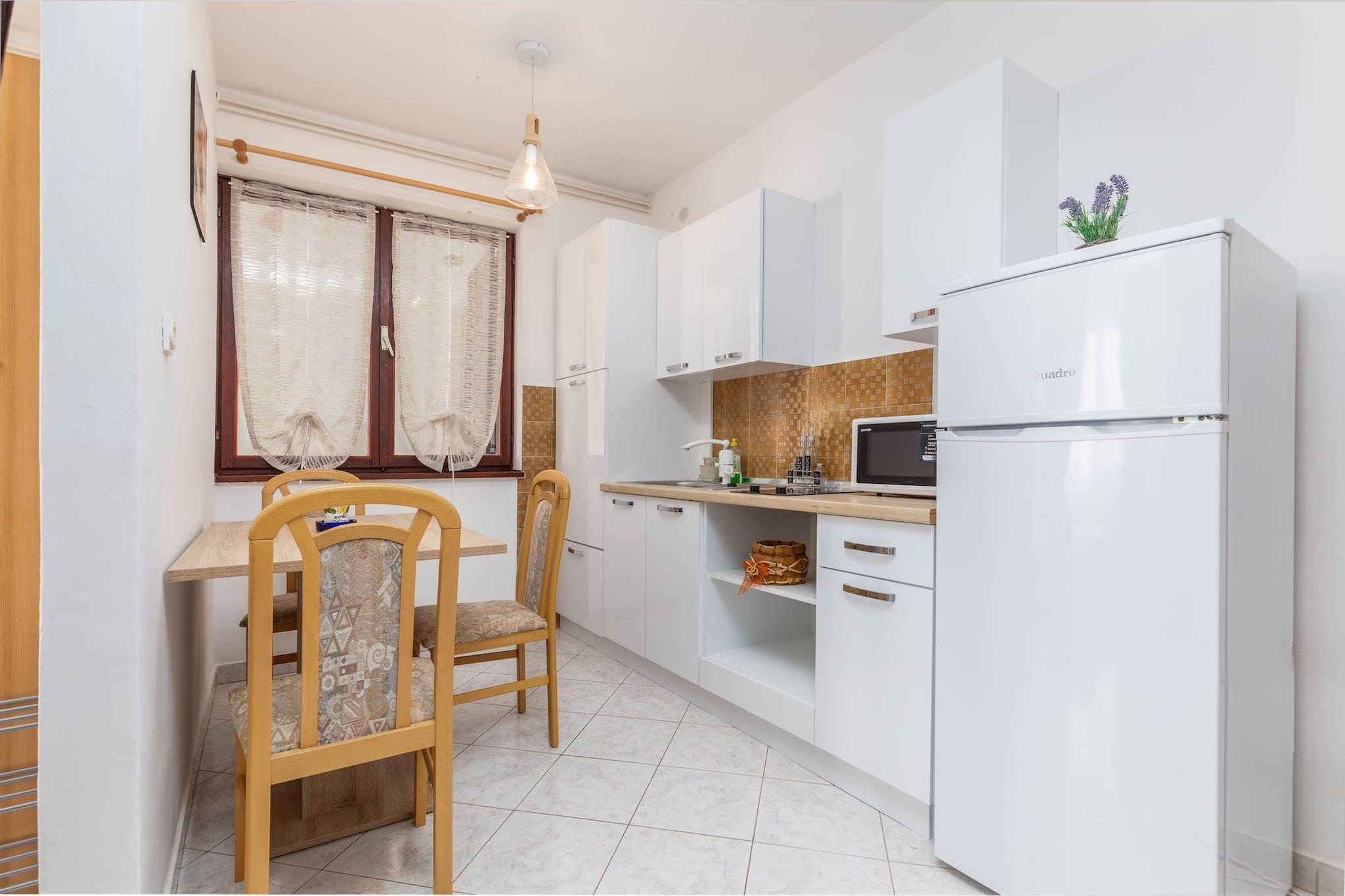 Eiendommen, sammen med sin innbydende og fredelige atmosfære, tilbyr en koselig studioleilighet perfekt for par eller små familier. Ettromsleiligheten har en ekstra stor dobbeltseng og en enkel sovesofa, med plass til opptil tre personer. Gjestene kan nyte en avslappende tid på den private terrassen, møblert for utendørs bespisning eller bare slikke frisk luft. Dette feriehuset er kjæledyrfritt, og det tilbyr tilleggsfasiliteter som gratis Wi-Fi, klimaanlegg og parkering på stedet. Gjestene kan oppbevare sykler i garasjen og få tilgang til vaskeritjenester for ekstra bekvemmelighet. Eiendommen ligger i den rolige byen Valbandon, innenfor Fažana kommune, og tilbyr enkel tilgang til nærliggende attraksjoner og fasiliteter. Den nærmeste restauranten, Jedro, ligger bare 50 meter unna, mens en dagligvarebutikk ligger 500 meter fra eiendommen. Valbandon-stranden ligger bare 800 meter unna, perfekt for en dag ved vannet, og Fažana ligger bare 2 km fra leiligheten. Gjester kan også besøke nasjonalparken Brijuni, tilgjengelig med båt fra Fažana, og tilbyr en uforglemmelig sightseeingopplevelse. Leiligheten har et fullt utstyrt kjøkken og bad, noe som gjør den ideell for selvhusholdning. Stuen med åpen planløsning har en spiseplass hvor du kan nyte hjemmelagde måltider eller grilling. Med sine komfortable fasiliteter, inkludert klimaanlegg og en avslappende utendørsterrasse, er denne leiligheten et perfekt tilfluktssted for de som søker både komfort og bekvemmelighet under oppholdet i den sjarmerende byen Valbandon.