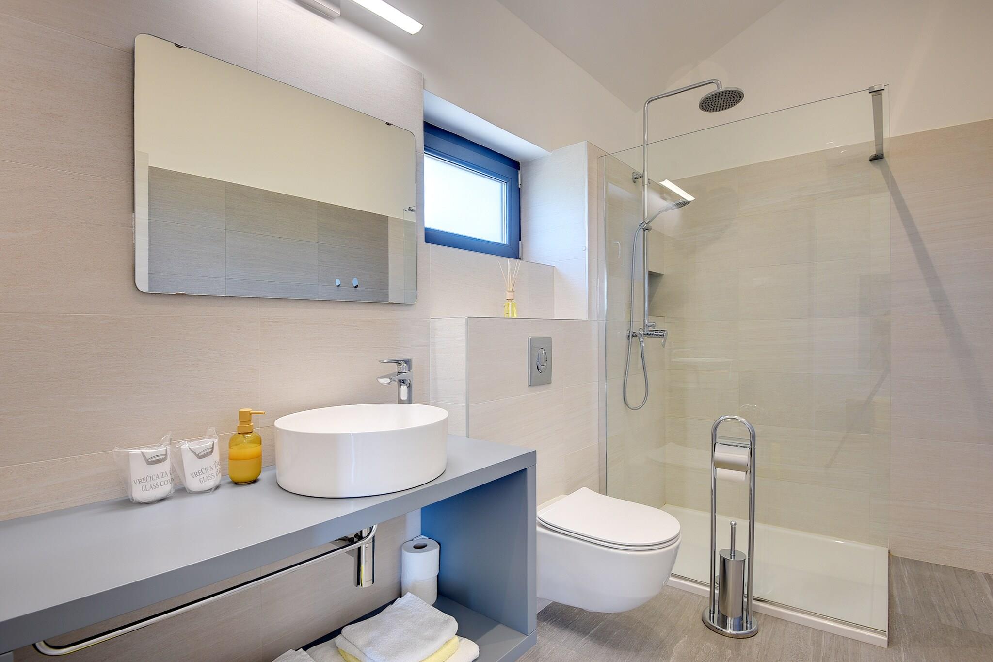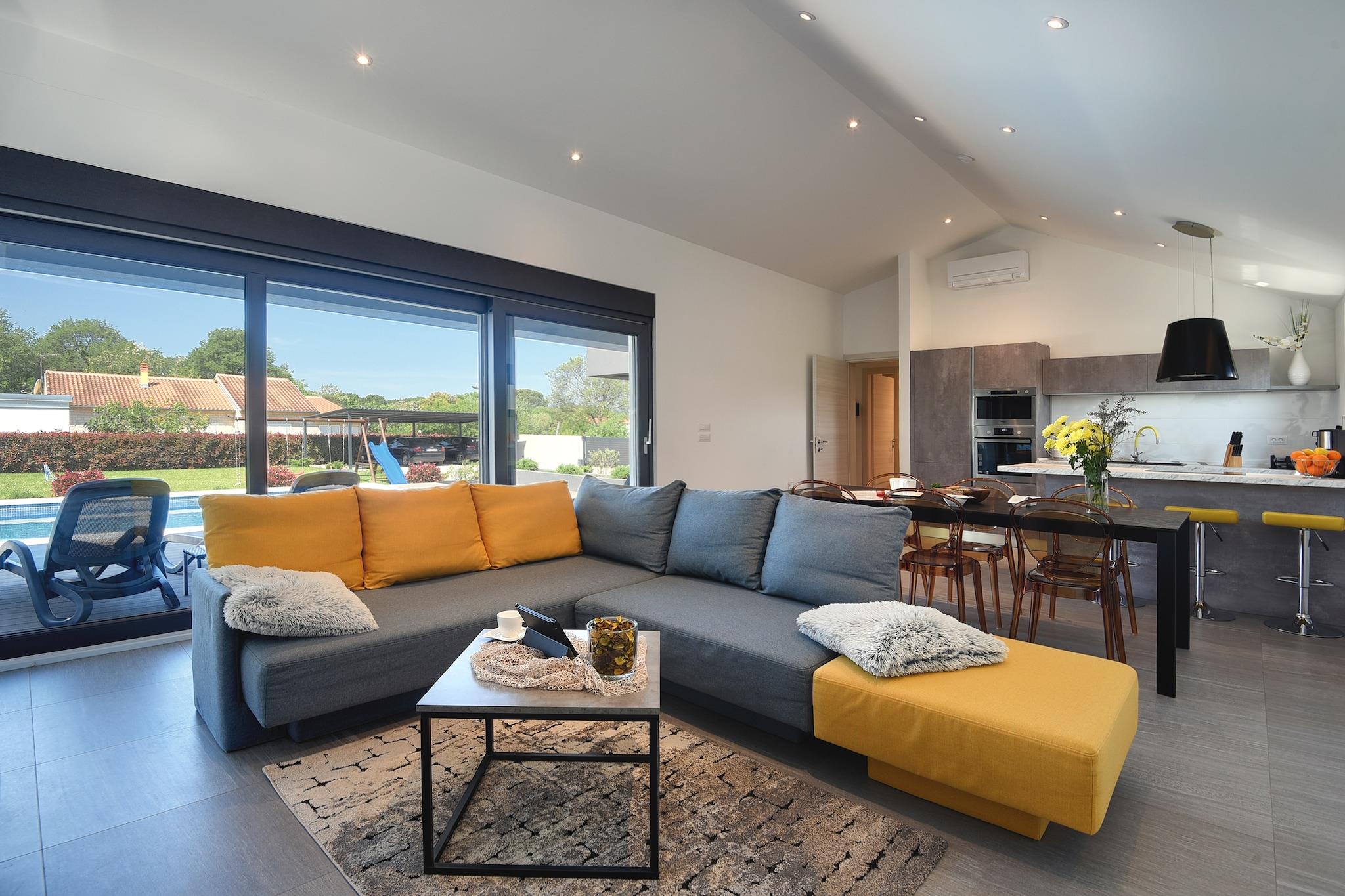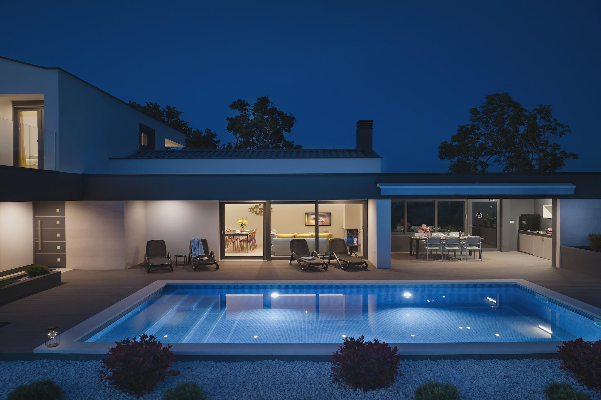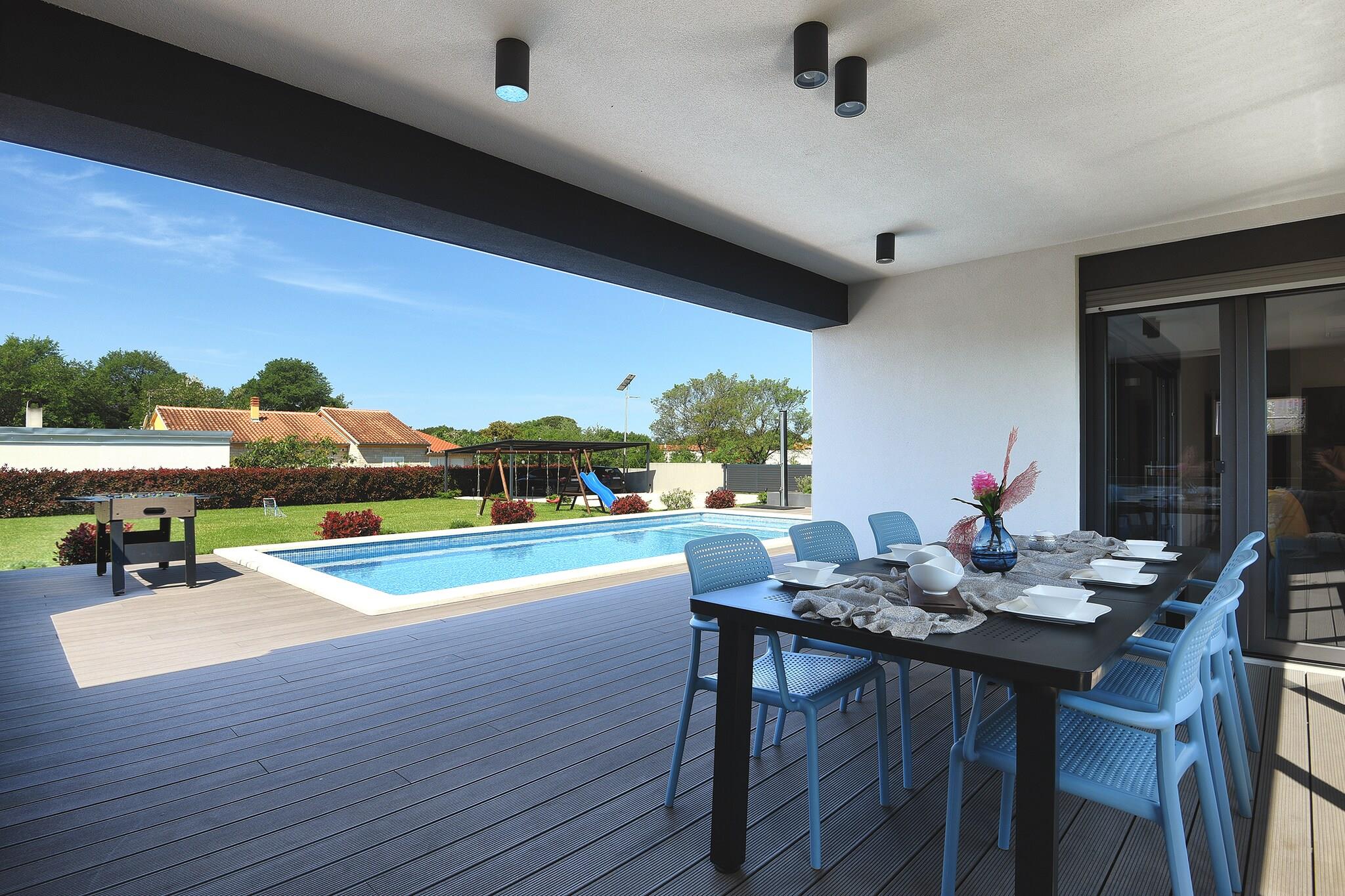 Første etasje: (Stue(dobbel sovesofa, TV(flatskjerm, satellitt), sittehjørne), Kjøkken(spisebord, vannkoker, brødrister, komfyr, kaffetrakter, stekovn, mikrobølgeovn, oppvaskmaskin, kjøleskap med fryser), Sovrum med badrum(dobbeltseng, dusj, håndvask, toalett), WC(håndvask), terrasse(privat, 30 m2)) i 2. etasje: (Sovrum med badrum(dobbeltseng, TV(flatskjerm, satellitt), dusj, håndvask, toalett, balkon, klimaanlegg), Sovrum med badrum(Dobbeltseng eller 2 enkeltsenger, TV(flatskjerm, satellitt), dusj, håndvask, toalett, balkon, klimaanlegg)) dusj(utendørs), vaskemaskin, gårdhave, klimaanlegg, gårdhave(privat, inngjerdet), terrasse(privat), hage(privat), sykkelparkering, hagemøbler, solsenge, grill, parkering, svømmebasseng(privat), lekeområde, bordtennis, fotballmål, Hårtørker, terrassemøbler