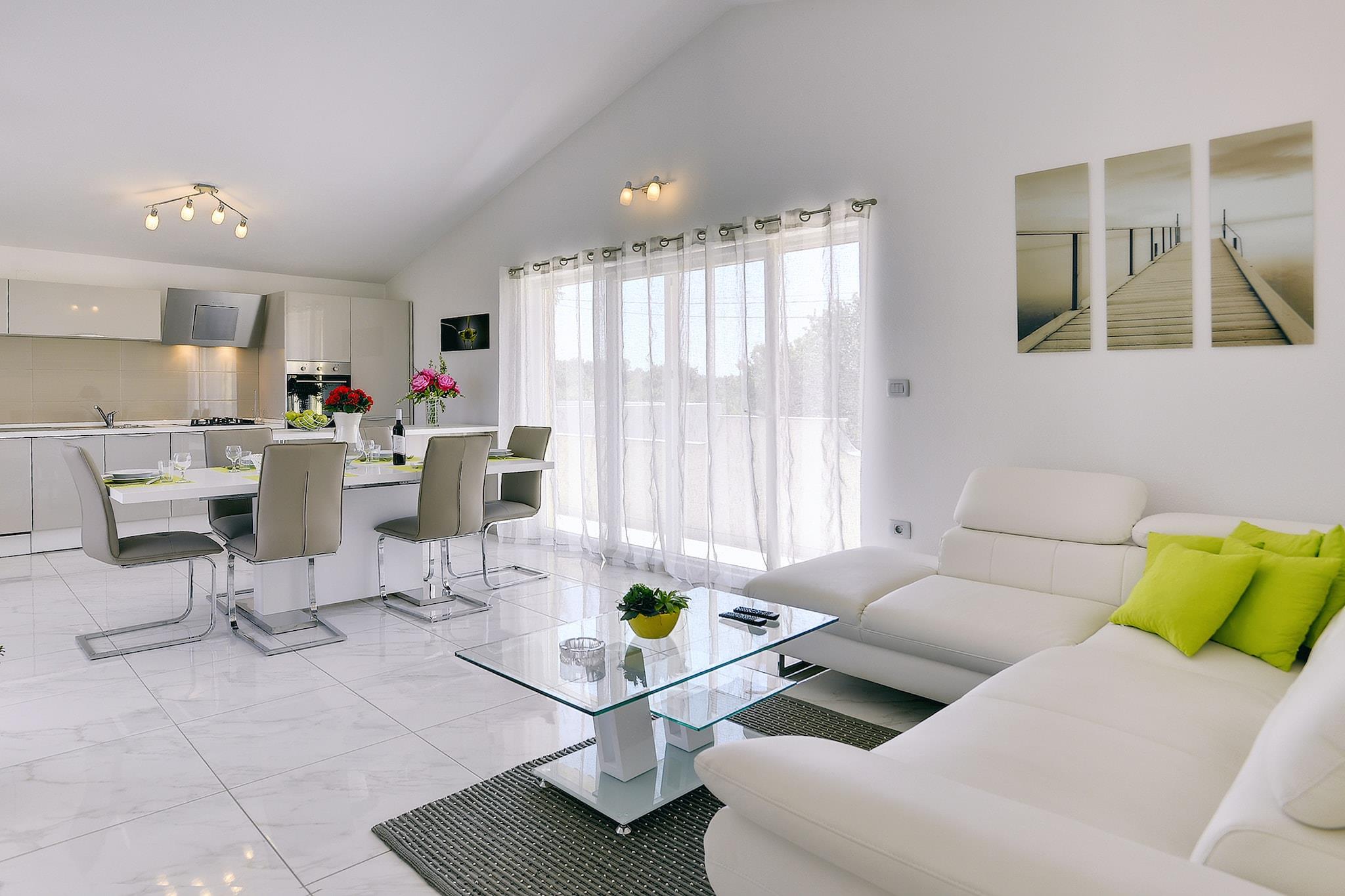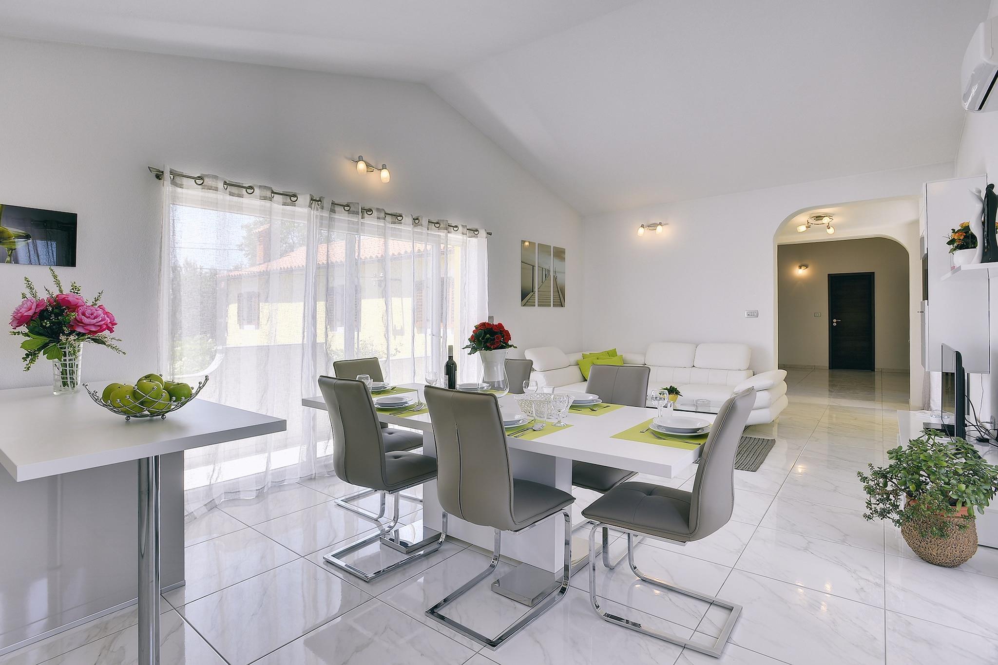 Denne hyggelige ferieleiligheten, omgitt av blomster og oliventrær, ligger i den rolige byen Valtura. Stranden ligger kun 3 km unna, og kulturbyen Pula, med sitt historiske sentrum, ligger 10 km unna. Det er flere monumenter i denne hyggelige byen, inkludert et amfiteater fra romertiden, flotte restauranter og butikker. Martina-leiligheten har et moderne, lyst interiør med nøytrale farger. I første etasje er det en stue med to soverom og et bad. Denne etasjen har også en balkong med fantastisk utsikt over omgivelsene. For de yngste gjestene er det en lekeplass i hagen og en overbygd terrasse.