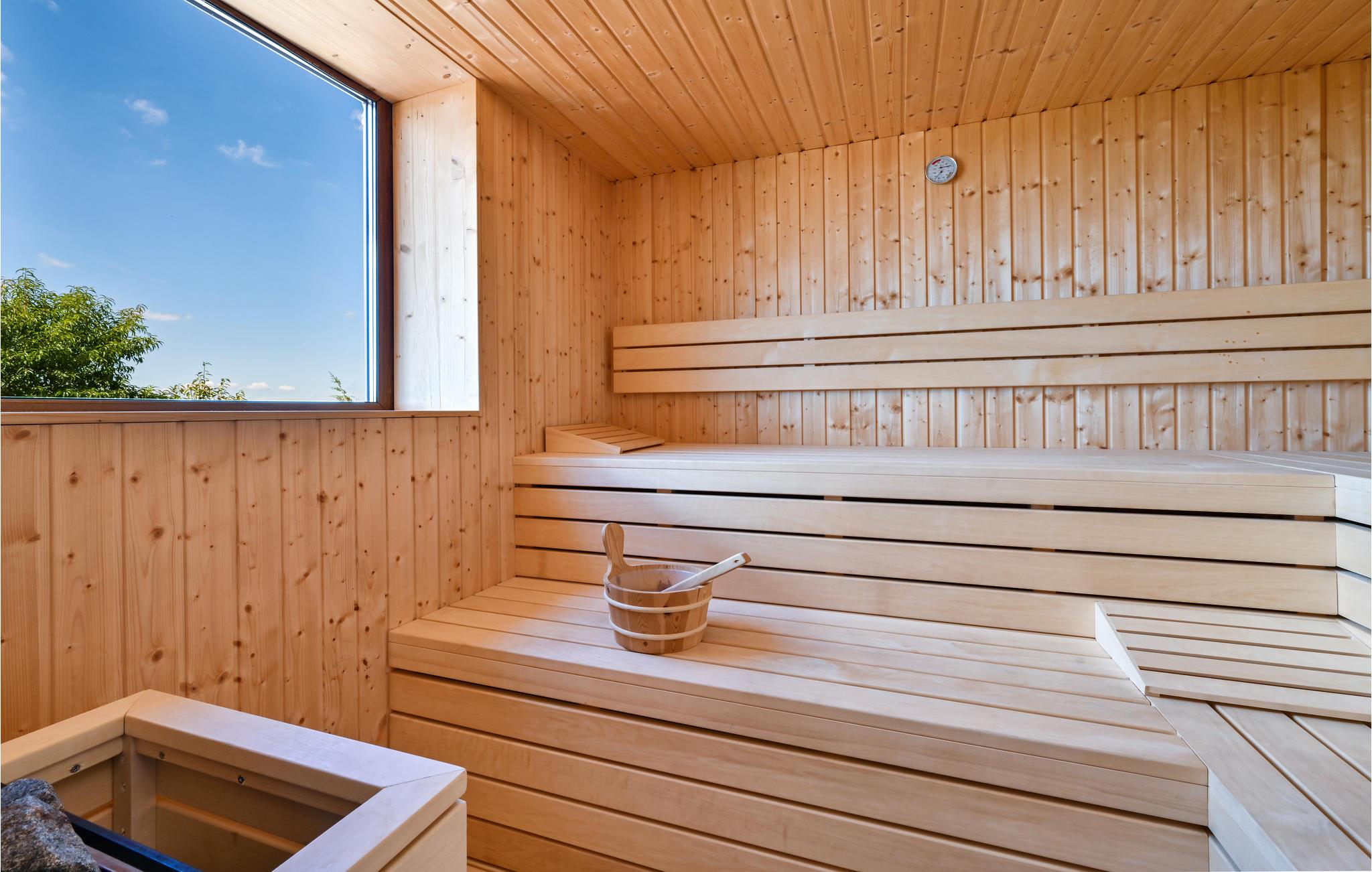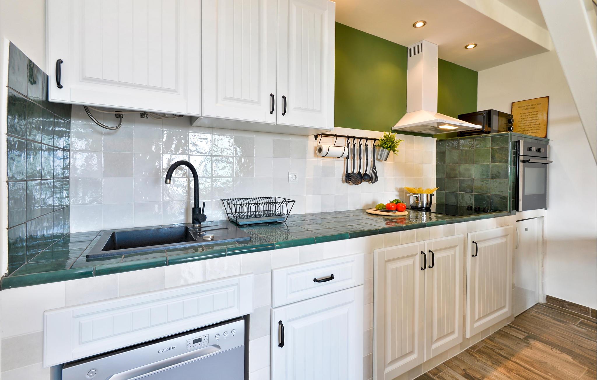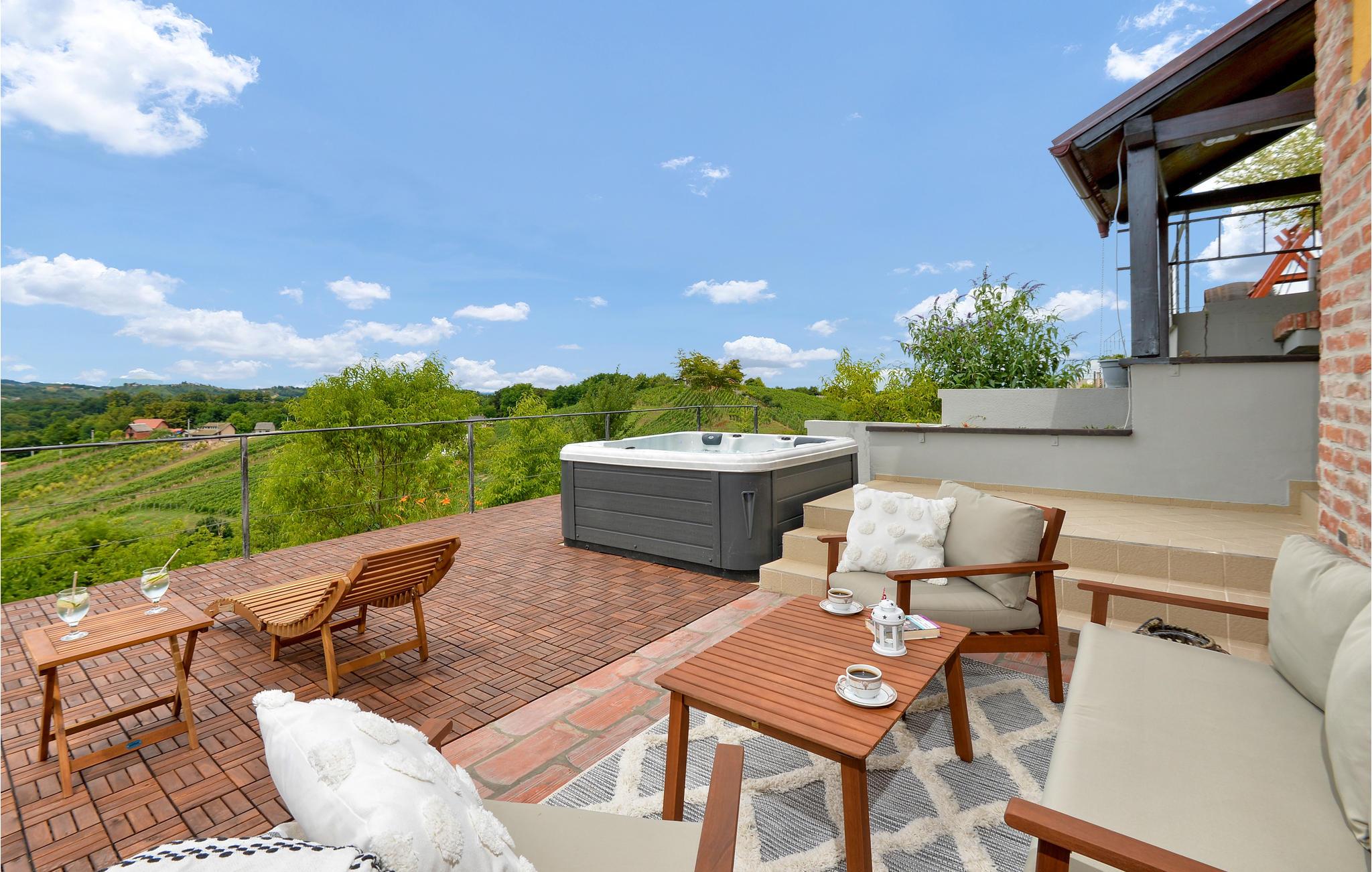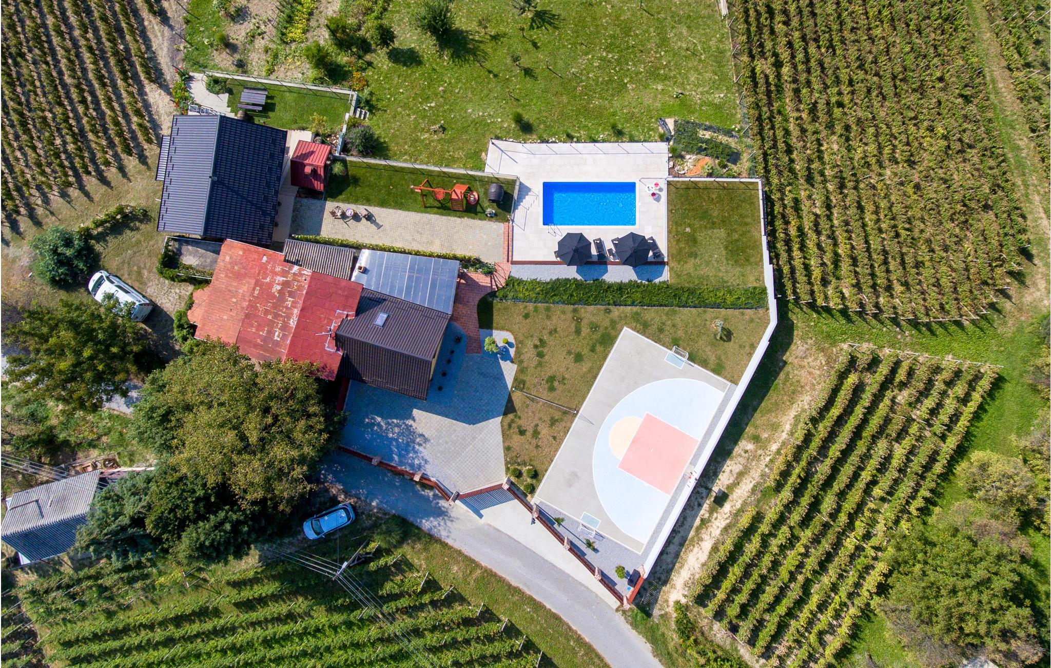 Huset består av to bygninger. Langt borte fra byens kjas og mas kan du nyte den fantastiske utsikten over naturen og de omkringliggende vinmarkene og frukthagene. Foran huset ligger bassenget med solterrasse, terrasser på flere nivåer og en multifunksjonell lekeplass for store og små. De to husene er innredet i landlig stil, velutstyrte og ideelle for en familie med venner som ønsker å tilbringe ferien sammen, men likevel beholde privatlivet sitt. Begge husene har 2 soverom på loftet, hvorav det ene er et sammenhengende rom. Nyt terrassen med utepeis og tilbring koselige grillkvelder der.
