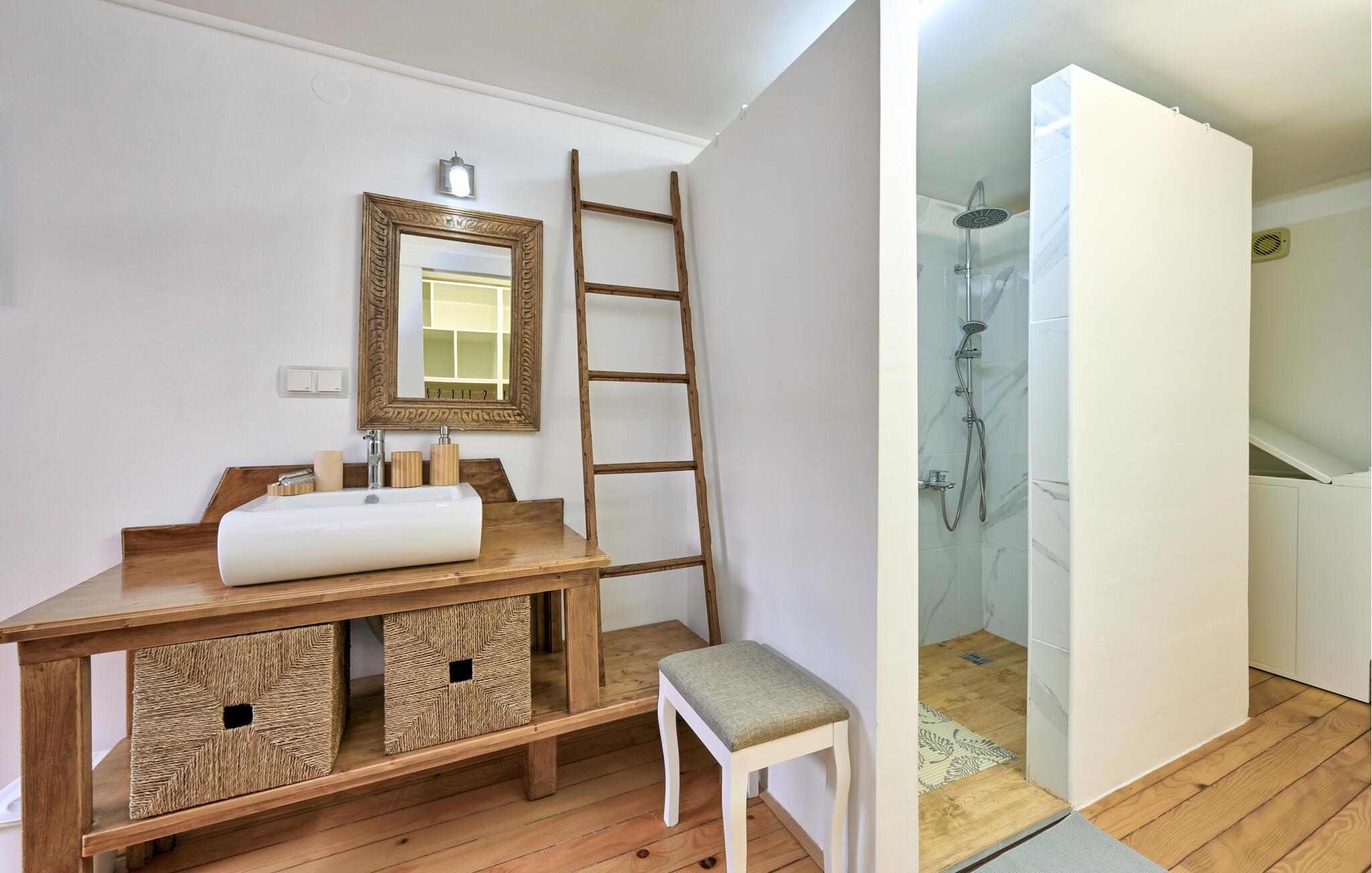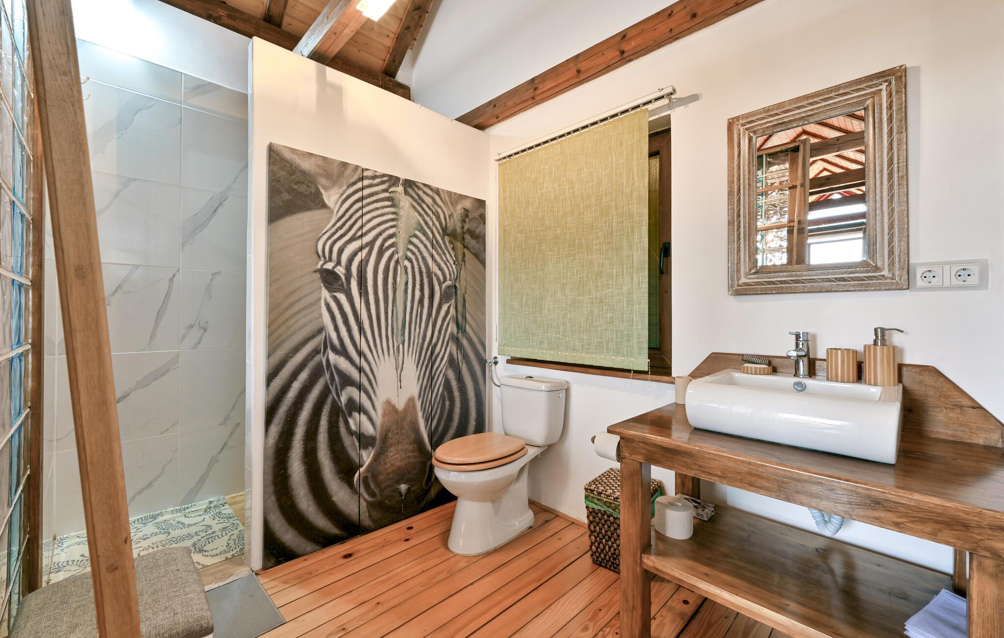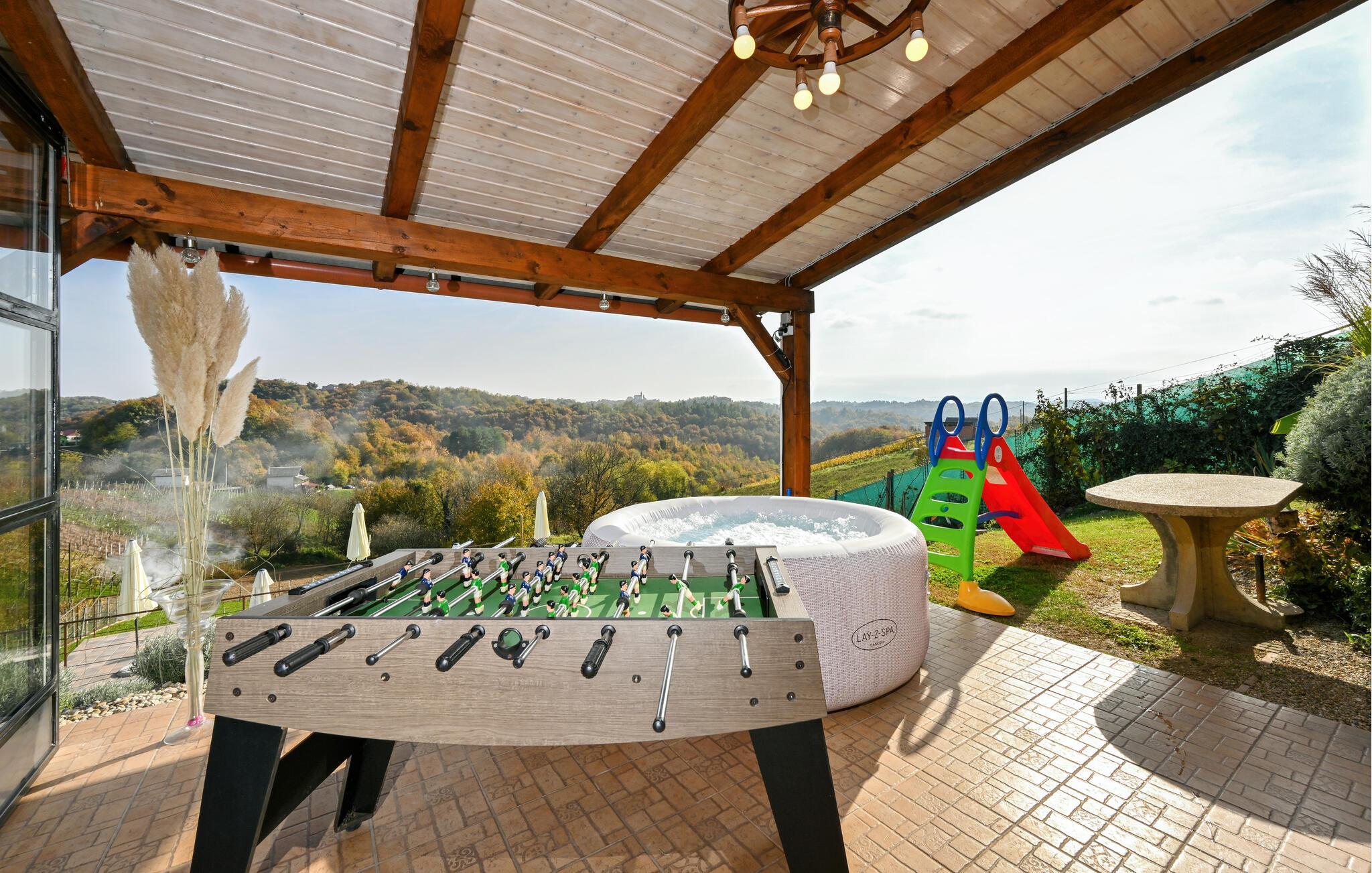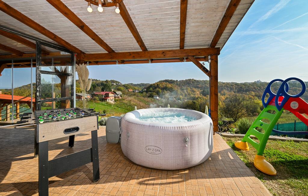 Dette praktfulle huset tilbyr deg og familien en luksuriøs ferieopplevelse i flere etasjer. Den elegante stuen med stor takhøyde og stilfulle møbler skaper en lys og innbydende atmosfære. Nyt den fantastiske utsikten over de naturlige omgivelsene gjennom de store vinduene. Opplev ren avslapning i ditt eget basseng, badstue eller hydromassasje. På den romslige terrassen med lekeapparater kan dere lage mat sammen og tilberede måltidene i det fullt utstyrte sommerkjøkkenet eller på grillen.