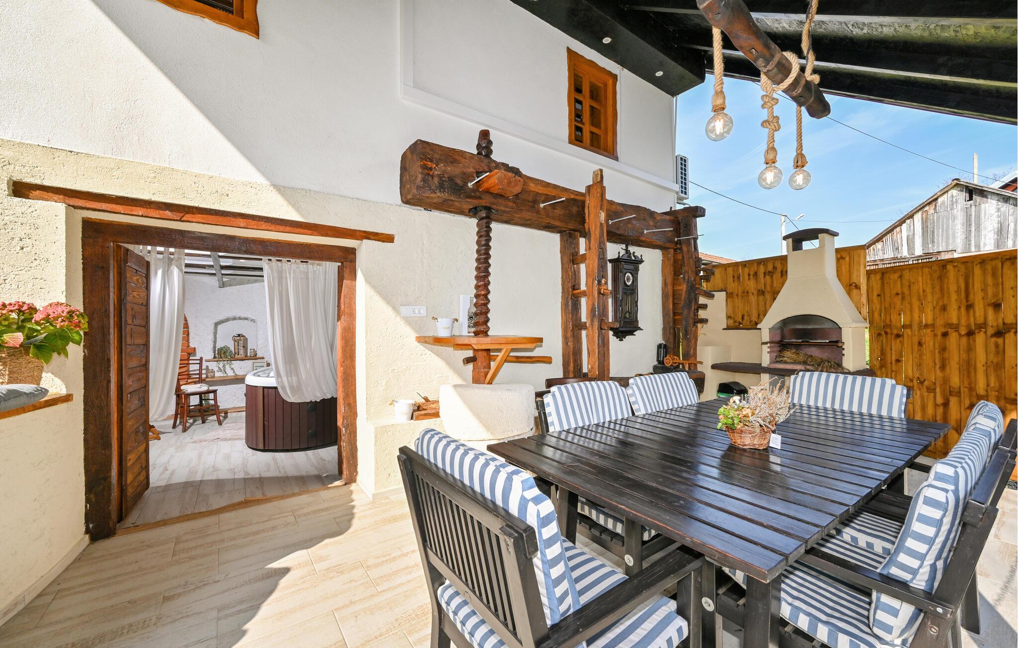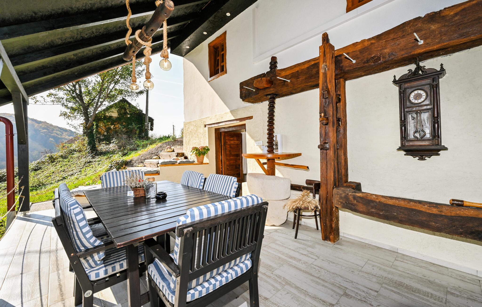 Den rustikke hyggen fortsetter på den overbygde terrassen, som takket være beliggenheten i åssiden byr på en fantastisk utsikt over de grønne omgivelsene. Her kan du nyte en solid frokost i den milde morgensolen og hyggelige grillkvelder i stearinlysets sken med et godt glass vin.