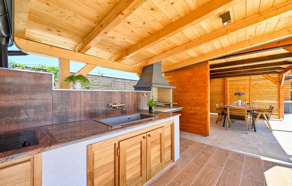 Fra huset kan du nyte en fantastisk utsikt over de grønne åsene rundt. Hagen byr på mange forskjellige underholdnings- og fritidsmuligheter for barn og voksne. Ved siden av bassenget er det en overbygd uteterrasse hvor du kan tilberede deilige måltider i sommerkjøkkenet. Nyt å tilberede og smake på måltider sammen i frisk luft.