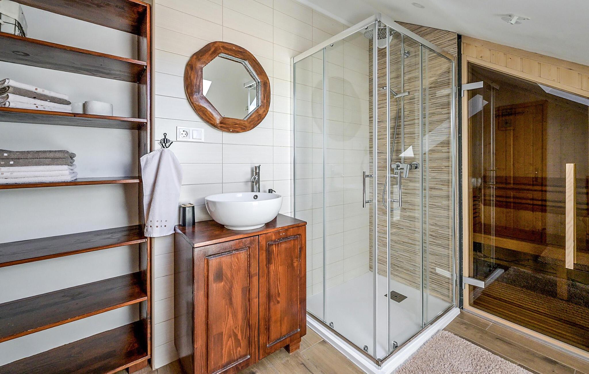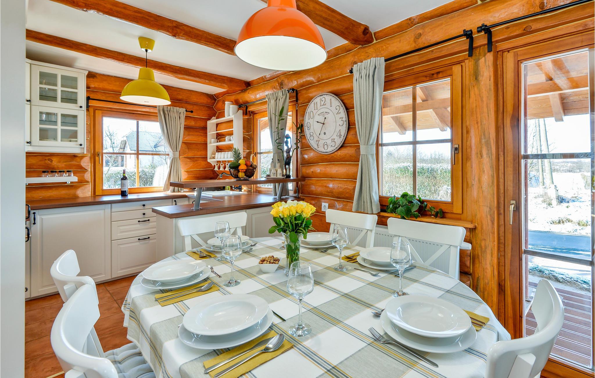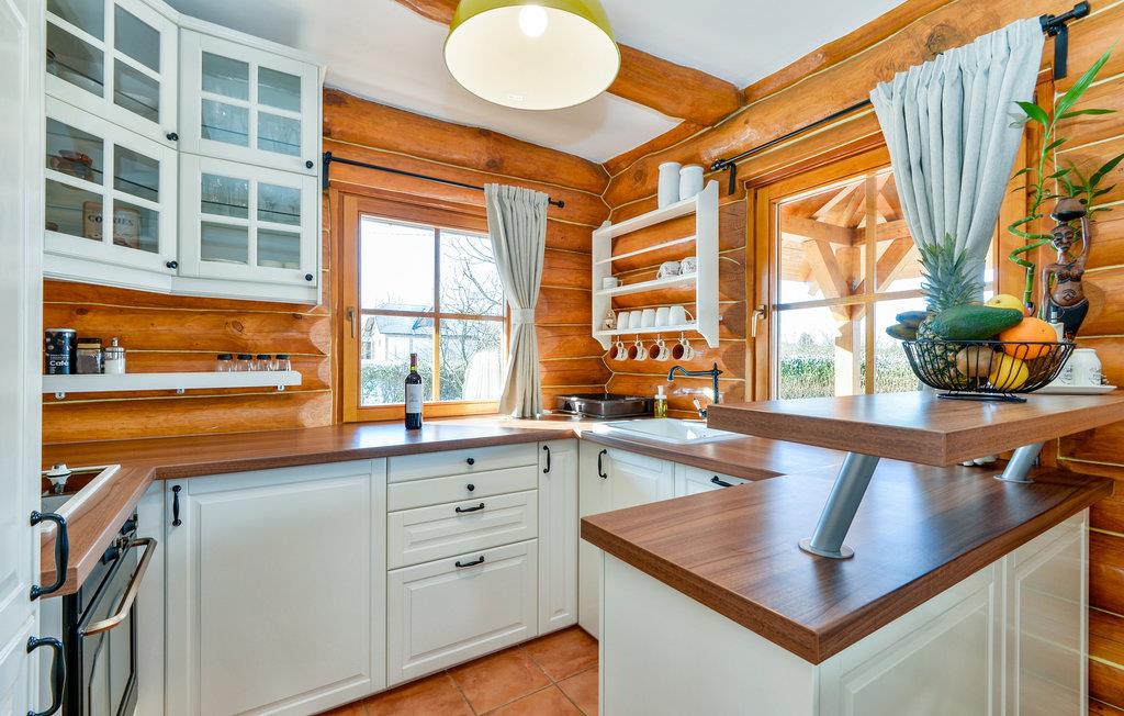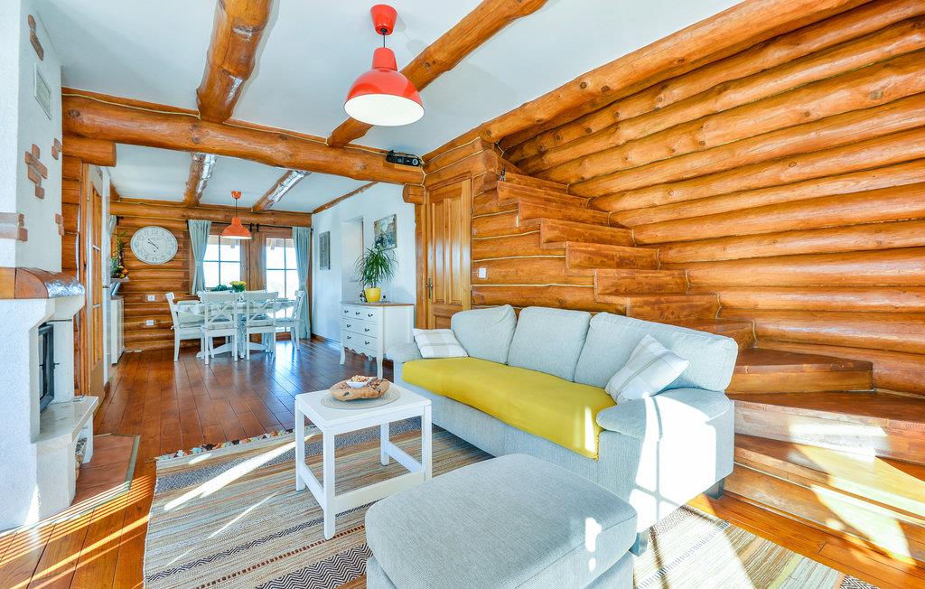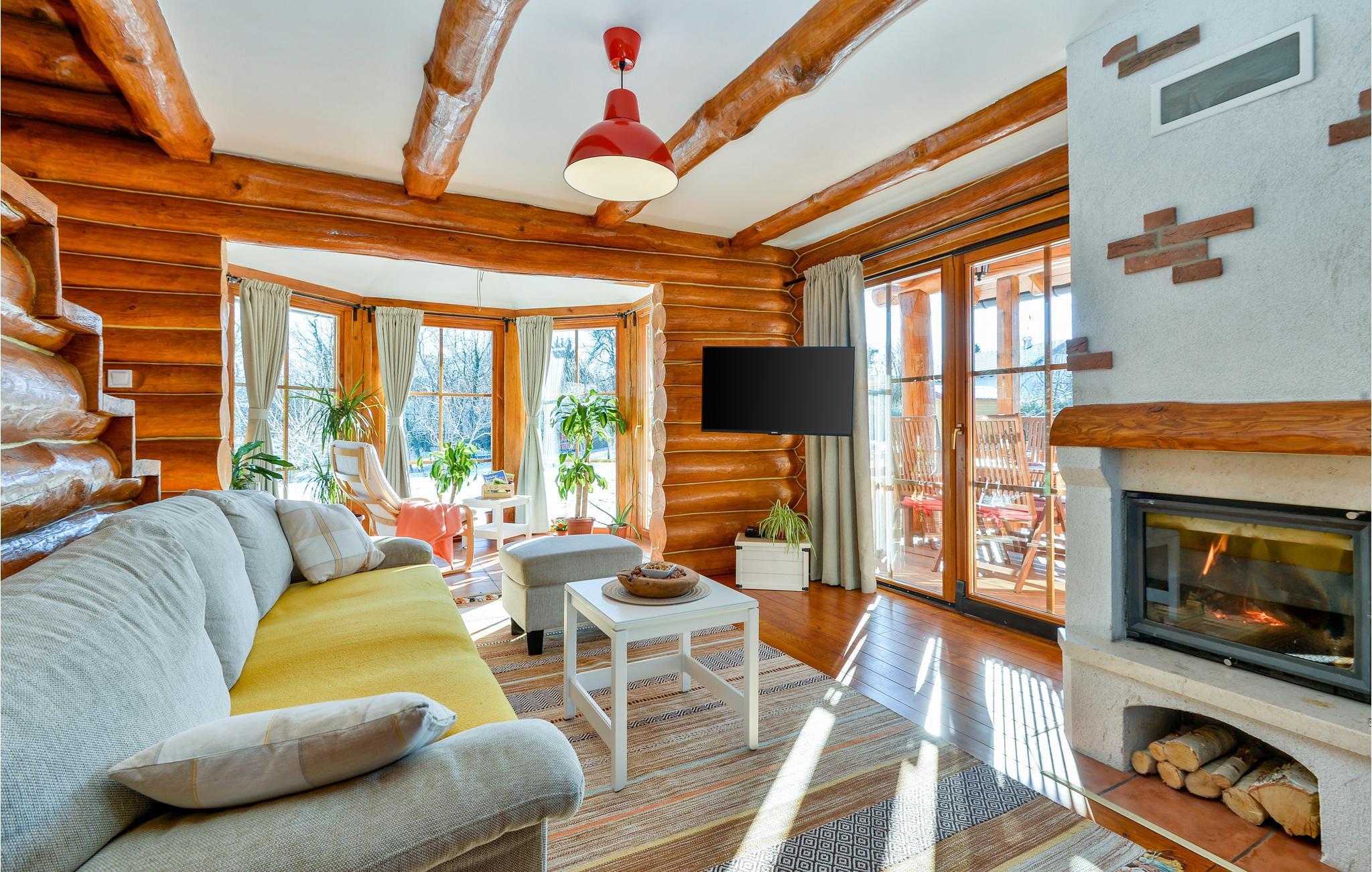 Feriehuset med 2 soverom har plass til opptil 6 personer, og 1 kjæledyr er også velkommen her. Her kan du nyte en fantastisk utsikt over landskapet. Inne i huset harmonerer den rustikke karakteren i rommene perfekt med de moderne møblene. Kos deg ved peisen på kjøligere kvelder, og ved er tilgjengelig kostnadsfritt.
