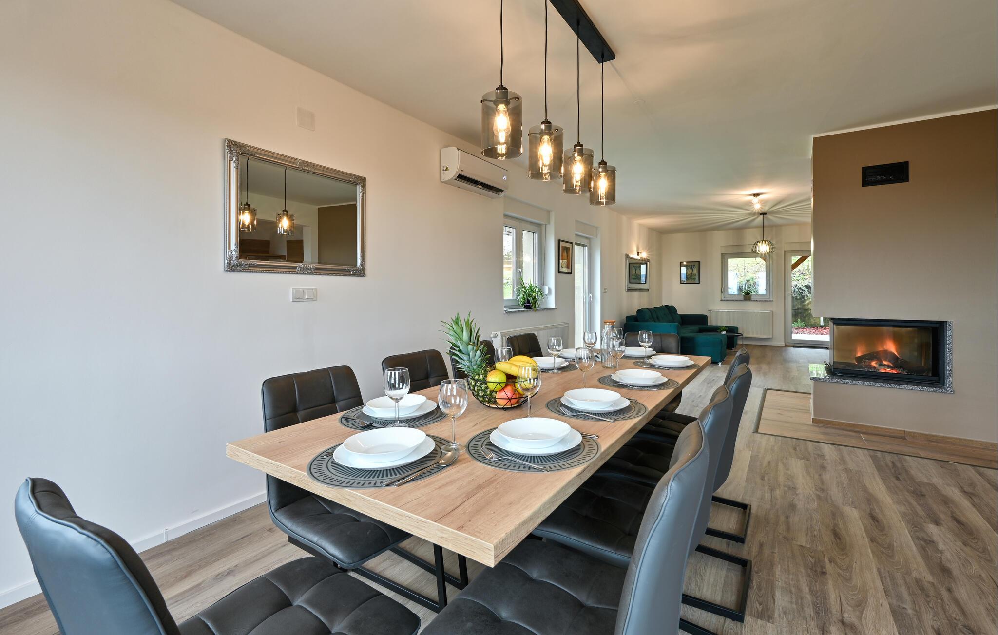 Dette komfortable feriehuset gir deg muligheten til å tilbringe en avslappende ferie med familie eller venner. Lag mat sammen på det velutstyrte kjøkkenet med åpen planløsning, og nyt måltidene sammen ved det innbydende spisebordet. På kjøligere kvelder kan du tenne opp i peisen, se en film og sette deg godt til rette i den koselige sofaen.