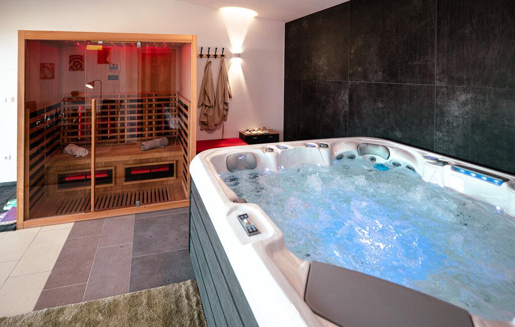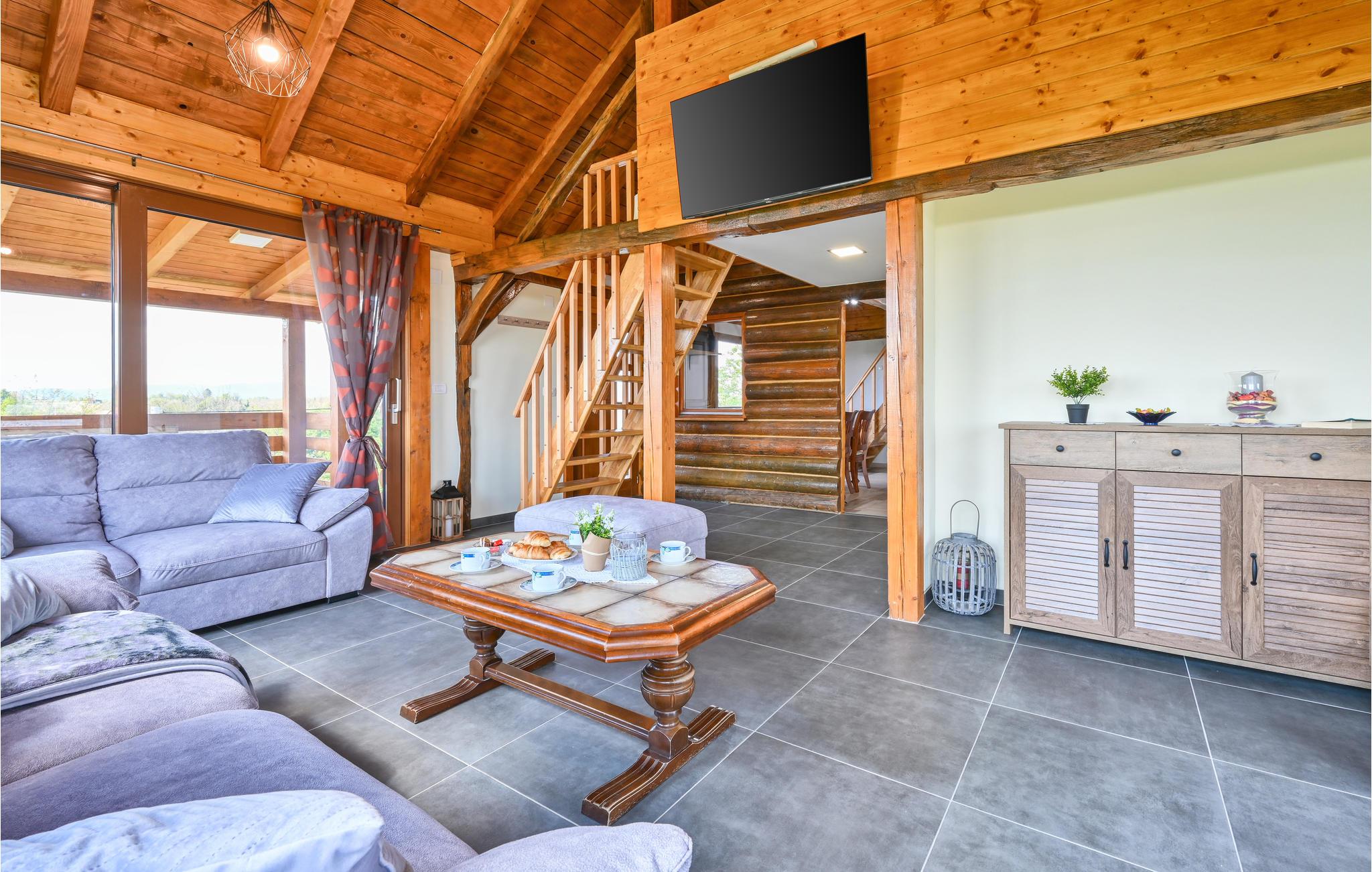 Her er du omgitt av en idyllisk hage med en fantastisk utsikt over de omkringliggende åsene og den frodige grønne naturen. Huset er ideelt for familier med kjæledyr, og er utstyrt med alt du trenger for en fredelig og avslappende ferie. Det finnes også en rekke morsomme fritidsfasiliteter for barn og voksne som avrunder oppholdet, blant annet klatrestativ, volleyballnett og to fotballmål. Slapp av i de koselige hagemøblene og forfrisk deg i bassenget, eller nyt velvære i badstuen. Det er også en grill og tre terrasser der du kan velge mellom skygge eller sol, alt etter hva du foretrekker. Inne finner du en stor stue med stor takhøyde og sofistikerte møbler, der treverket smelter harmonisk sammen med det naturlige lyset og de nøytrale fargene på møblene. Her kan du sette deg godt til rette i den store sofaen, se en film sammen for å få fred og ro om kvelden, eller nyte den koselige atmosfæren med ferielesning.