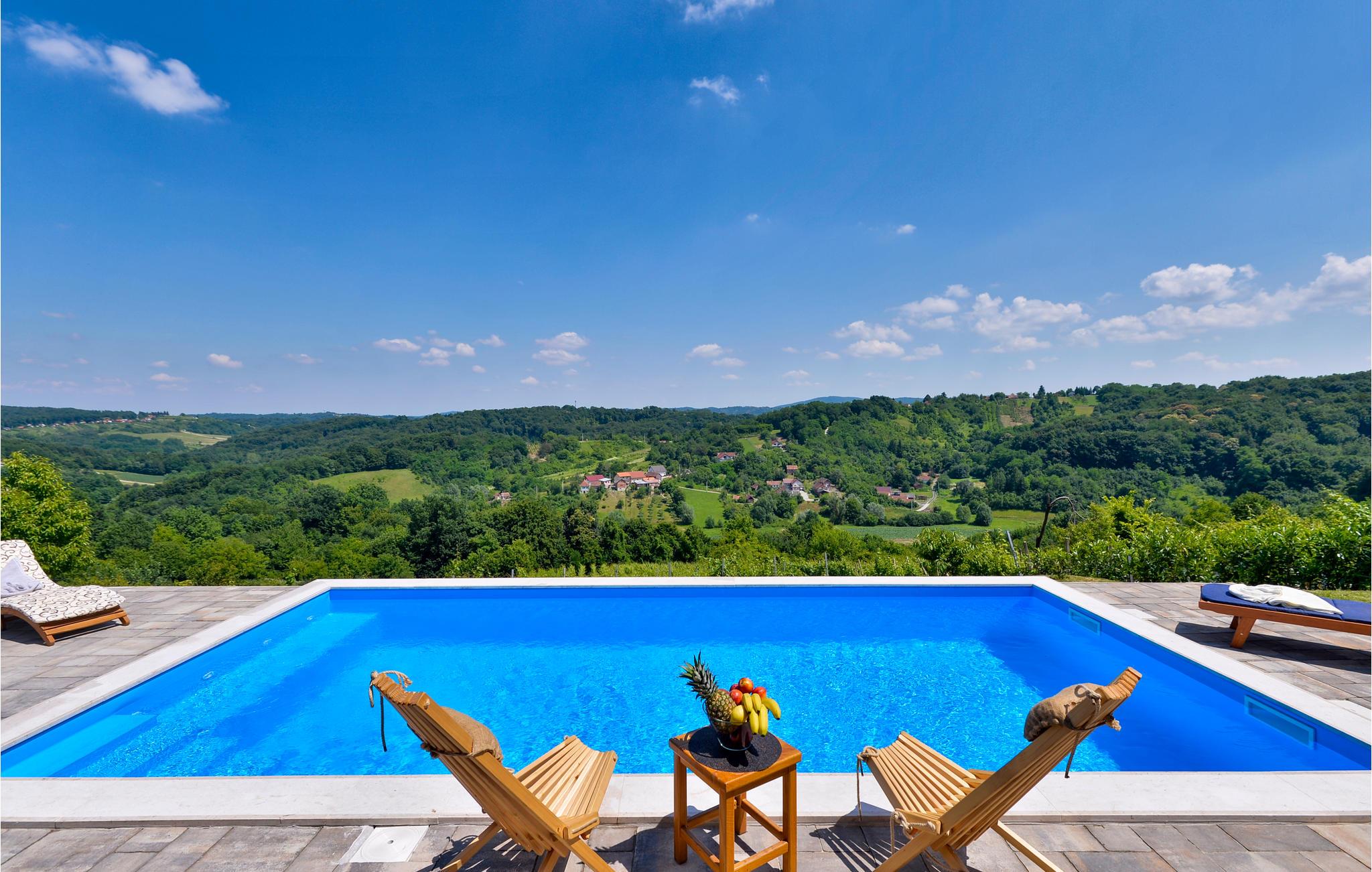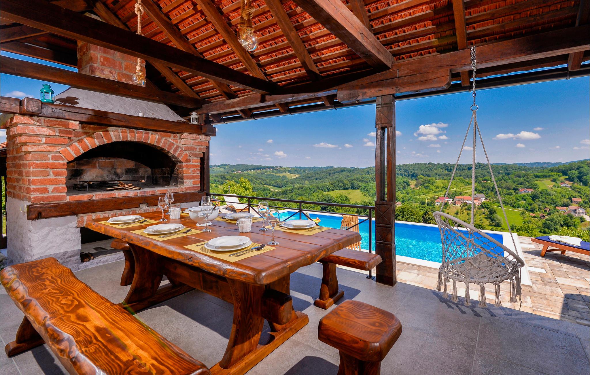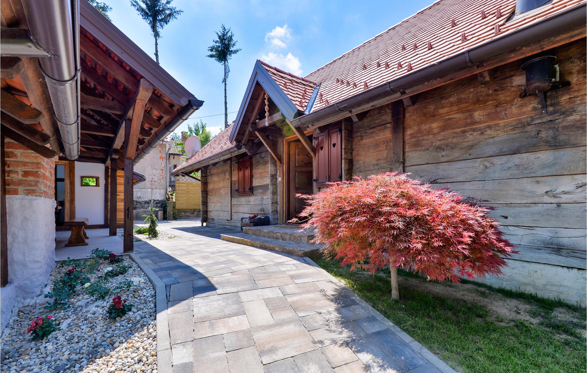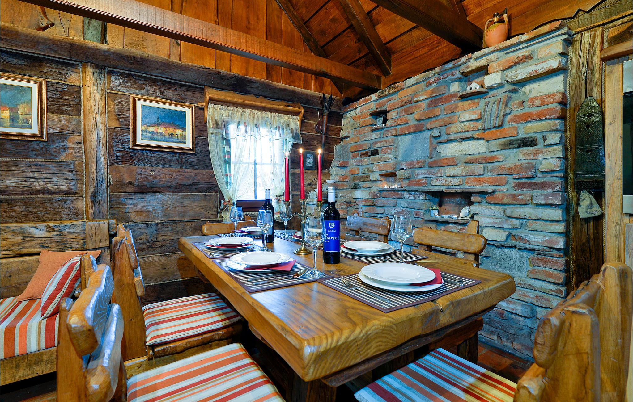 Dette fantastiske feriehuset i tre ligger i nærheten av de termiske badene i Varadin. Det ligger på en høyde omgitt av vinmarker og har en vakker utsikt over naturlandskapet. Ren luft, fredelige omgivelser og et feriehus bygget av naturlige materialer sørger for en avslappende ferie. I første etasje består huset av et kjøkken med stue, bad og et soverom med eget bad, mens det i andre etasje er et soverom og et galleri med to ekstrasenger for én person hver. Foran huset er det en overbygd terrasse med grillplass og en innglasset del med boblebad med en fantastisk utsikt over dalen. Det er også et basseng i hagen, hvor du kan kjøle deg ned på varme sommerdager. I kjelleren er det en badstue for fire personer og et avslapningsområde med dusj. Siden feriehuset ligger i et vinområde, er det mulig å smake på lokale viner sammen med vertene og arrangere catering mot en ekstra kostnad. Vi anbefaler også et besøk til den vakre byen Varadin, hvis kunstneriske arv med sin bevarte og overdådige barokkarkitektur, harmoniske torg og romantiske gater ganske enkelt vil glede deg. Gå ikke glipp av et besøk til museet for engler og insektsamlingen. I nærheten finner du de termiske badene i Varadin, hvor du kan nyte fordelene med termisk vann og velvære.