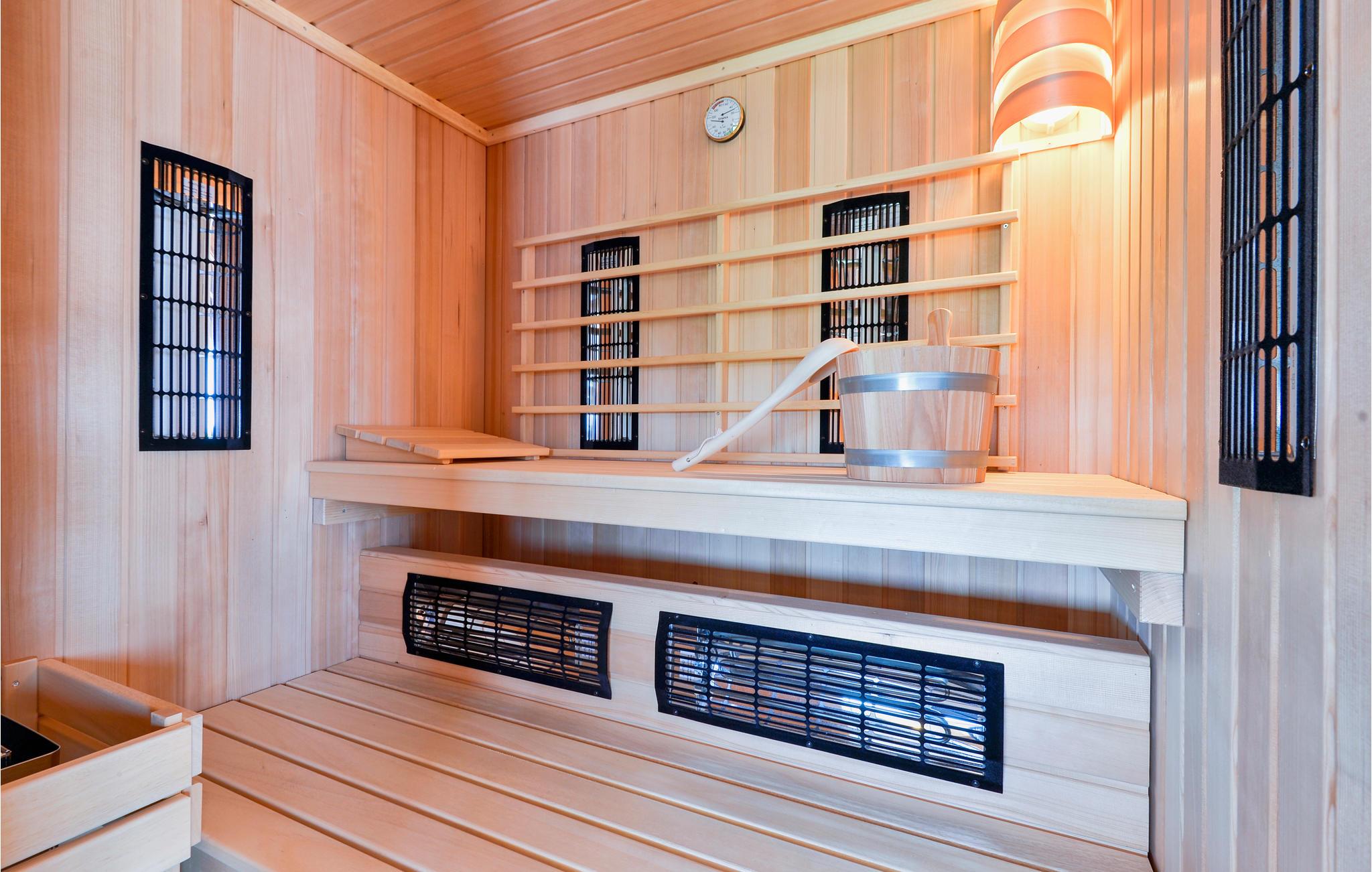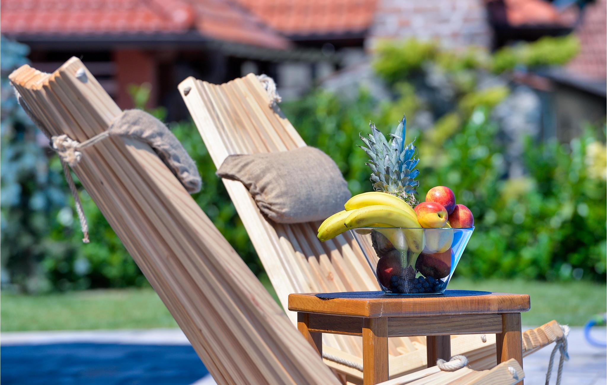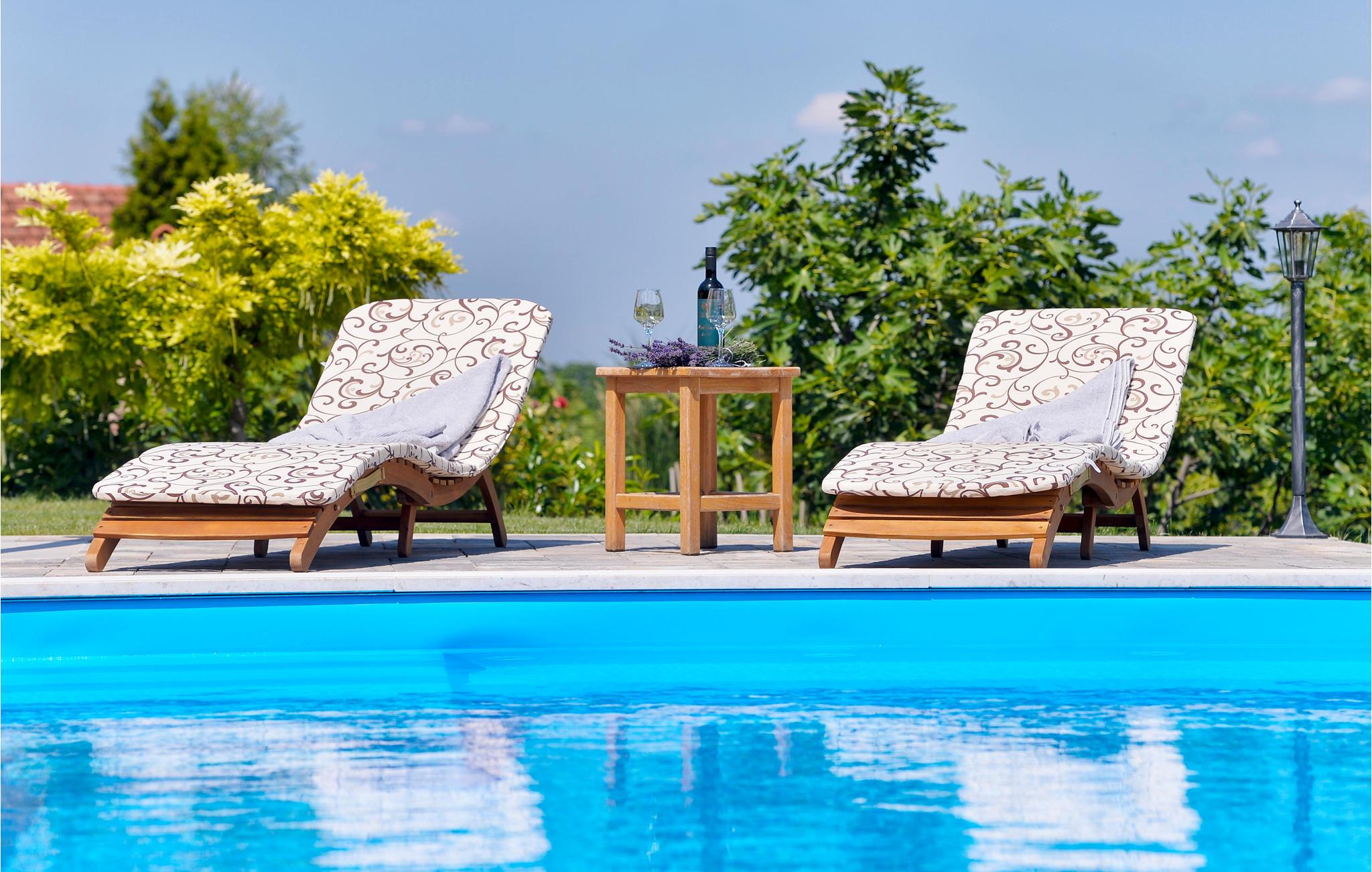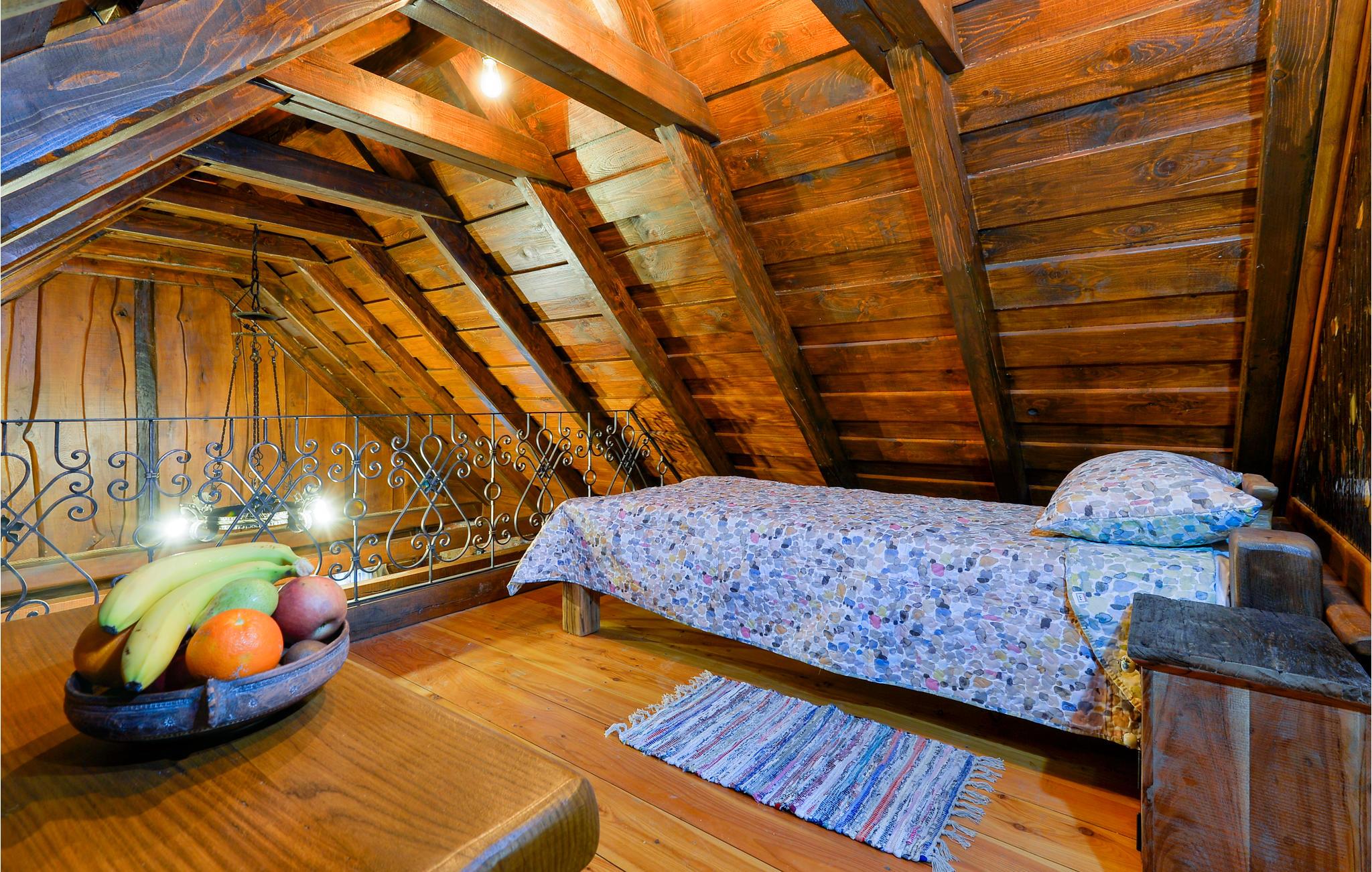 Dette fantastiske feriehuset i tre ligger i nærheten av de termiske badene i Varadin. Det ligger på en høyde omgitt av vinmarker og har en vakker utsikt over naturlandskapet. Ren luft, fredelige omgivelser og et feriehus bygget av naturlige materialer sørger for en avslappende ferie. I første etasje består huset av et kjøkken med stue, bad og et soverom med eget bad, mens det i andre etasje er et soverom og et galleri med to ekstrasenger for én person hver. Foran huset er det en overbygd terrasse med grillplass og en innglasset del med boblebad med en fantastisk utsikt over dalen. Det er også et basseng i hagen, hvor du kan kjøle deg ned på varme sommerdager. I kjelleren er det en badstue for fire personer og et avslapningsområde med dusj. Siden feriehuset ligger i et vinområde, er det mulig å smake på lokale viner sammen med vertene og arrangere catering mot en ekstra kostnad. Vi anbefaler også et besøk til den vakre byen Varadin, hvis kunstneriske arv med sin bevarte og overdådige barokkarkitektur, harmoniske torg og romantiske gater ganske enkelt vil glede deg. Gå ikke glipp av et besøk til museet for engler og insektsamlingen. I nærheten finner du de termiske badene i Varadin, hvor du kan nyte fordelene med termisk vann og velvære.