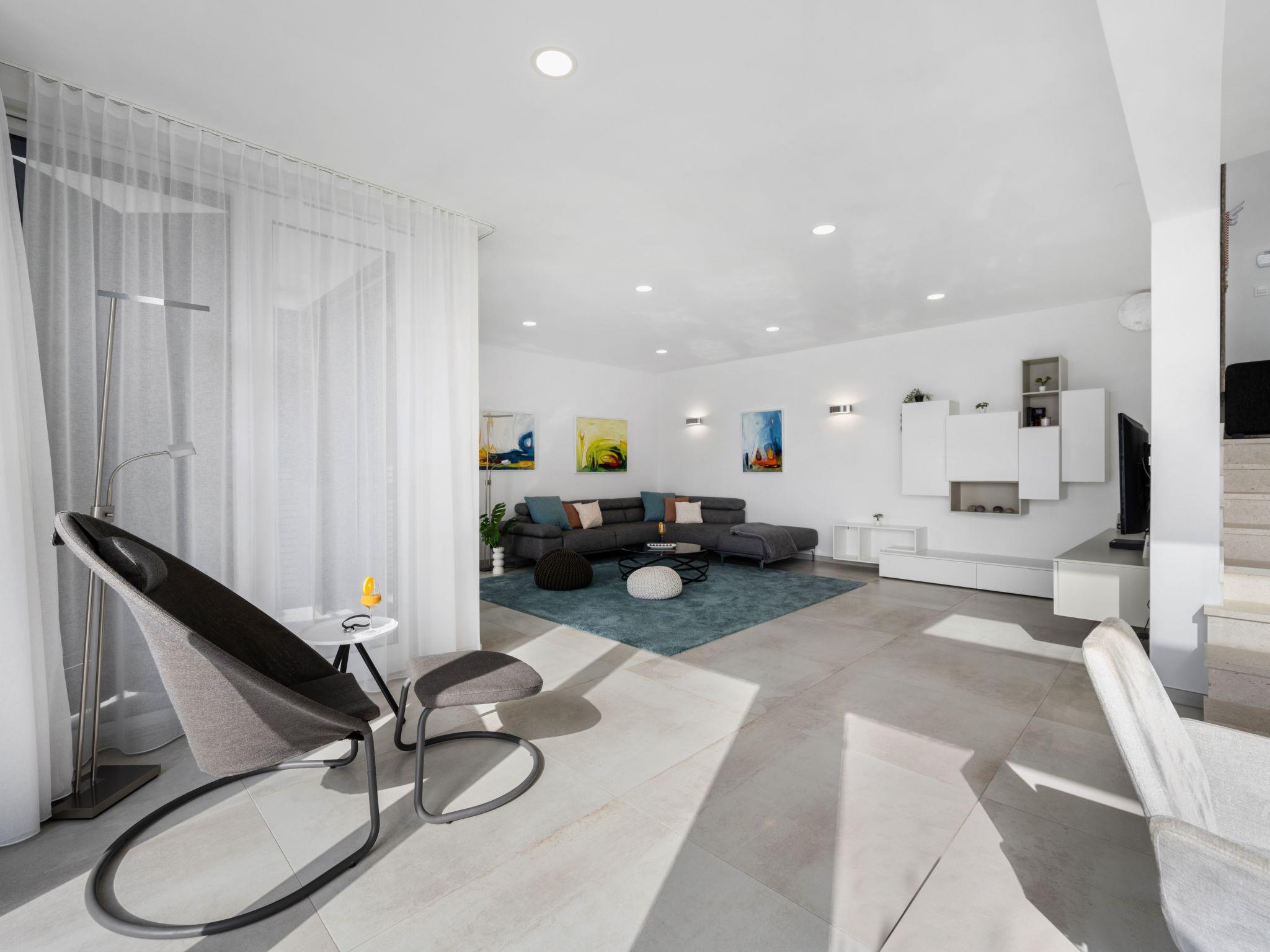 On the terrace, raised tiles provide non-slip safety, especially for children when walking. A heated L-shaped pool invites you to enjoy a pleasant swim even in the low season. Comfortably designed pool loungers and matching lounge furniture invite you to chill out and sunbathe. The whirlpool with sea views is the perfect place to relax and enjoy a glass of wine in the evening. With an outdoor barbecue including equipment, you can sit happily in the shady corner of the terrace and savour the fantastic view. 1 SUP and 1 canoe are optionally available to guests for a small additional flat rate. The villas are accessed via a somewhat narrow gravelled road and a steep driveway. 1-2 cars can be parked safely in the private carport behind the house. The small centre of Vinisce with a few local restaurants, bars, supermarkets and the local pebble beach can be reached by car in approx. 10 minutes. Marina is about 15 minutes away and Trogir about 30 minutes.