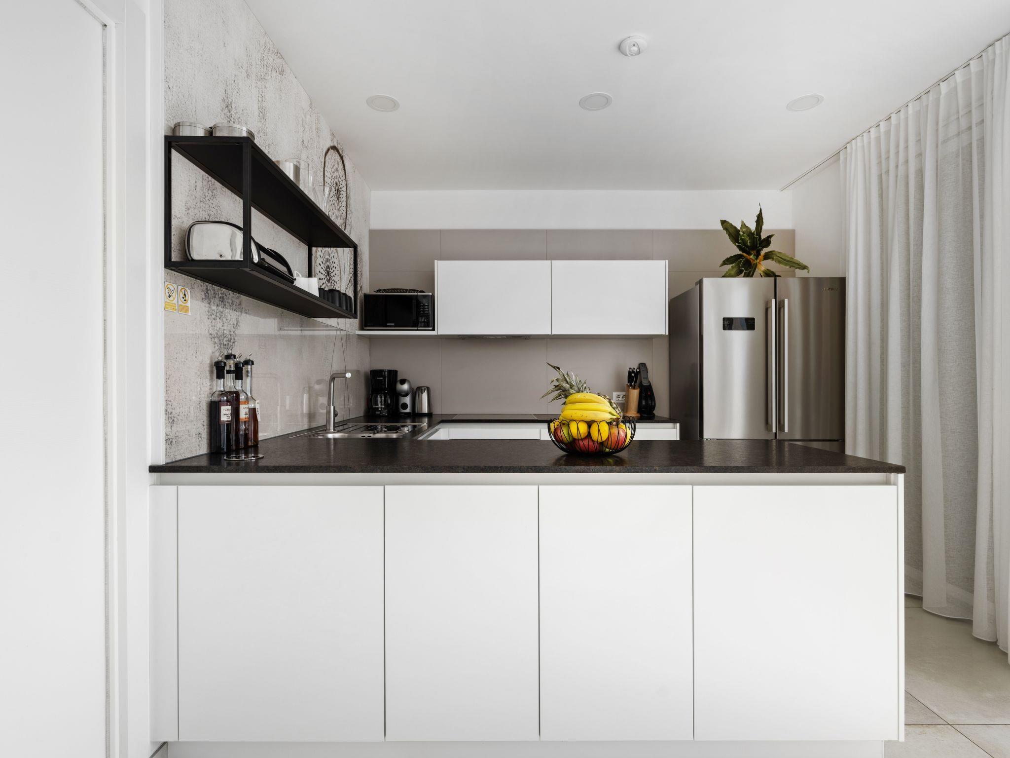 The house was built on 2 levels with an internal staircase in the centre. On the ground floor, a wide and open space with a cosy living area, spacious dining area and a fully equipped kitchen with American fridge and ice cube. Behind this is a guest room with a sofa bed which can also be used as a study or playroom and its own access to the terrace. Next to it is a guest WC and the boiler room with storage space and washbasin. The upper floor is divided into 3 en suite bedrooms (shower/WC), each with its own balcony. Each room has a king-size double bed which can be converted into two single beds if required. From every corner of the property you can enjoy an open sea view from your bed. The functional bathrooms all have a shower with WC and washbasin.