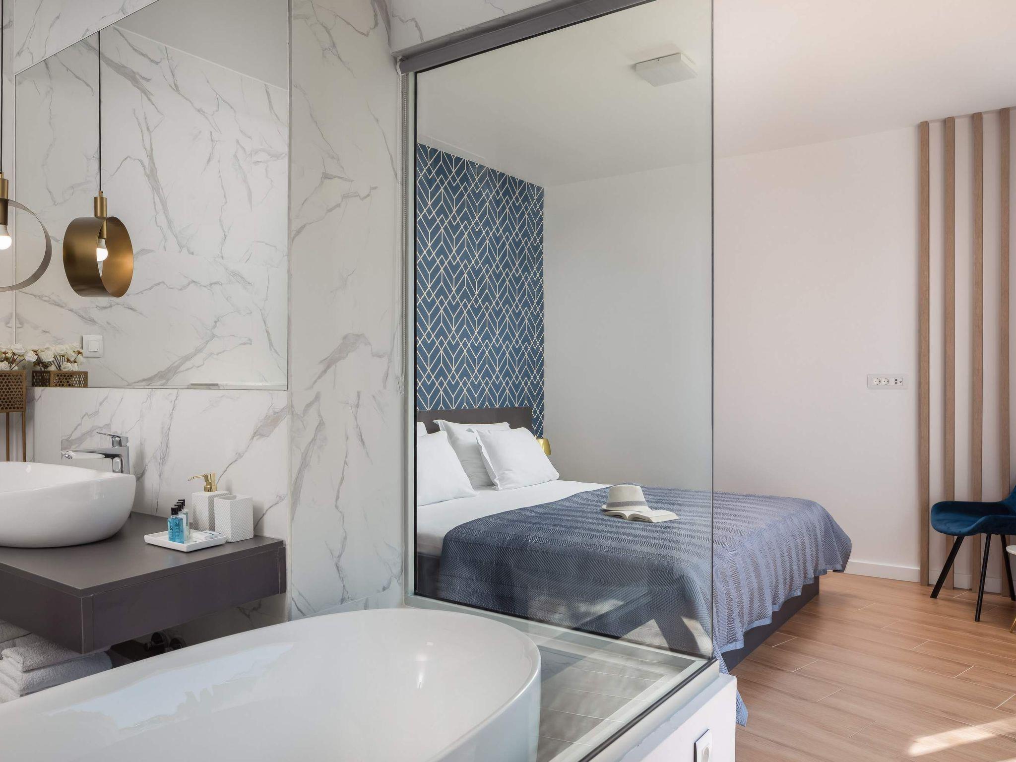Surrounded by the pool is a lounge area with sunbeds, coffee table, seating arrangements, as well as an outdoor barbecue. Guests are provided with their own private parking. The villa’s guests will also enjoy additional exclusive perks like an indoor gym, sauna, Apple TV with wireless surround-sound speaker system. Free Wi-Fi and AC are provided throughout the entire property. Surrounded by lush nature, scenic beaches, amazing gardens, and easy sea access, villa Extravaganza is a gorgeous property for a memorable vacation in the captivating Mediterranean. Extravaganza is within a short driving distance to numerous cultural and historical attractions in Trogir and Split, which are included in the UNESCO World Heritage List.