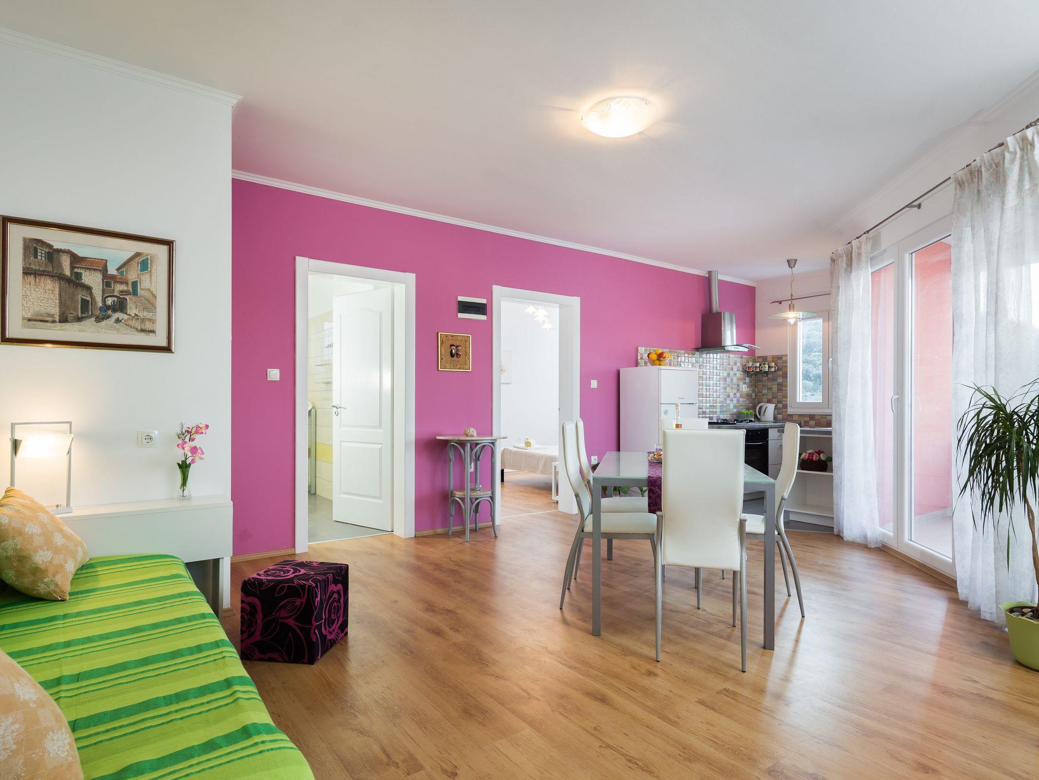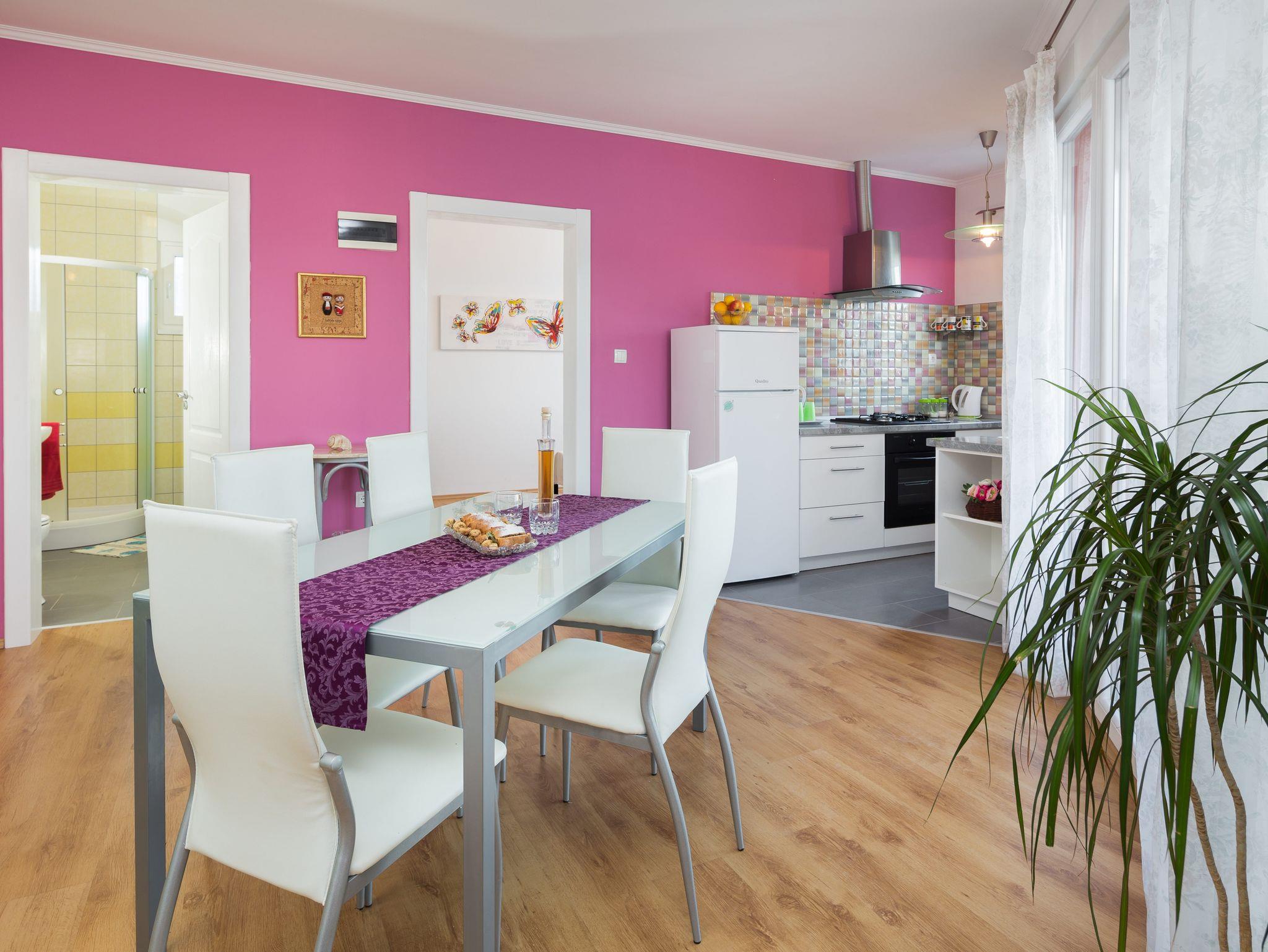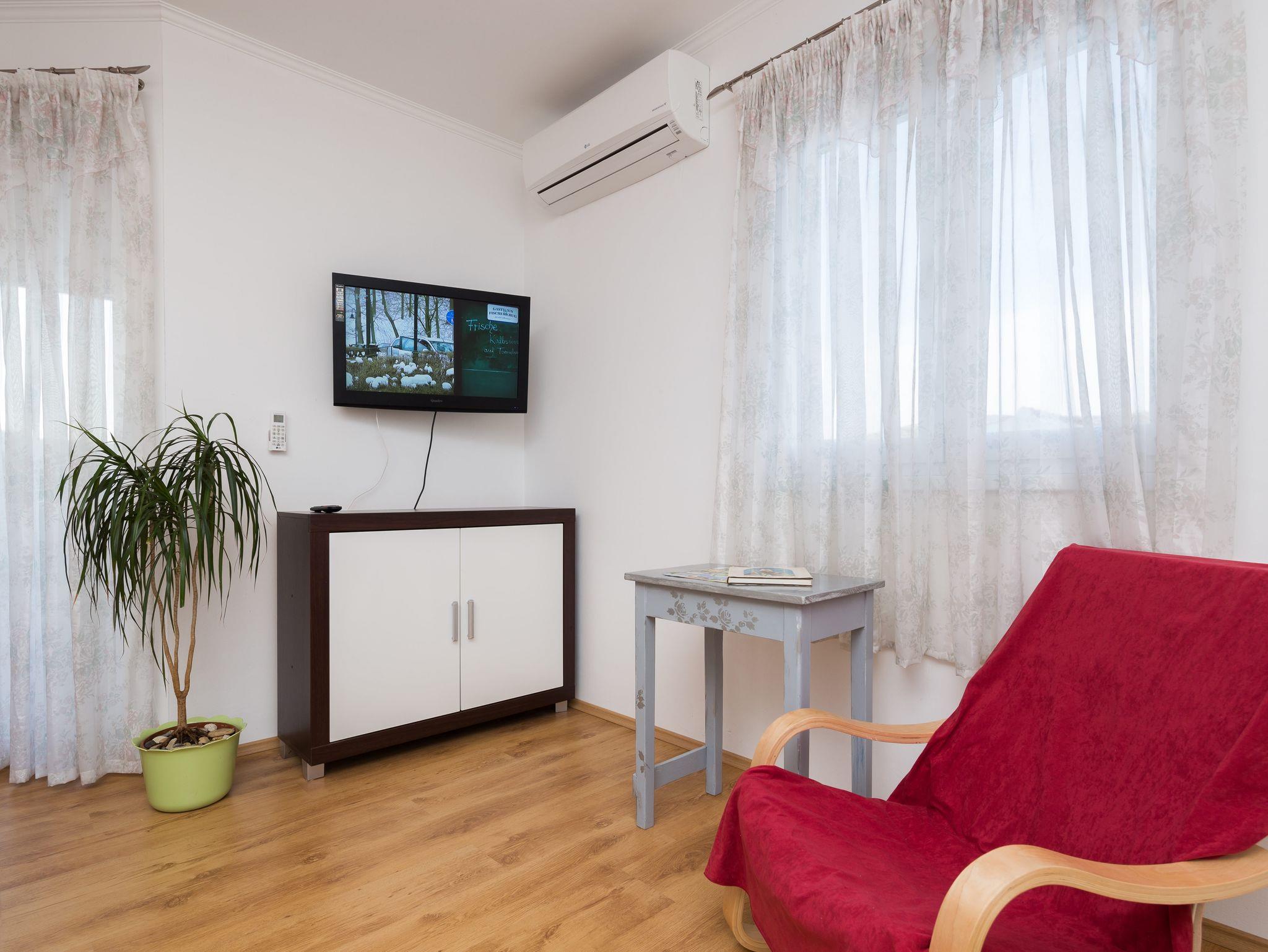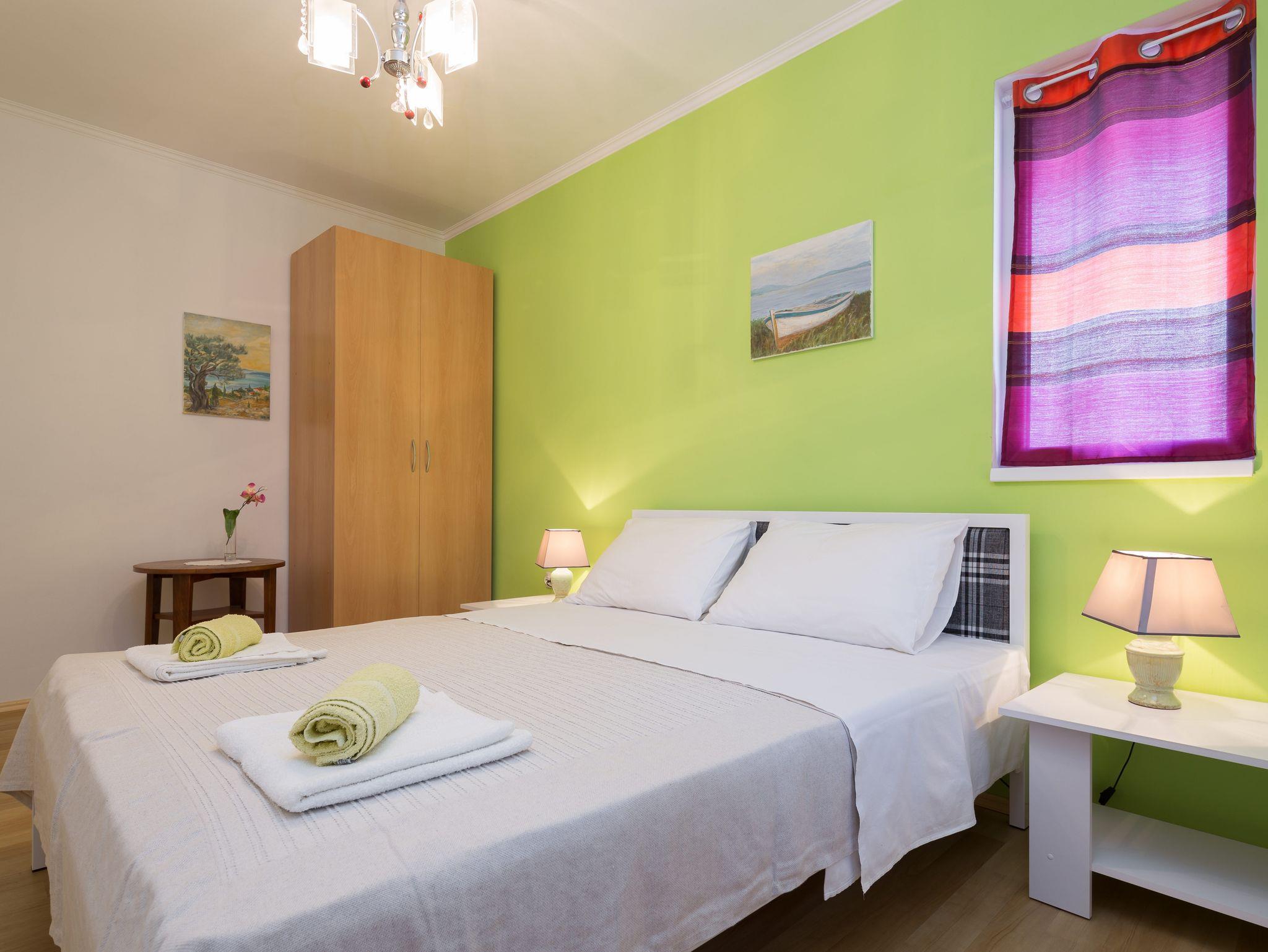 Ferienwohnung bietet Platz für 5 Gäste. Die Betten sind in Schlafzimmern, die es 2 gibt, und in Wohnzimmer, innerhalb einer Gesamtfläche von 57m2, angeordnet. Die Gäste haben eine eigene Terrasse zur Verfügung, auf der sie in warmen Sommernächten genießen können. Das Apartment bietet Meerblick. Es ist erlaubt, Speisen auf dem Gemeinschafts-Grill vorzubereiten. IM PREIS INBEGRIFFEN: Kurtaxe, Endreinigung, Klimatisierung, Parkplatz, Internet, Kinderbett, Bügeleisen, Bügelbrett, Föhn, Sonnenschirm, Liegestühle. VERBINDLICHE ZUSÄTZLICHE KOSTEN: Aufzahlung für Kurzaufenthalte (prozentualer Zuschlag pro Nächtigungsanzahl: 30% - 1, 20% - 2, 10% - 3). UNVERBINDLICHE ZUSÄTZLICHE KOSTEN: Wäschewaschen (10,00 € Waschen). Die Verfügbarkeit zusätzlicher Dienstleistungen in Ihrem reservierten Termin und die Preise derselben (falls nicht aufgeführt) müssen im Voraus überprüft werden. Zusätzliche Dienstleistungen die in der Zahlungsaufforderung nicht aufgeführt sind werden direkt beim Vermieter bezahlt, angenommen der Gast nutzt auch diese. Ermäßigung auf den Grundpreis: Gratistag 21=19 (bei einem Aufenthalt von 21 Tagen oder mehr erhalten Sie 2 Gratistage für den Aufenthalt bis 31.12.26).