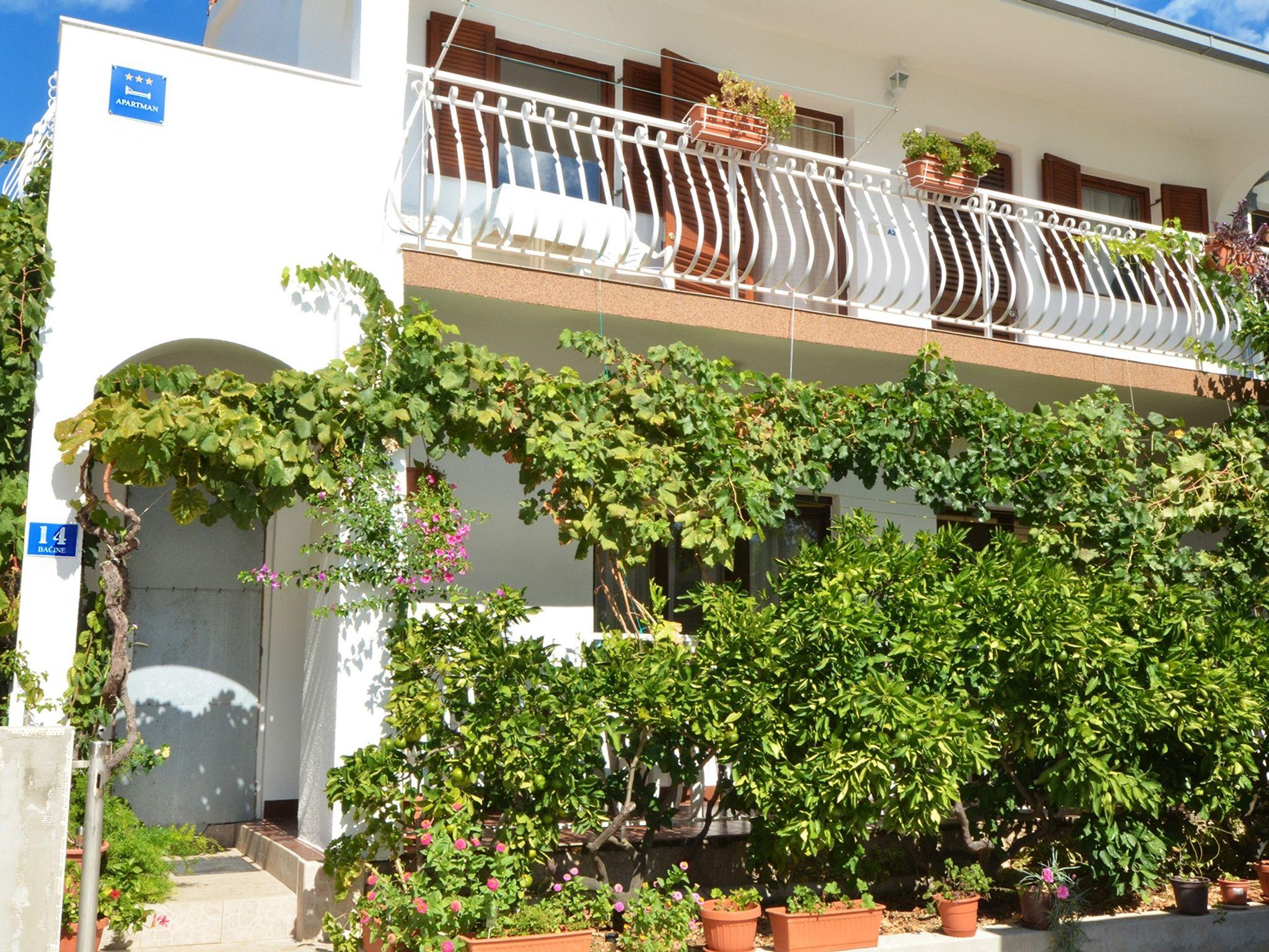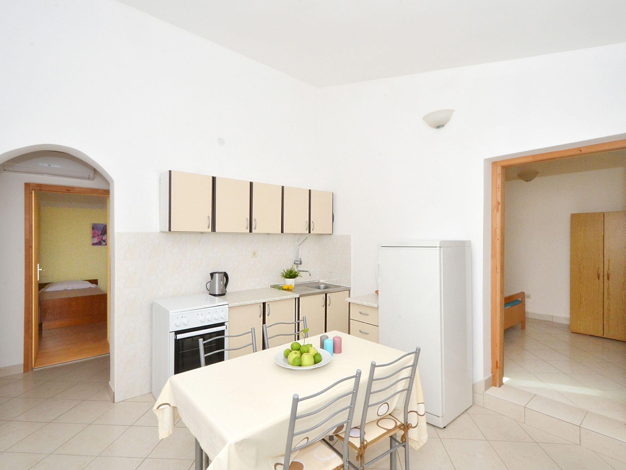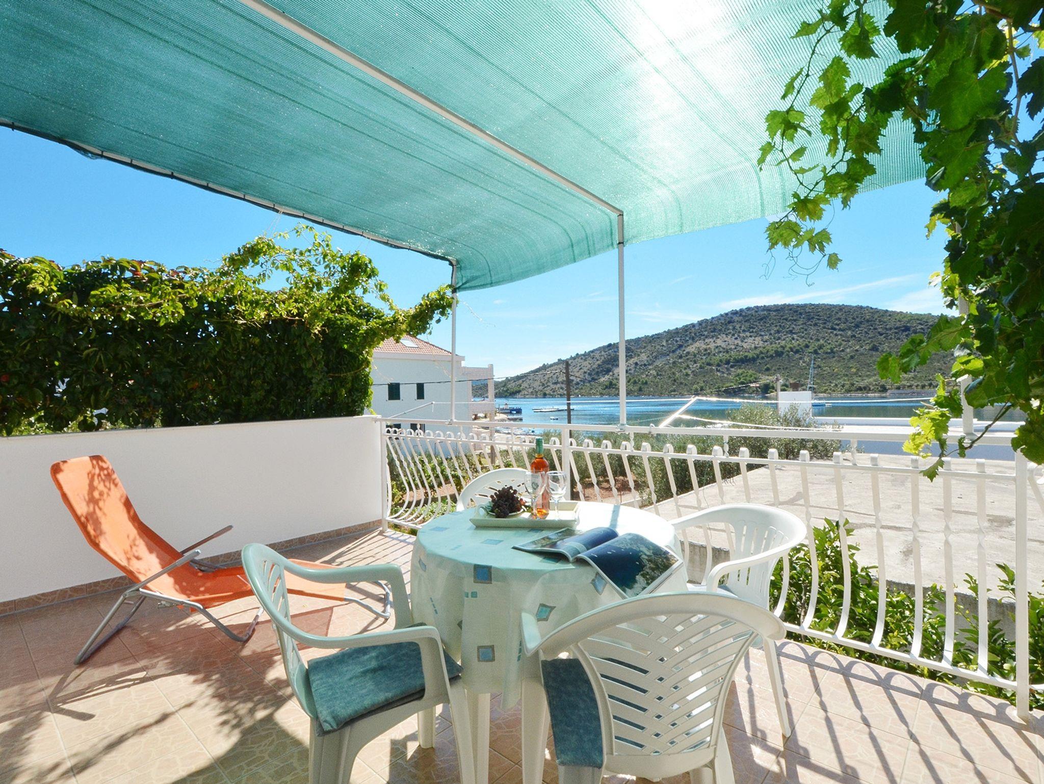 Ferienwohnung bietet Platz für 5 Gäste. Die Betten sind in Schlafzimmern, die es 2 gibt, innerhalb einer Gesamtfläche von 50m2, angeordnet. Die Gäste haben eine eigene Terrasse zur Verfügung, auf der sie in warmen Sommernächten genießen können. Das Apartment bietet Meerblick. Es ist erlaubt, Speisen auf dem Gemeinschafts-Grill vorzubereiten. IM PREIS INBEGRIFFEN: Kurtaxe, Endreinigung, Klimatisierung, Parkplatz, Internet, Kinderbett, Bügeleisen, Bügelbrett, Föhn. VERBINDLICHE ZUSÄTZLICHE KOSTEN: Aufzahlung für Kurzaufenthalte (prozentualer Zuschlag pro Nächtigungsanzahl: 30% - 1, 20% - 2, 10% - 3). UNVERBINDLICHE ZUSÄTZLICHE KOSTEN: Bootsanlegeplatz (15,00 € pro Nacht). Die Verfügbarkeit zusätzlicher Dienstleistungen in Ihrem reservierten Termin und die Preise derselben (falls nicht aufgeführt) müssen im Voraus überprüft werden. Zusätzliche Dienstleistungen die in der Zahlungsaufforderung nicht aufgeführt sind werden direkt beim Vermieter bezahlt, angenommen der Gast nutzt auch diese. Ermäßigung auf den Grundpreis: Gratistag 14=13 (bei einem Aufenthalt von 14 Tagen oder mehr erhalten Sie einen Gratistag für den Aufenthalt bis 31.12.26).