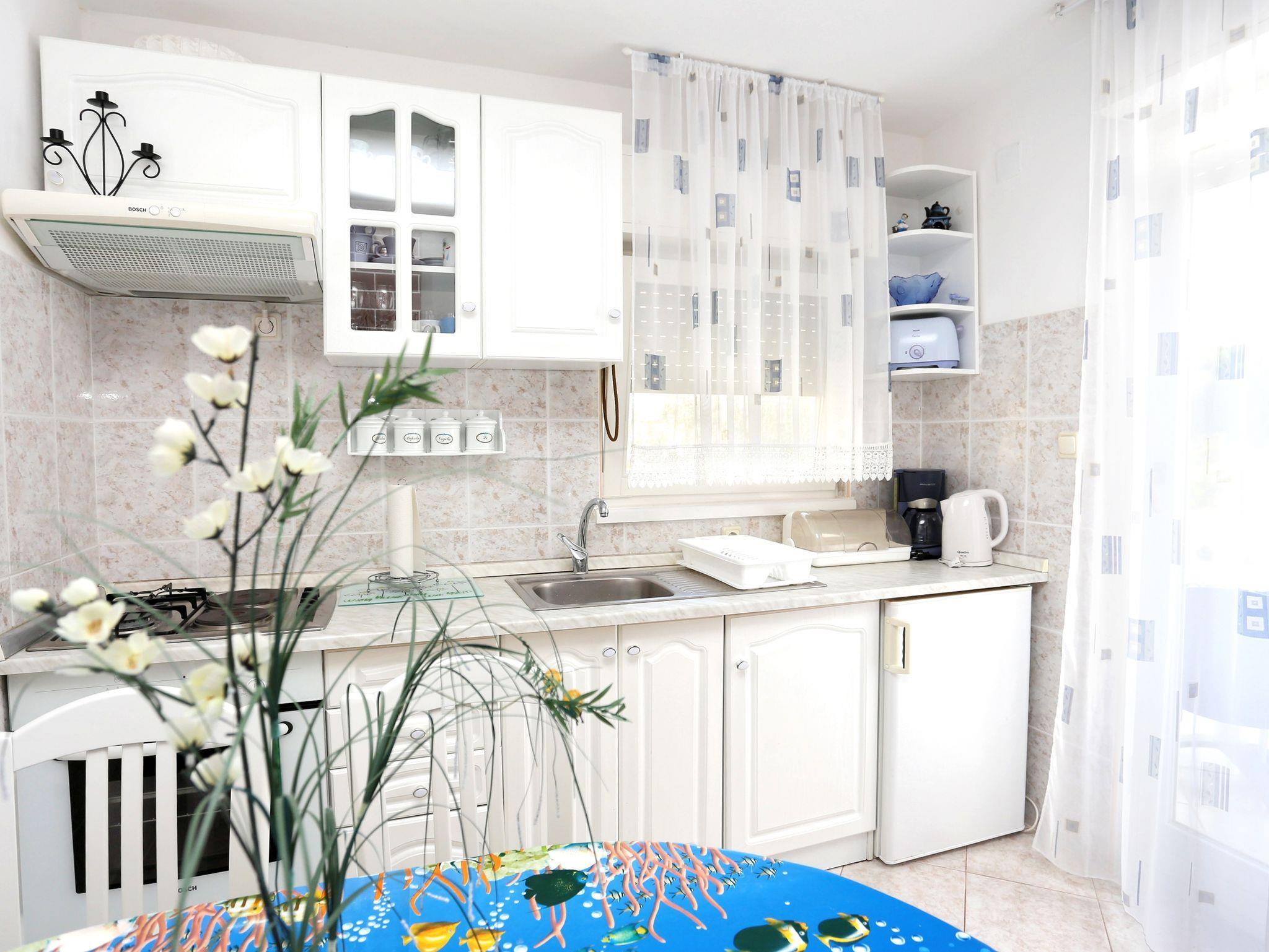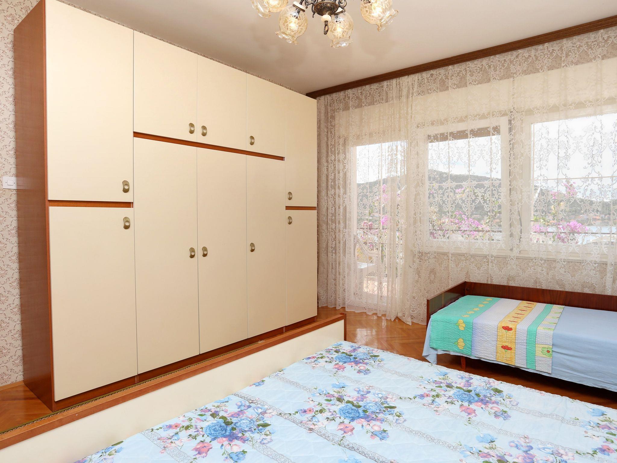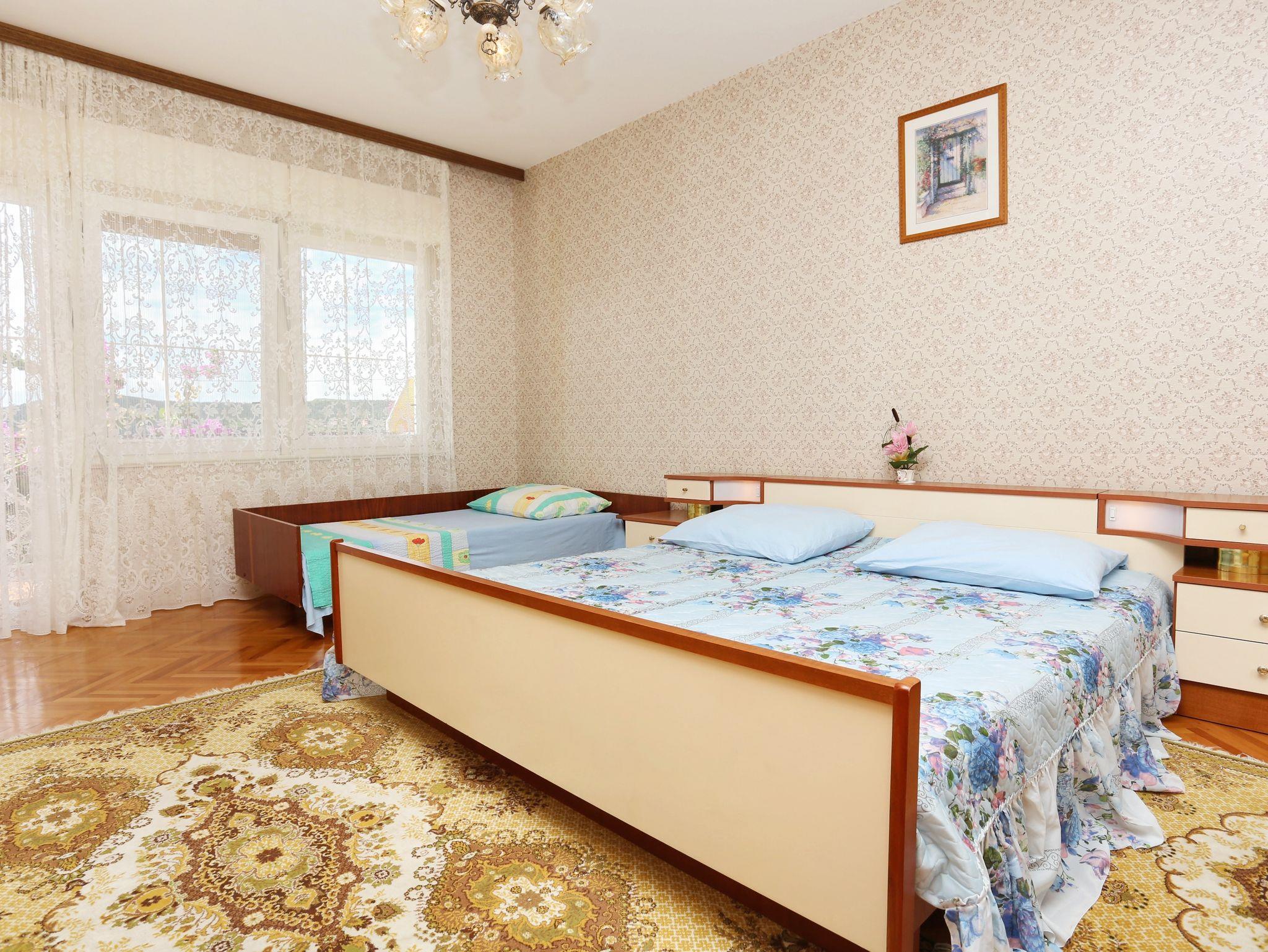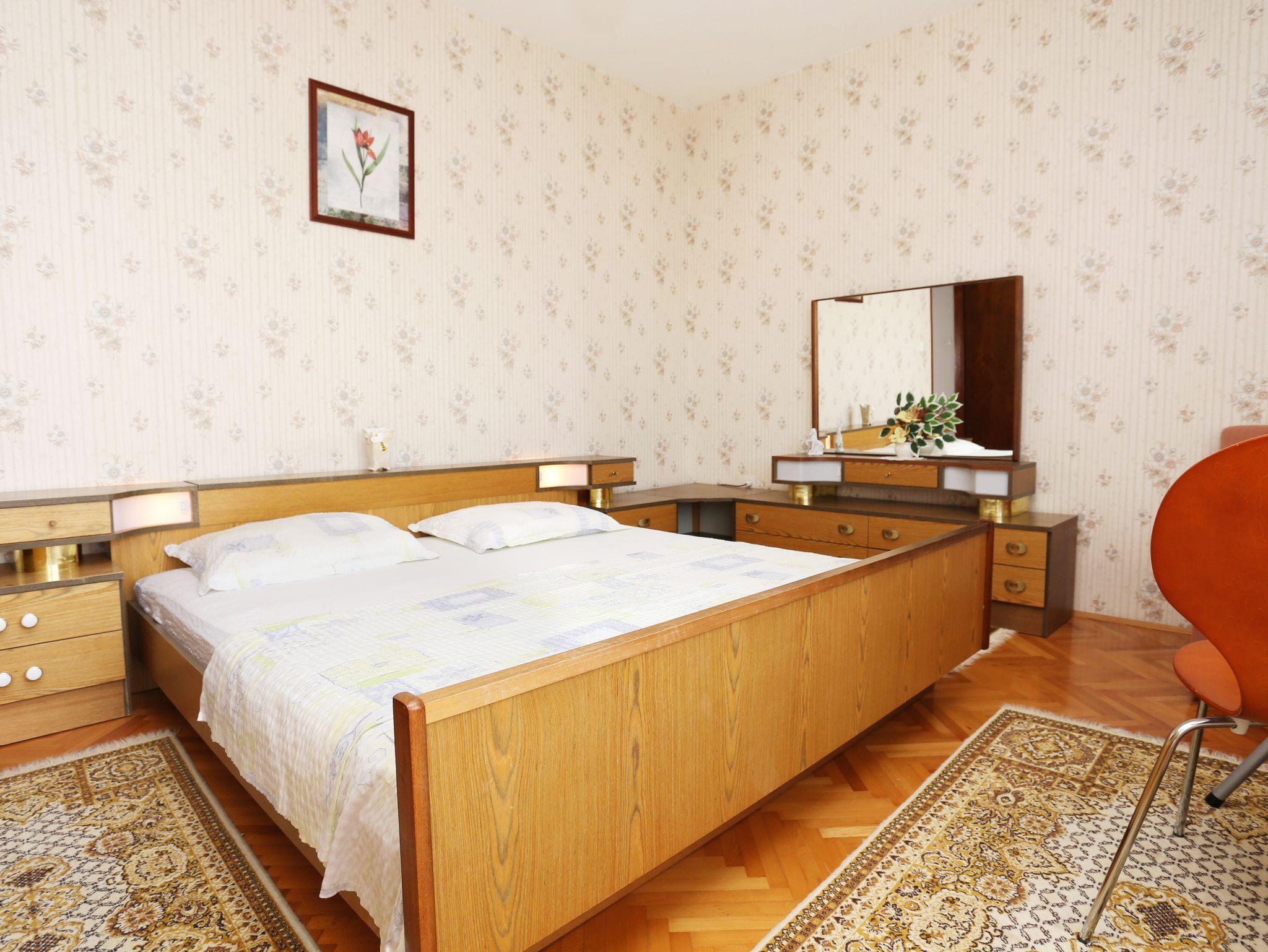 Ferienwohnung bietet Platz für 5 Gäste. Die Betten sind in Schlafzimmern, die es 2 gibt, und in Wohnzimmer, innerhalb einer Gesamtfläche von 63m2, angeordnet. Die Gäste haben eine eigene Terrasse zur Verfügung, auf der sie in warmen Sommernächten genießen können. Das Apartment bietet Meerblick. Es ist erlaubt, Speisen auf dem Gemeinschafts-Grill vorzubereiten. In der Unterkunftseinheit besteht die Möglichkeit des Mitbringens von Haustieren gegen Aufpreis. Räume der gebuchten Unterkunftseinheit werden nicht in eine Ganze verbunden. IM PREIS INBEGRIFFEN: Kurtaxe, Endreinigung, Klimatisierung, Parkplatz, Internet, Wäschewaschen, Bügeleisen, Bügelbrett, Föhn, 2 Kinderbettchen (im Preis enthalten). UNVERBINDLICHE ZUSÄTZLICHE KOSTEN: Bootsanlegeplatz (5,00 € pro Nacht), Haustiere (5,00 € pro Nacht). Die Verfügbarkeit zusätzlicher Dienstleistungen in Ihrem reservierten Termin und die Preise derselben (falls nicht aufgeführt) müssen im Voraus überprüft werden. Zusätzliche Dienstleistungen die in der Zahlungsaufforderung nicht aufgeführt sind werden direkt beim Vermieter bezahlt, angenommen der Gast nutzt auch diese. Ermäßigung auf den Grundpreis: Gratistag 28=25 (bei einem Aufenthalt von 28 oder mehr Tagen erhalten Sie 3 kostenlose Tage für den Aufenthalt bis 31.12.26).