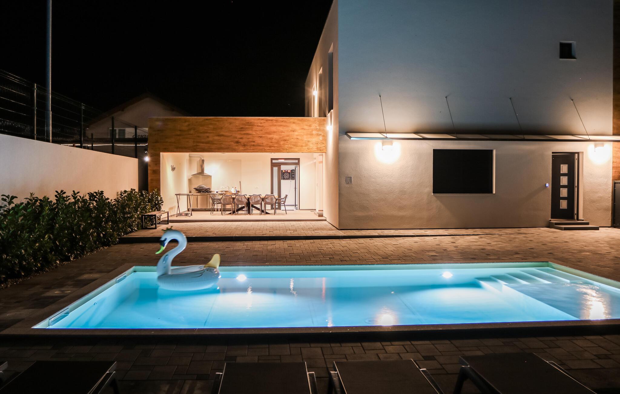 På den overbygde terrassen med utekjøkken kan du nyte deilige måltider i det fri, mens hagen med oppvarmet basseng inviterer deg til å sole deg og forfriske deg i vannet.