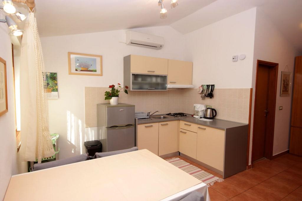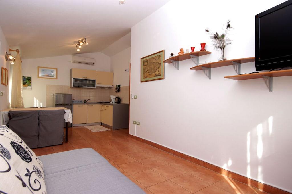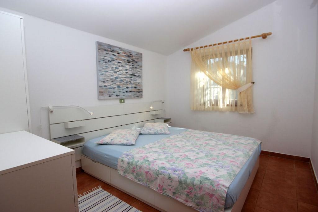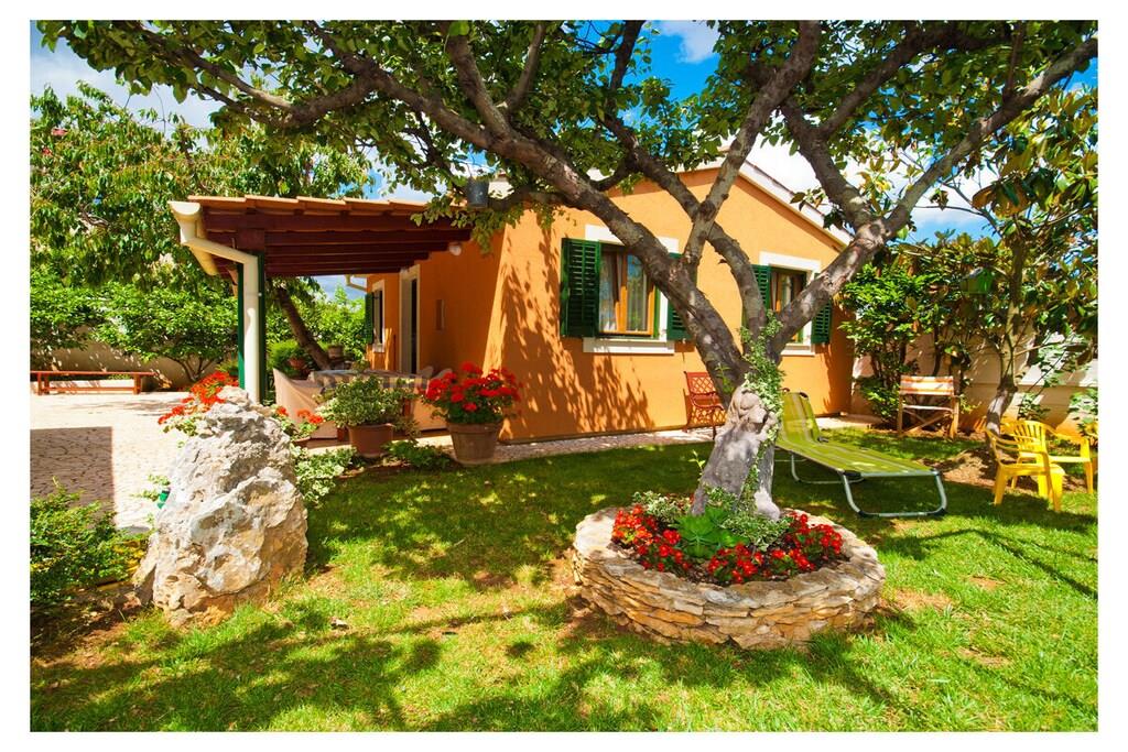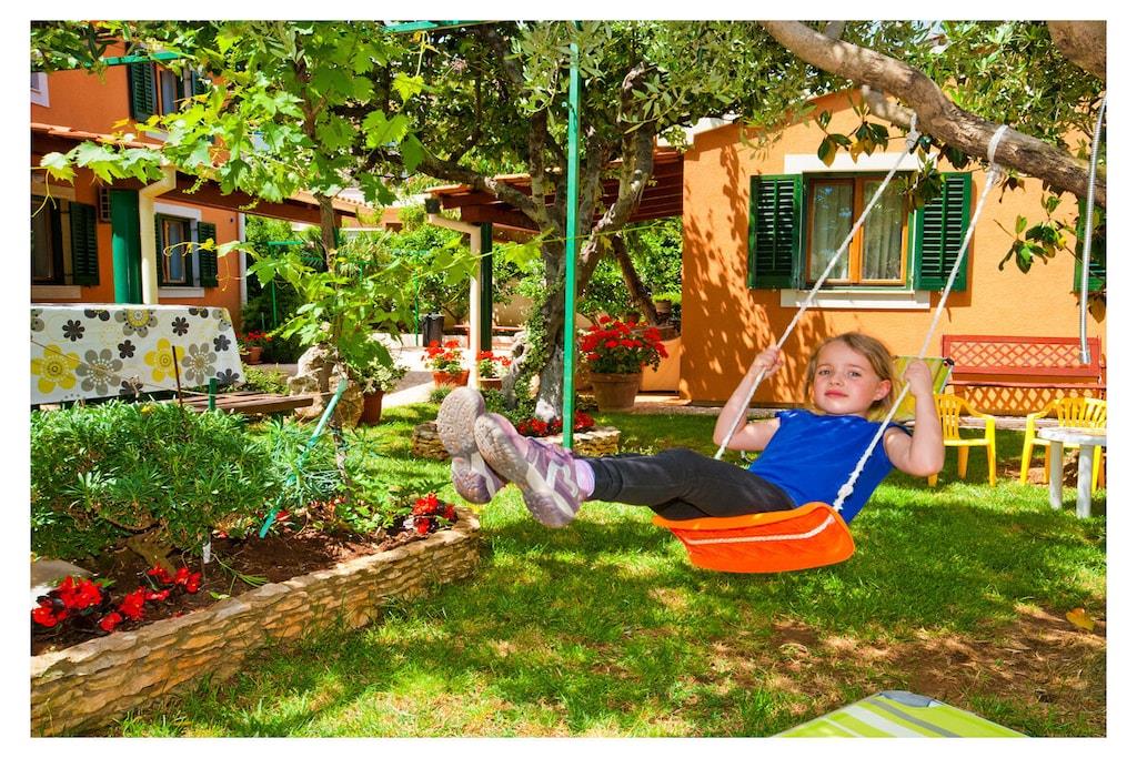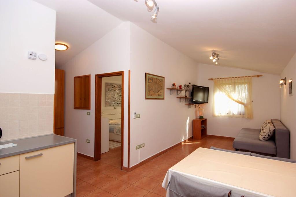 Ferieleiligheten Cherry A2+2 har et dobbelt soverom (sengetøy inkludert) og en sovesofa i stuen, kjøkken, bad (med håndklær), en stor overbygd terrasse og hage med basseng og avslapningsområde.