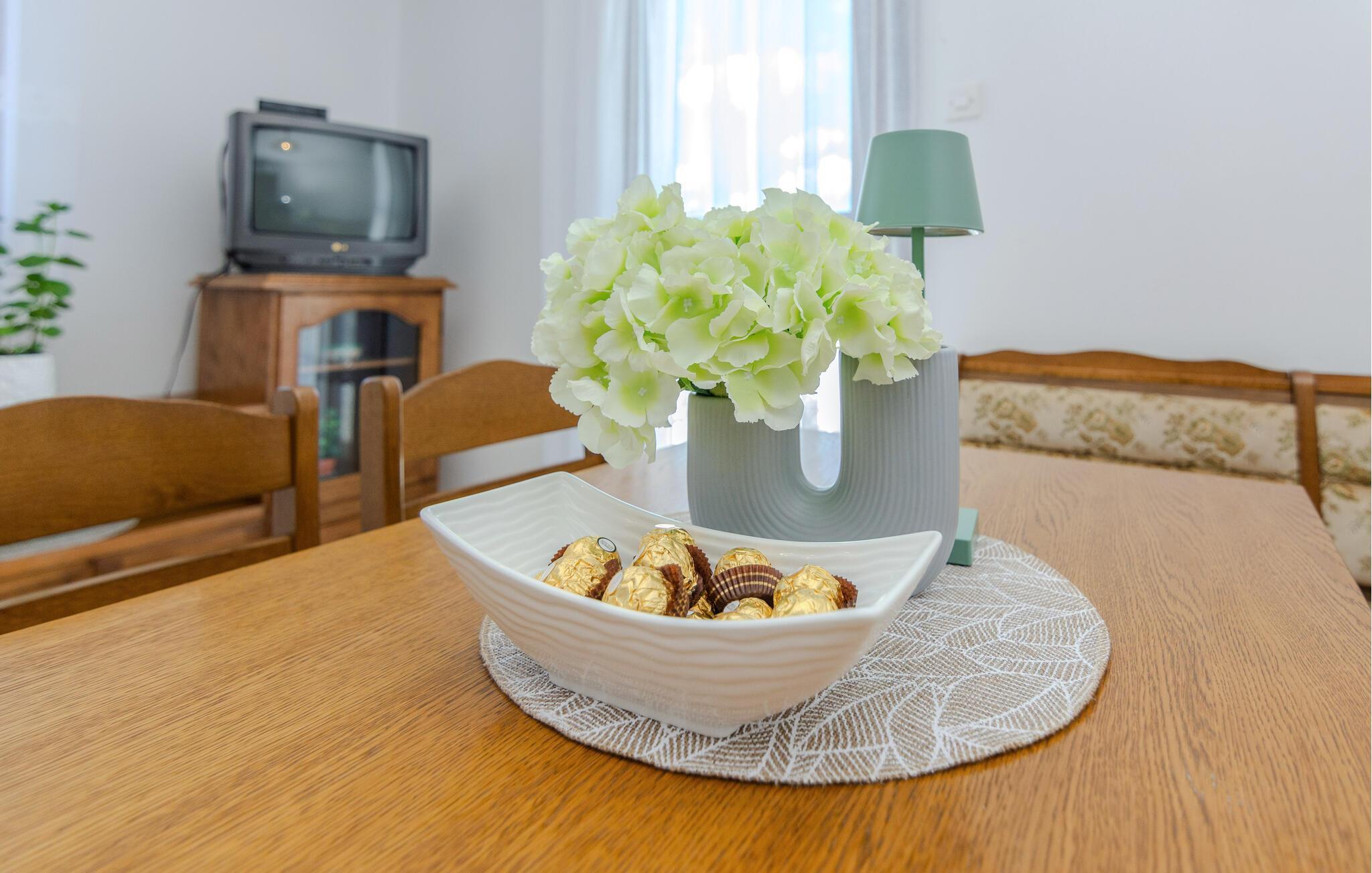 Slapp av med familien i denne attraktive ferieleiligheten. De klassiske tremøblene skaper en hjemmekoselig følelse som vil gjøre feriehverdagen til en bekymringsløs opplevelse. Her finner du alt du trenger for å slappe av og kose deg.