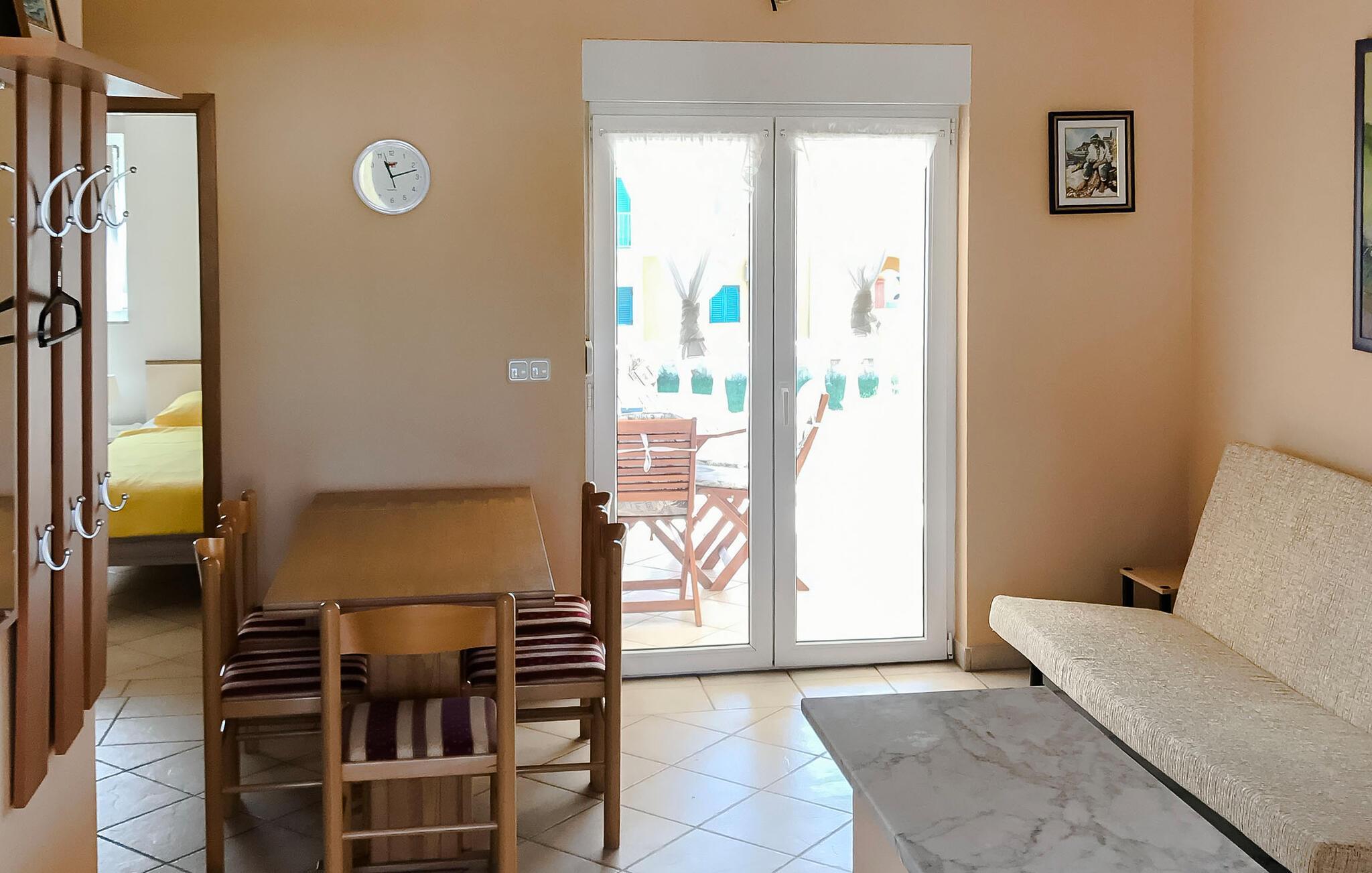 Denne leiligheten ligger på øya Vir, og er perfekt for en avslappende ferie. En lys stue med sofa og direkte utgang til terrassen og et praktisk kjøkken sørger for at du raskt vil føle deg som hjemme. Her kan du slappe av mens du lytter til musikk, tilbringe ettermiddagen med å spille kort eller prøve ut nye oppskrifter mens dere lager mat sammen.