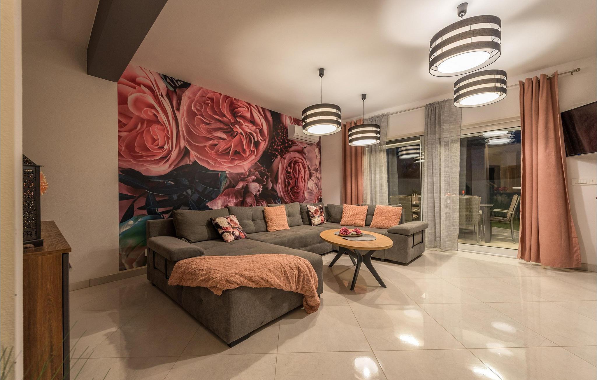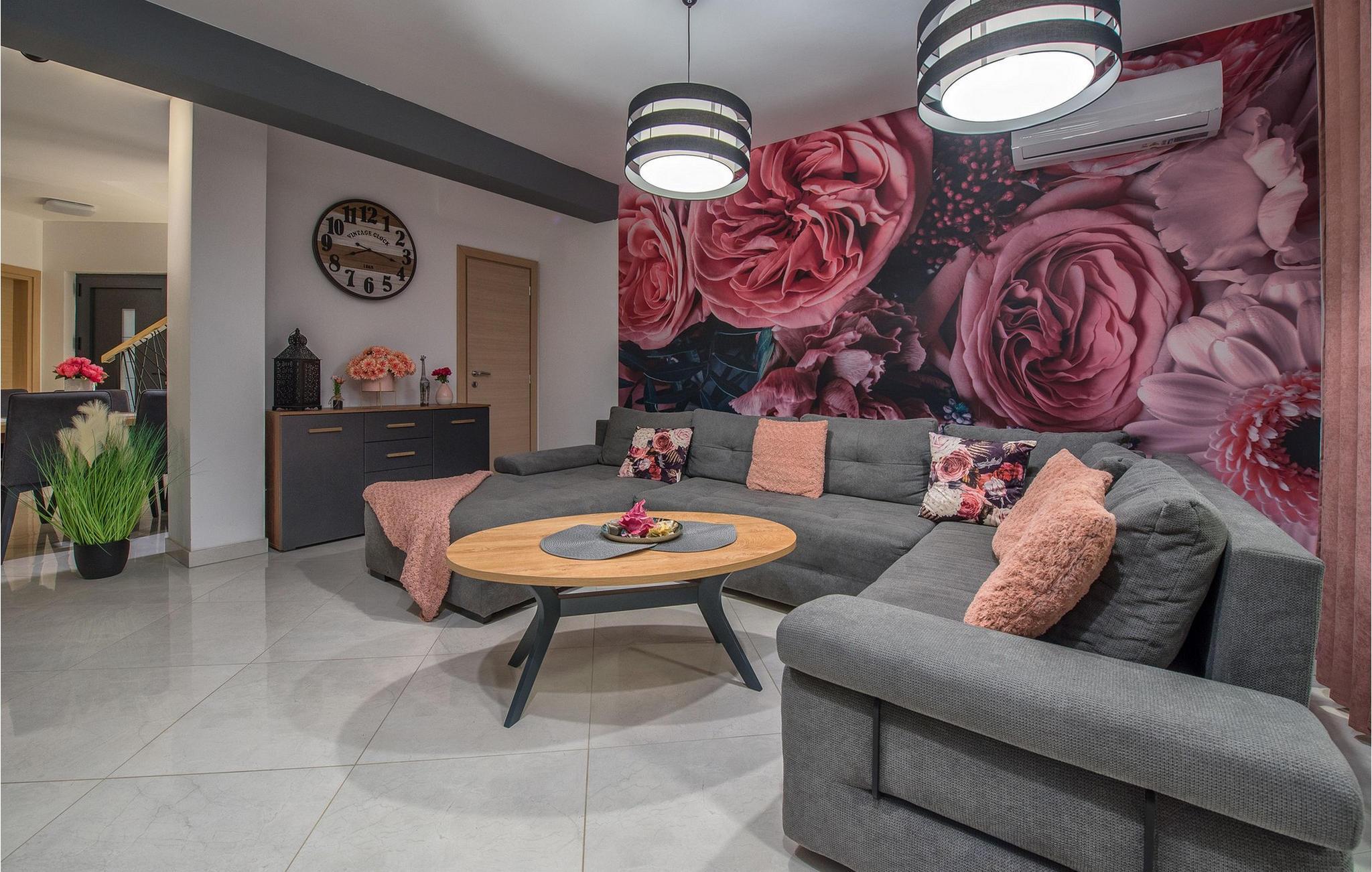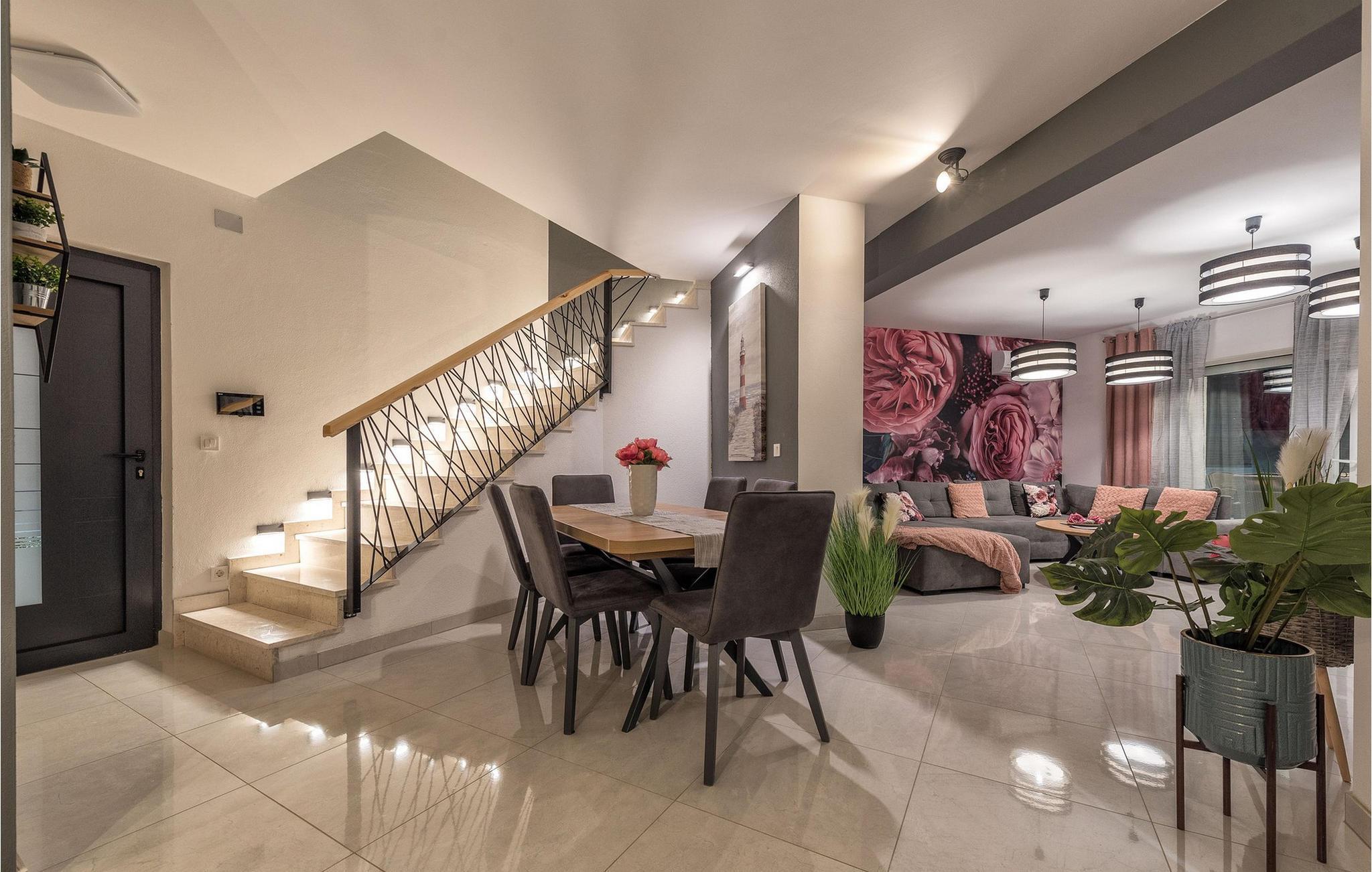 Inne i Villa Karlo skaper det imponerende rosatapetet en særegen atmosfære som gir oppholdsrommet et elegant, nesten kunstnerisk preg. Kombinasjonen av myke gråtoner, rosa aksenter og moderne belysning skaper en varm og innbydende atmosfære der du umiddelbart vil føle deg hjemme. Len deg tilbake i den store sofaen, nyt utsikten over hagen eller tilbring koselige kvelder med et glass vin. Det åpne kjøkkenet med elegant tredesign og den tilstøtende spisestuen innbyr til å lage mat sammen, ha lange samtaler og nyte ferien i fulle drag.