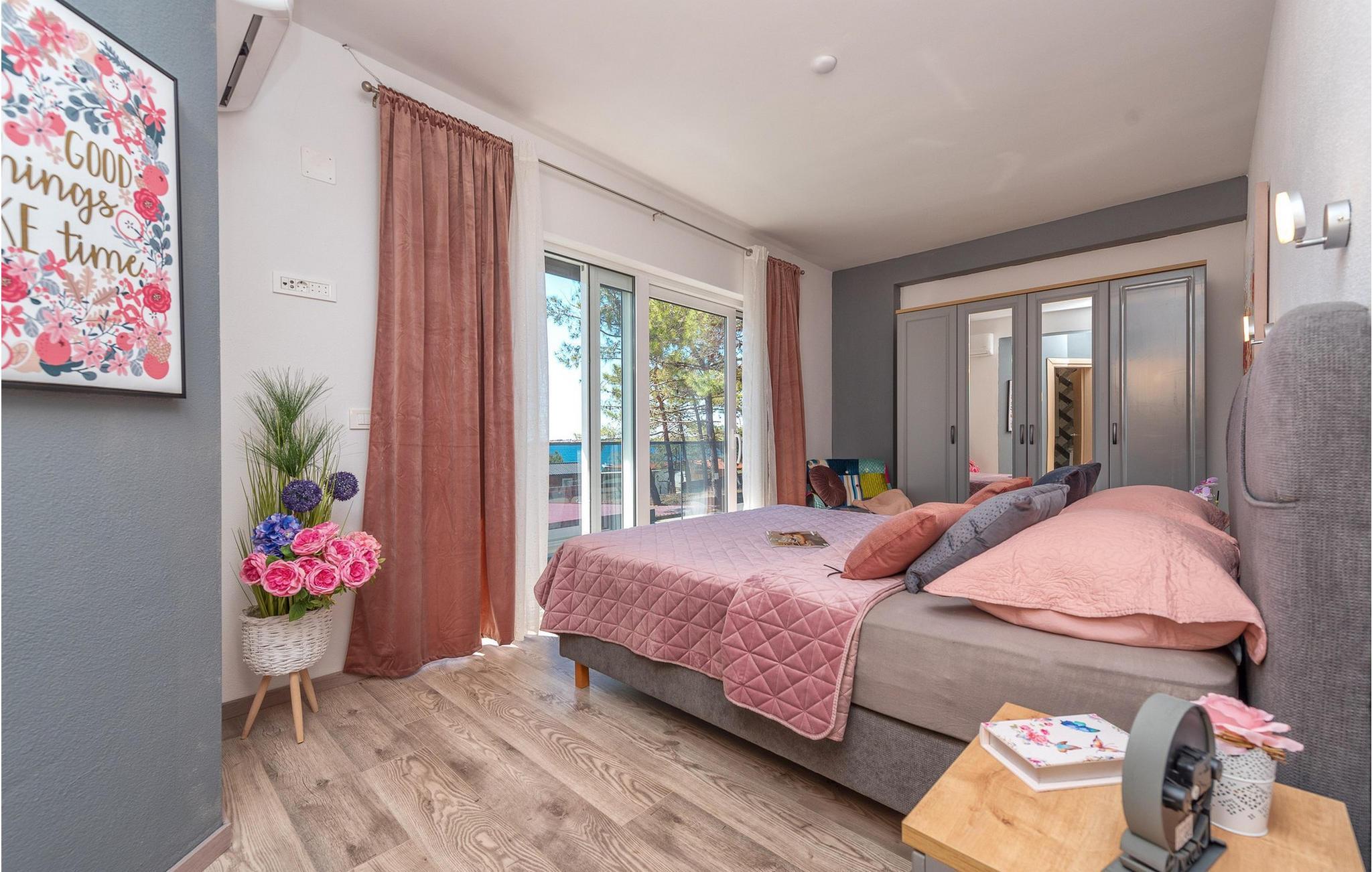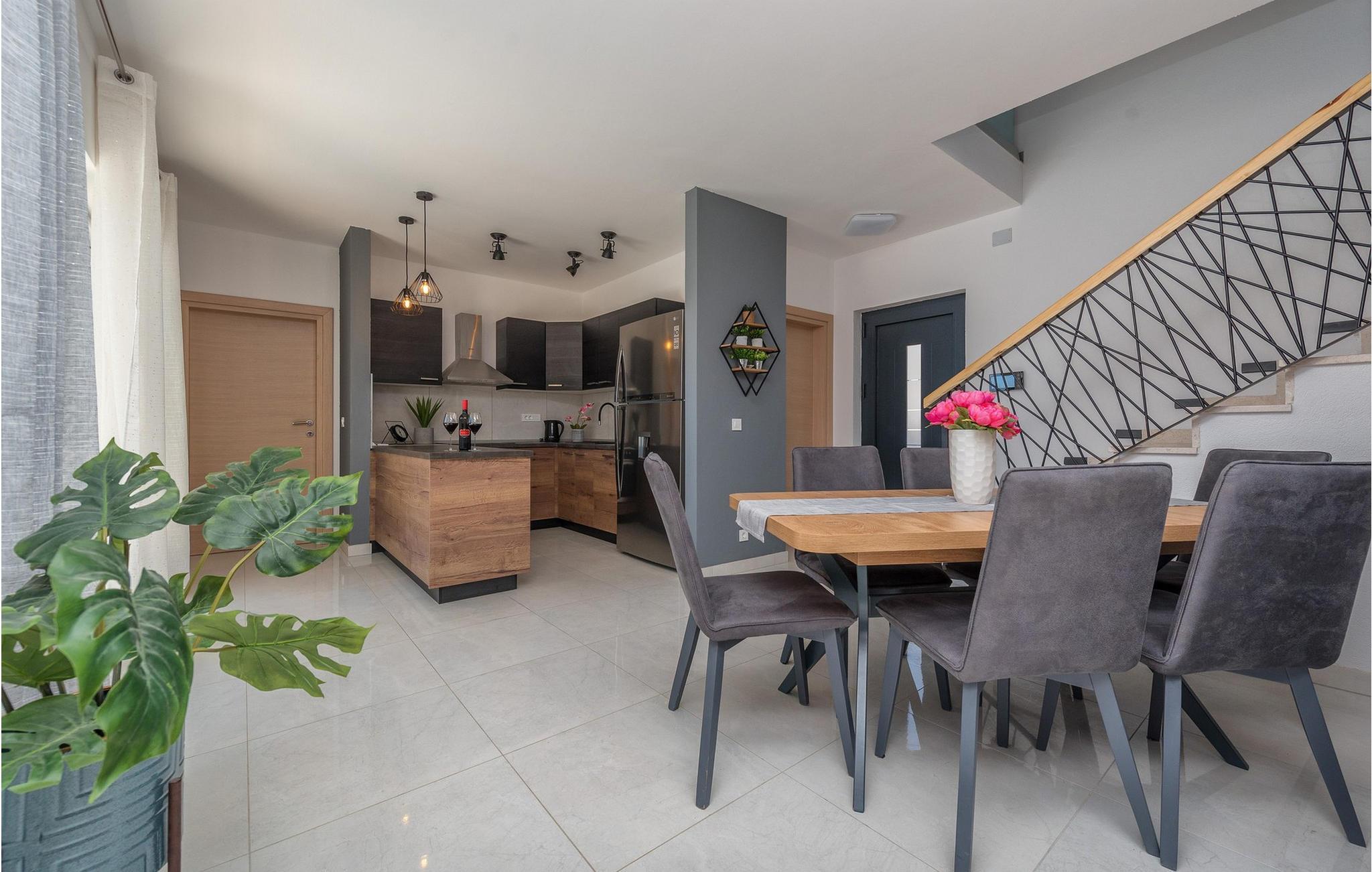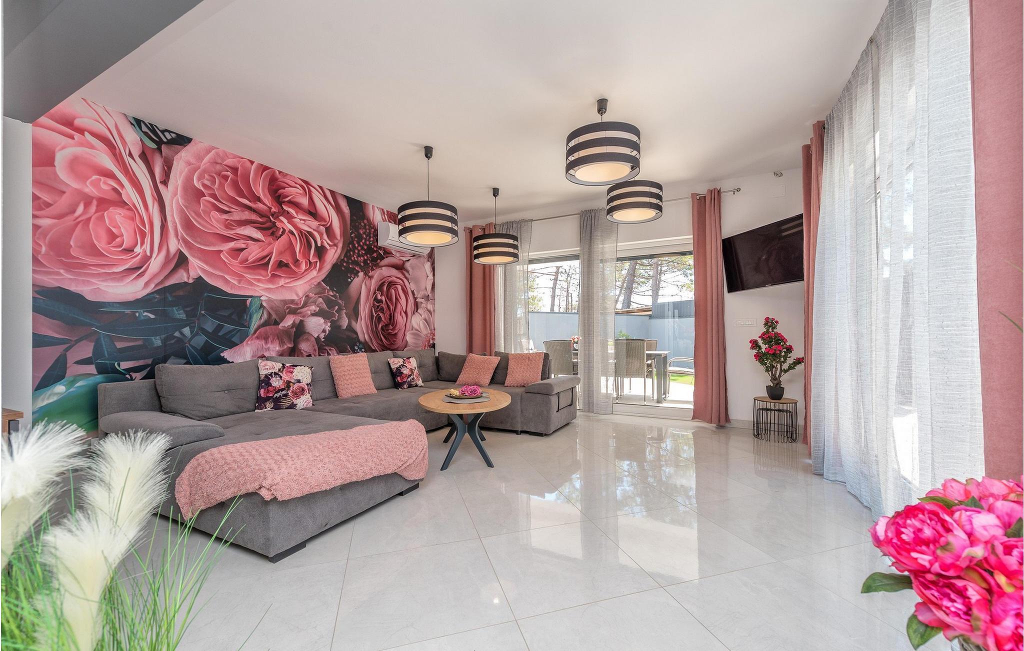 Inne i Villa Karlo skaper det imponerende rosatapetet en særegen atmosfære som gir oppholdsrommet et elegant, nesten kunstnerisk preg. Kombinasjonen av myke gråtoner, rosa aksenter og moderne belysning skaper en varm og innbydende atmosfære der du umiddelbart vil føle deg hjemme. Len deg tilbake i den store sofaen, nyt utsikten over hagen eller tilbring koselige kvelder med et glass vin. Det åpne kjøkkenet med elegant tredesign og den tilstøtende spisestuen innbyr til å lage mat sammen, ha lange samtaler og nyte ferien i fulle drag.
