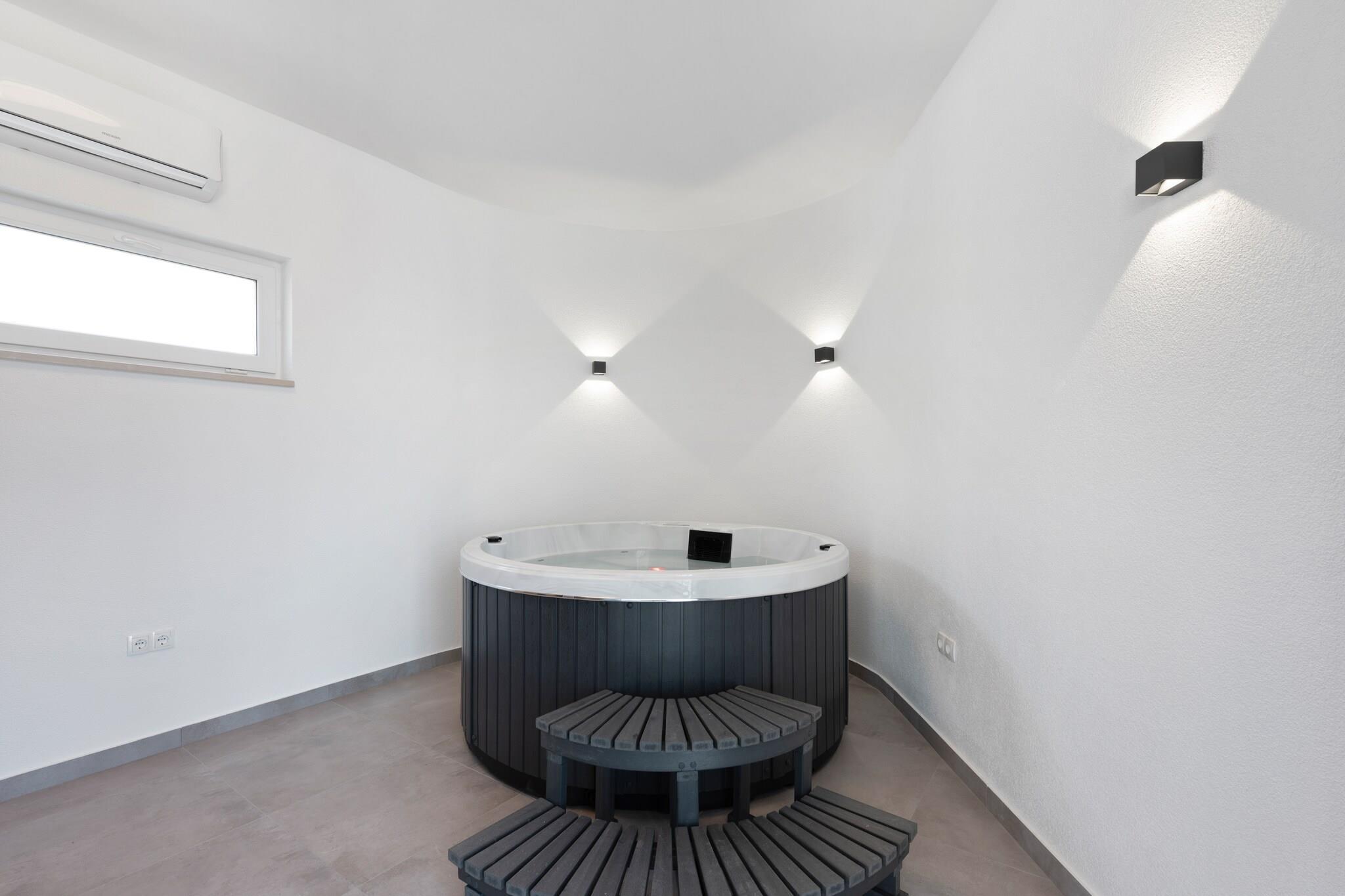 Fredelig øyferie med enkel tilgang Bare 400 meter fra havet og Virs pulserende sentrum, ønsker dette moderne feriehuset velkommen til opptil seks gjester for en rolig øyferie. Nyt bekvemmeligheten av nærliggende restauranter (250 m), butikker (150 m) og problemfri reise med Zadar lufthavn bare 37 km unna. Gratis Wi-Fi og gjennomtenkte fasiliteter gjør oppholdet ditt uanstrengt og komfortabelt. Stilig interiør og utendørs moro Boligen kan skilte med en lys stue med klimaanlegg og TV, et fullt utstyrt åpent kjøkken og to elegante soverom, hvert med eget bad, klimaanlegg og hårføner. For full avslapning kan du unne deg et innendørs boblebad, fyre opp grillen for utendørs måltider eller slappe av i den private badstuen. Utendørs kan du nyte det private bassenget, trampolinen, lekeområdet og solsengene, pluss treningsutstyr og sykler for aktive gjester. Utforsk strender, kultur og mat Tilbring dagene med å sole deg på Jadro-stranden eller besøke den gamle kirken for Det hellige kors i nærliggende Nin. Når det er på tide å spise, kan du prøve den lokale sjømaten på Viranka eller nyte middelhavsretter på Konoba Punta Duba. Enten du ønsker fredelig avslapning eller lokale eventyr, tilbyr dette kysttilfluktsstedet den perfekte øyopplevelsen.