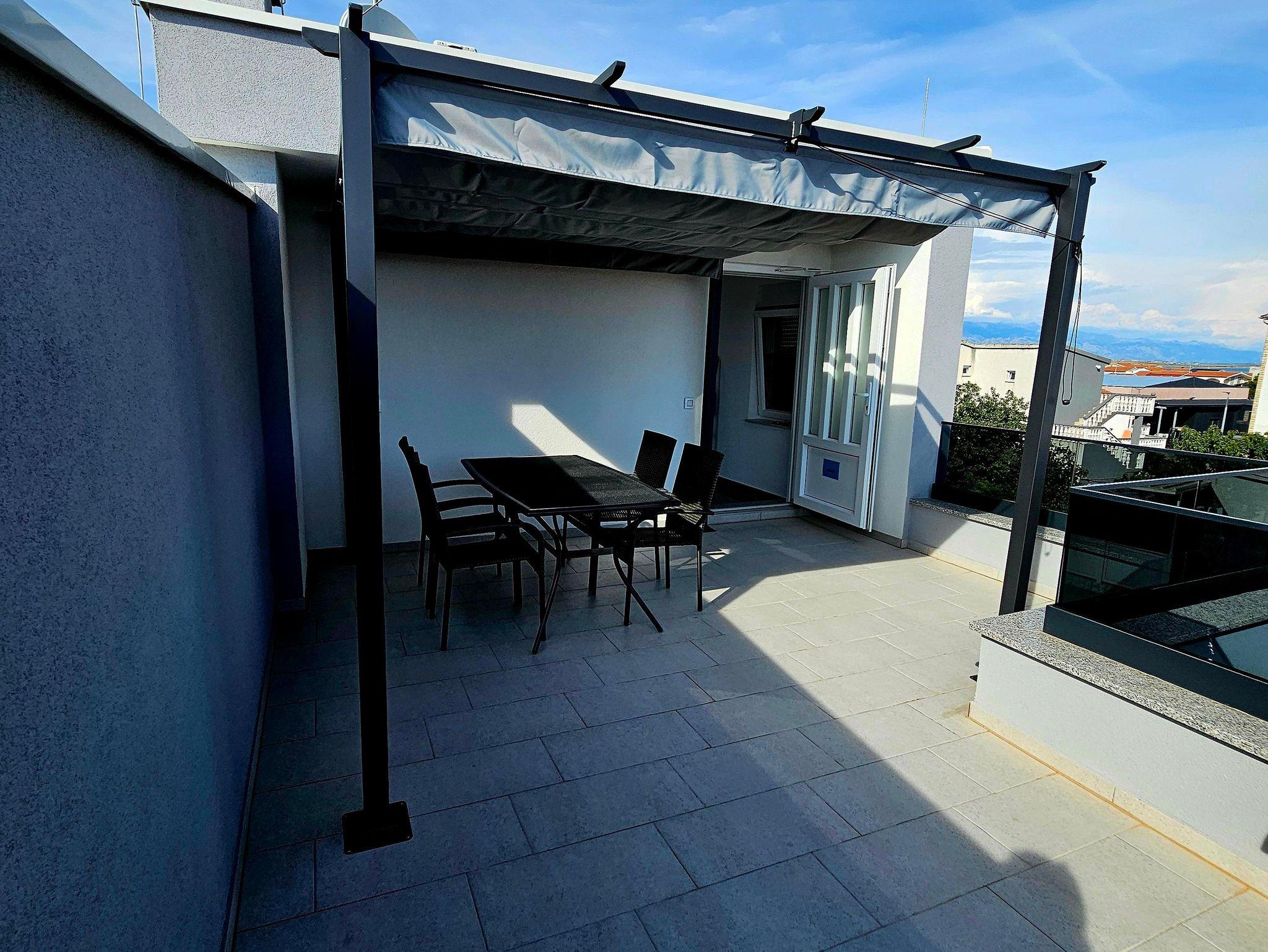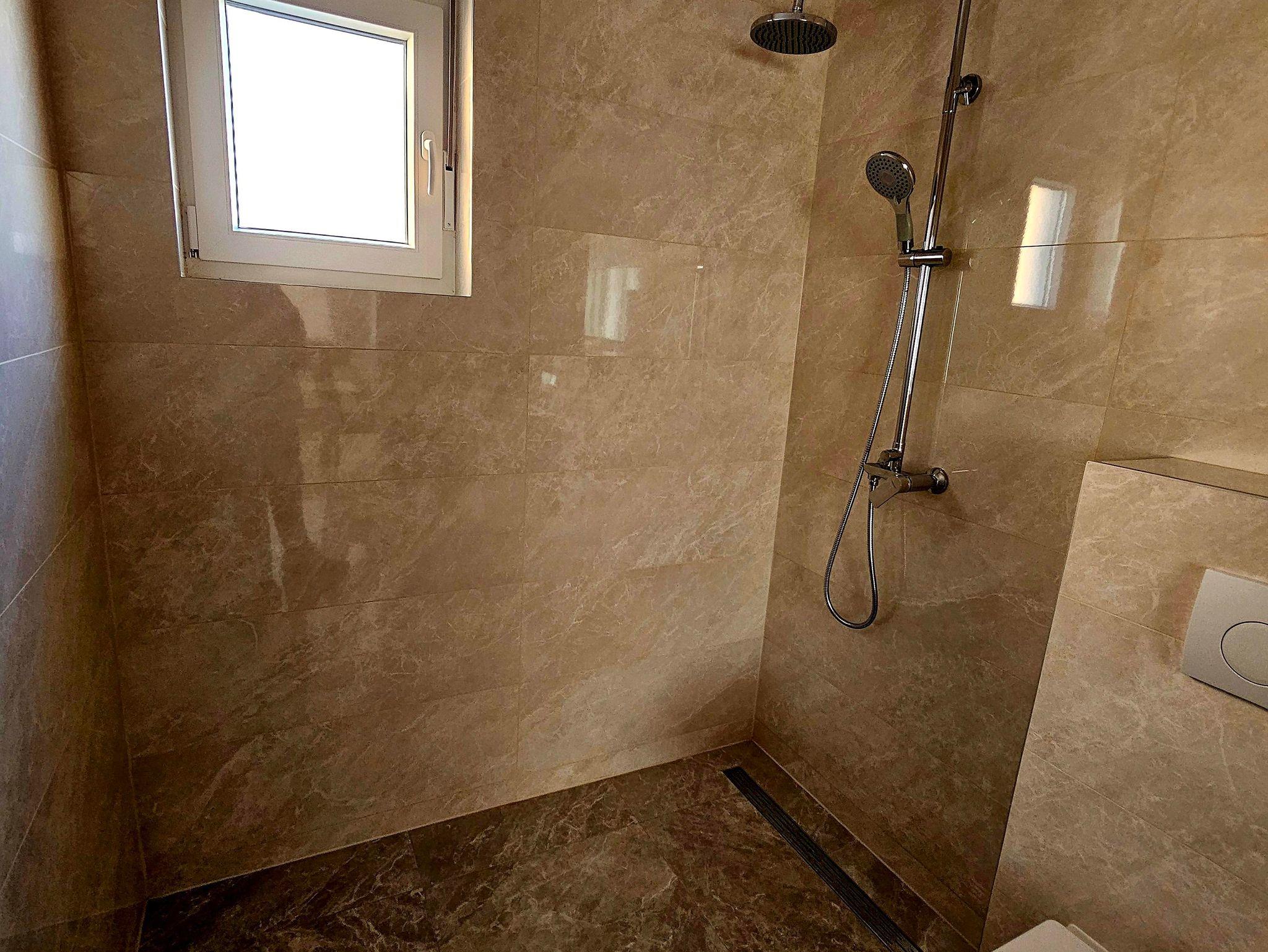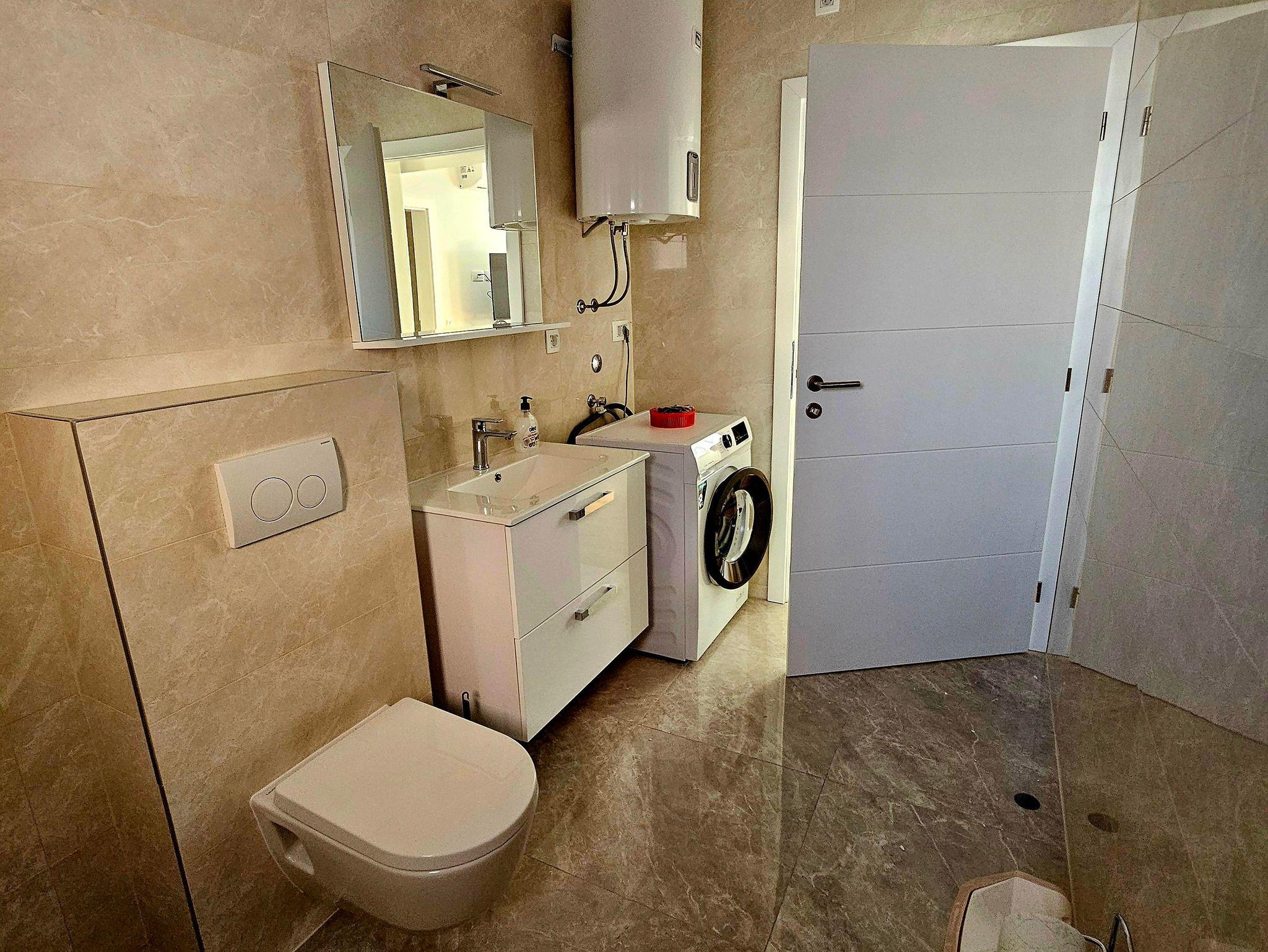 Die Wohnung verfügt über zwei moderne Badezimmer, beide mit bodenebener, barrierefreier Regendusche im Marmorlook. Waschmaschine (Toplader), Haartrockner und Handtücher sind vorhanden. Jeder Raum hat eine eigene Klimaanlage. Ein eigener PKW-Stellplatz, kostenfreies WLAN sowie Grillmöglichkeiten auf der Dachterrasse ergänzen das Angebot mit wunderschönem Meer- und dem Blick auf die für Kroatien bekannten sagenhaften Sonnenuntergänge.