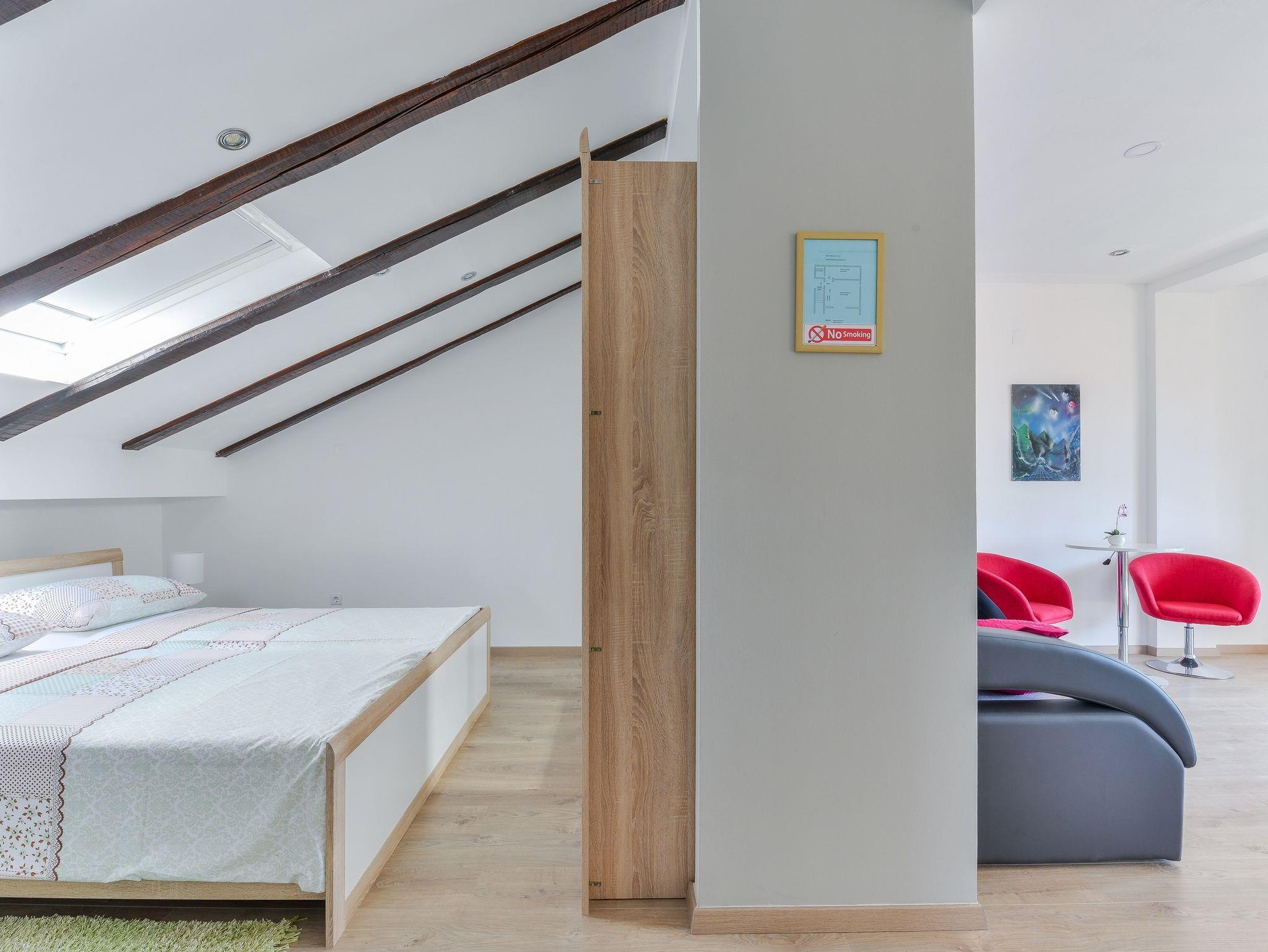 Studio bietet Platz für 4 Gäste. Die Betten sind in Schlafzimmern, die es 1 gibt, und in Wohnzimmer, innerhalb einer Gesamtfläche von 38m2, angeordnet. Die Gäste haben einen eigenen Balkon zur Verfügung, auf der sie in warmen Sommernächten genießen können. Das Studio-Apartment bietet Meerblick. Es ist erlaubt, Speisen auf dem Gemeinschafts-Grill vorzubereiten. IM PREIS INBEGRIFFEN: Kurtaxe, Endreinigung, Klimatisierung, Parkplatz, Internet, Kinderbett, Föhn. VERBINDLICHE ZUSÄTZLICHE KOSTEN: Aufzahlung für Kurzaufenthalte (prozentualer Zuschlag pro Nächtigungsanzahl: 30% - 1, 20% - 2, 10% - 3). Die Verfügbarkeit zusätzlicher Dienstleistungen in Ihrem reservierten Termin und die Preise derselben (falls nicht aufgeführt) müssen im Voraus überprüft werden. Zusätzliche Dienstleistungen die in der Zahlungsaufforderung nicht aufgeführt sind werden direkt beim Vermieter bezahlt, angenommen der Gast nutzt auch diese.