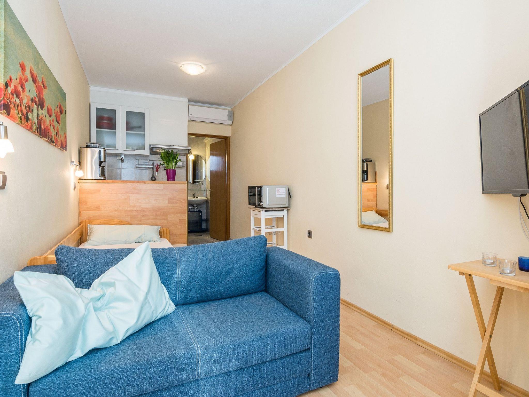 Studio bietet Platz für 2 Gäste. Die Betten sind in Wohnzimmer, innerhalb einer Gesamtfläche von 20m2, angeordnet. Es ist erlaubt, Speisen auf dem Gemeinschafts-Grill vorzubereiten. Die reservierte Unterkunftseinheit verfügt über einen gemeinsamen Balkon. IM PREIS INBEGRIFFEN: Kurtaxe, Endreinigung, Klimatisierung, Parkplatz, Internet, Fahrrad, Kinderbett, Föhn. VERBINDLICHE ZUSÄTZLICHE KOSTEN: Aufzahlung für Kurzaufenthalte (prozentualer Zuschlag pro Nächtigungsanzahl: 30% - 1, 20% - 2, 10% - 3). Die Verfügbarkeit zusätzlicher Dienstleistungen in Ihrem reservierten Termin und die Preise derselben (falls nicht aufgeführt) müssen im Voraus überprüft werden. Zusätzliche Dienstleistungen die in der Zahlungsaufforderung nicht aufgeführt sind werden direkt beim Vermieter bezahlt, angenommen der Gast nutzt auch diese.