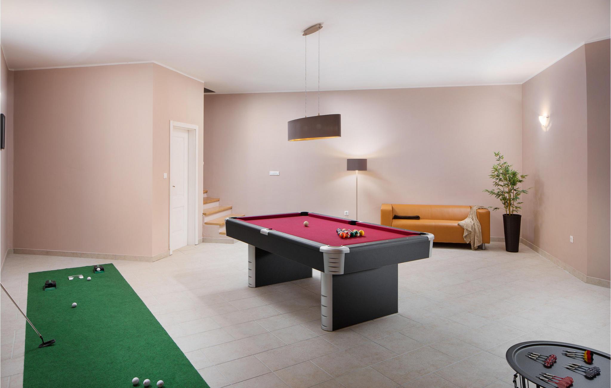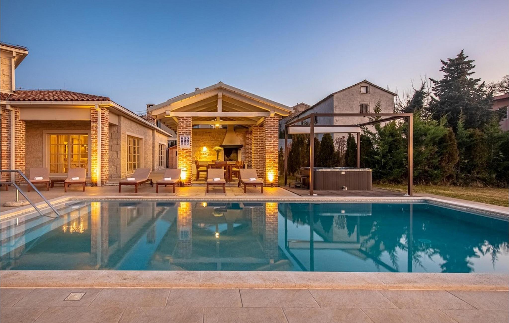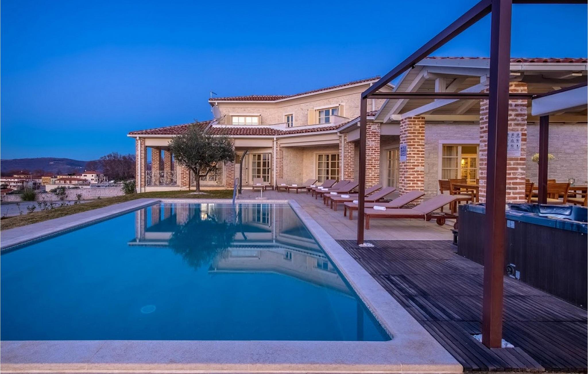 Den vakre Villa Star ligger i den lille, pittoreske landsbyen Bajkini i Istria, som på grunn av sin geografiske beliggenhet tiltrekker seg både naturelskere og de som setter pris på kvalitetsvin og deilig mat. Med sitt elegante eksteriør og interiør er Villa Star et ideelt valg for deg som ønsker å nyte en ferie i absolutt privatliv og omgitt av vakker natur. Villa Star har 4 romslige soverom med dobbeltsenger, samt 4 vakkert innredede bad og et separat toalett. Et sjarmerende, fullt utstyrt kjøkken ligger i forbindelse med en vakker spisestue hvor alle gjestene kan samles. Den romslige stuen vender ut mot den vakre steinterrassen, som har en fantastisk utsikt over de nærliggende vinmarkene. I Villa Stars vakkert anlagte hage er det et stort svømmebasseng (66 m²) hvor du kan ta en forfriskende dukkert hver dag, og du kan også slappe av i et deilig utendørs boblebad. Gratis Wi-Fi er tilgjengelig i alle hjørner av inne- og uteområdene i denne villaen, som har klimaanlegg. Villa Star har et boareal på 480 m², ligger på en 1400 m² stor tomt og tilbyr gjestene absolutt alt: luksus, vakker natur, moro og ikke minst en velfortjent ferie. Bare noen få minutters gange fra villaen ligger den berømte vingården Arman, og i umiddelbar nærhet ligger noen av de beste vingårdene som enhver ekte vinelsker bør besøke. Kvalitetsrestauranter, markeder og barer finner du i Vi?inada, bare 3 km fra villaen. De større byene Pore? og Novigrad ligger 10 minutters kjøring unna, og bare 5 minutters kjøring fra villaen ligger den vakre middelalderbyen Motovun, som er kjent for filmfestivalen som arrangeres hvert år i juli. Tilbring ferien på Villa Star, skjem deg bort og opplev det rike gastronomiske og turistmessige tilbudet i denne vakre regionen i Istria. Vær oppmerksom på at dette overnattingsstedet kun tar imot ungdomsgrupper eller utdrikningslag mot et refunderbart depositum. En ungdomsgruppe på dette overnattingsstedet består av personer under 30 år. Hvis du er en ungdomsgruppe eller et utdrikningslag, vil du bli bedt om å betale depositumet ved ankomst. Eventuelle beløp som kreves for å utbedre skader på overnattingsstedet forårsaket av deg under oppholdet, trekkes fra depositumet og returneres deretter til deg.