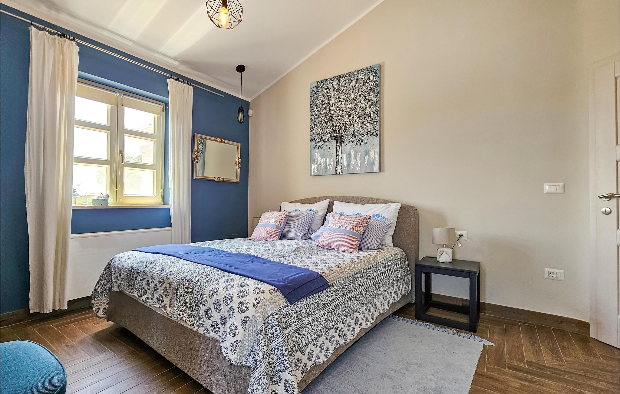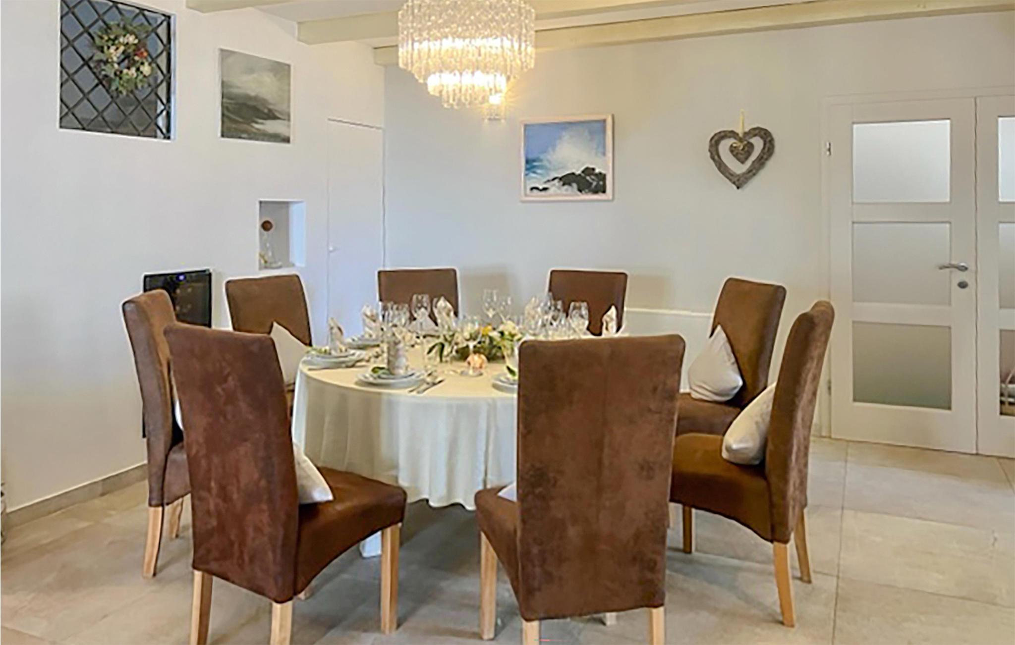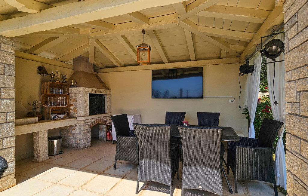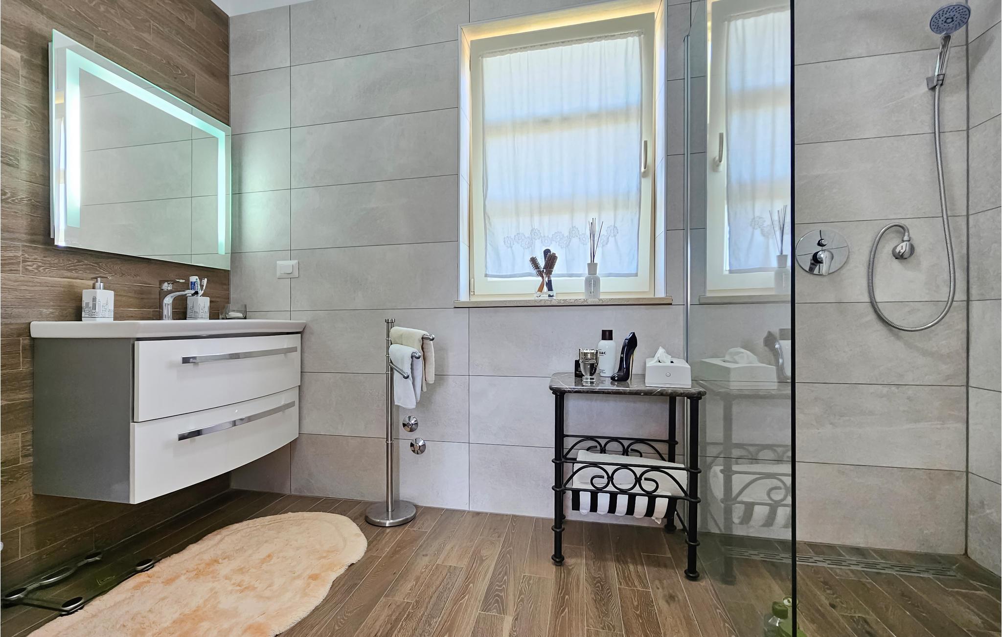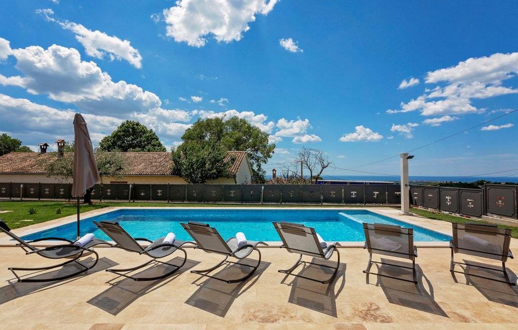 Den imponerende Villa Ginocchetti, som ble bygget i 2018, ligger bortgjemt i den istriske byen Valenti?i, som er en del av kommunen Ka?telir. Villaen er omgitt av vakkert olivengrønt, noe som gjør ferien ekstra avslappende. Du kan også slappe av på klippestranden, som ligger bare 7 kilometer fra villaen. Inne i villaen er det ett soverom i første etasje og tre soverom i andre etasje, hvorav ett har utsikt over rekkene av oliventrær og de to andre har utsikt over morgensolen og det krystallklare havet. Soverommene har klimaanlegg og dobbeltseng (180 x 200 cm). Hvis du tar med deg de minste til villaen, er en barneseng (60 x 120 cm) tilgjengelig på forespørsel. I første etasje er det stue med TV og kjøkken med plass til 8 personer i spisestuen. Villaen har fire private bad med dusj. Villaen har også et separat toalett. Kombinasjonen av moderne innredning og rustikk eksteriør gir komfort og luksus under oppholdet. På villaens gårdsplass er det et svømmebasseng (50 m2) hvor du kan slappe av og nyte utsikten over de vakre oliventrærne, som gir en ekte rustikk atmosfære. Det er også 6 solsenger rundt bassenget og en sittegruppe hvor du kan nyte naturen sammen med dine nærmeste. Det er to parkeringsplasser på eiendommen ved siden av villaen og mer enn tre utenfor eiendommen. Villaen er fullstendig inngjerdet, slik at du kan nyte privatlivet i det istriske paradiset. Valenti?i ligger i nærheten av byen Porec, som har historiske monumenter som tar deg tilbake til Kroatias kulturarv. I Porec finner du også vakre strender med krystallklart hav, der du kan nyte utsikten over det mediterende havet. Det finnes ikke mindre enn tre golfbaner innenfor en radius på 20 km. Nærmeste tennisbane ligger 8 km unna, og det er 500 m til restauranter og puber. Fra neste sesong 2023 vil villaen ha en ladestasjon (wallbox) for elbiler (inkludert i leieprisen). Besøk den vakre Villa Ginocchetti sammen med dine nærmeste, som vil gi deg fred og avslapning i vakre Istria! Kjæledyr er tillatt i denne boligen etter eierens skjønn eller mot et gebyr.