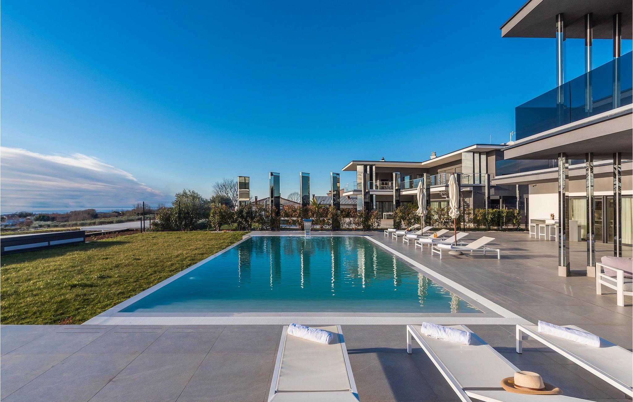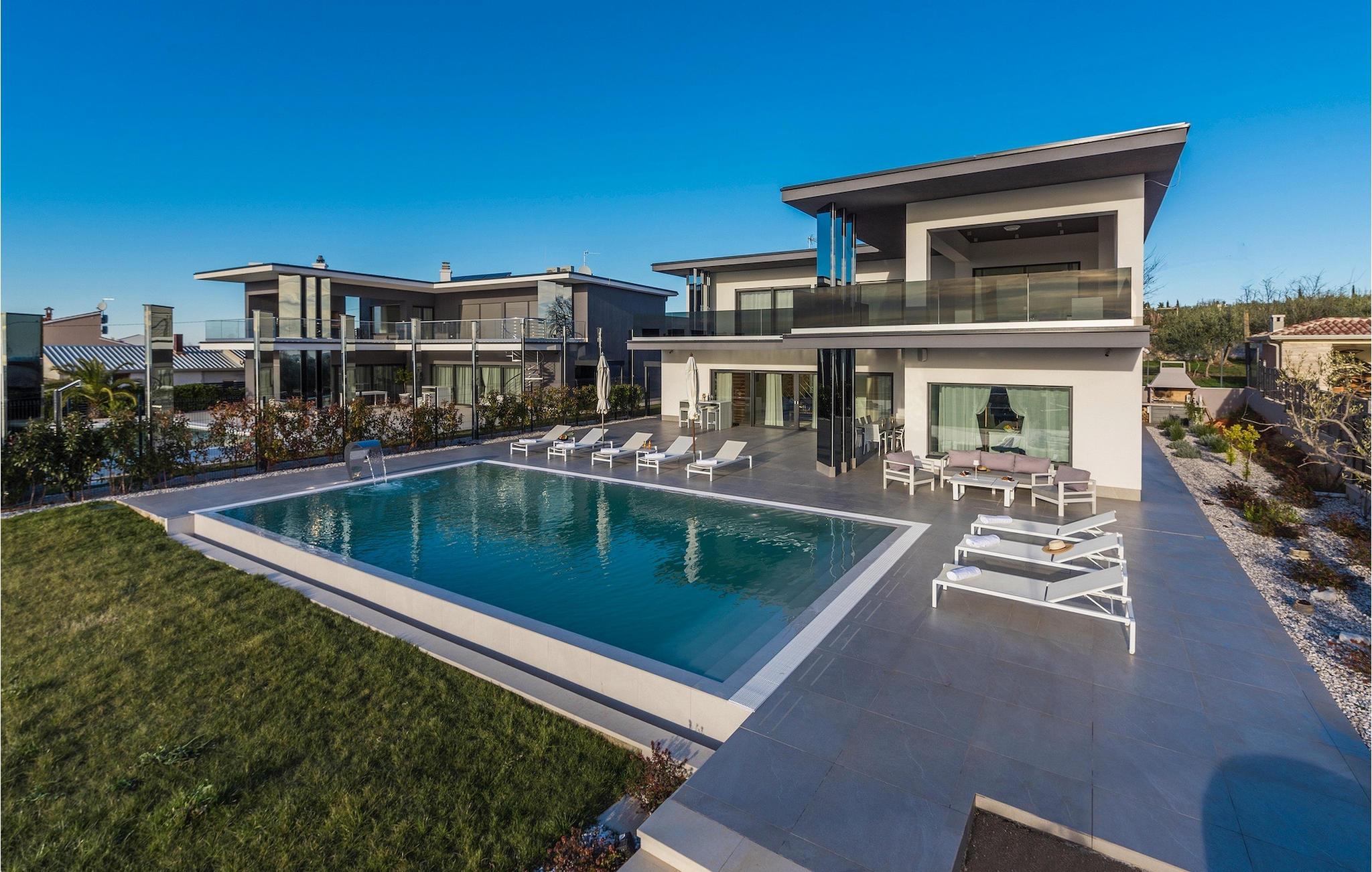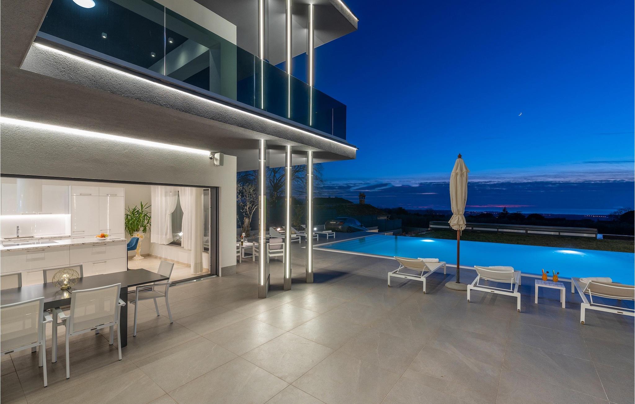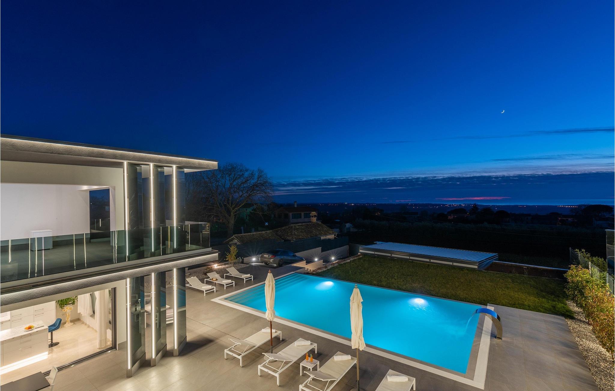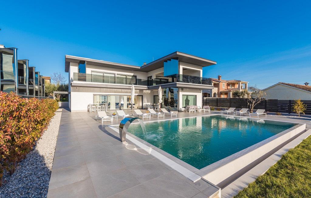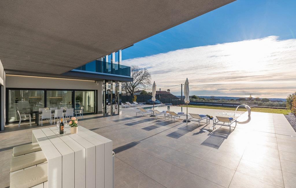 Dette er drømmevillaen du har lett etter så lenge! Designervillaen Sara Kastelir i nærheten av Porec er det perfekte stedet for en luksuriøs ferie med familie og venner! Selv eksteriøret vitner om stil. Et 66 m2 stort basseng er helt klart blikkfanget når du kommer inn på eiendommen. Her kan du forfriske deg i det kjølige vannet på varme sommerdager og nyte tiden sammen med dem du er glad i. Terrassen med salong og spisebord innbyr til mange koselige sommerkvelder. Men den første morgenkaffen med fantastisk utsikt over havet og landskapet er også en helt spesiell opplevelse.