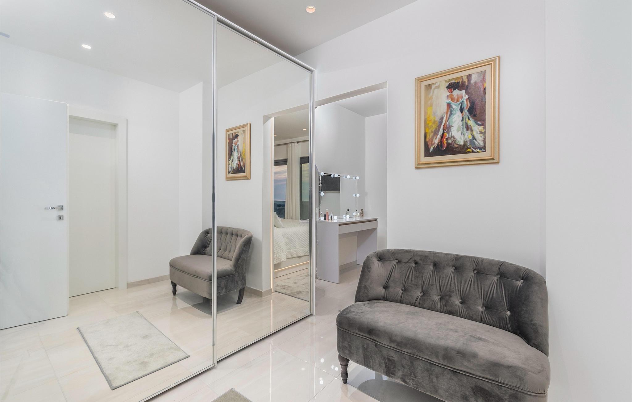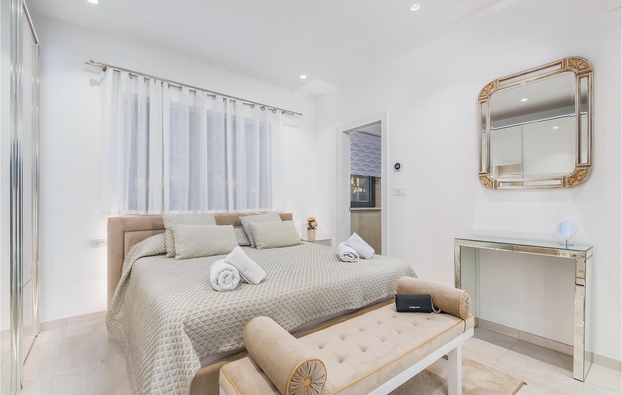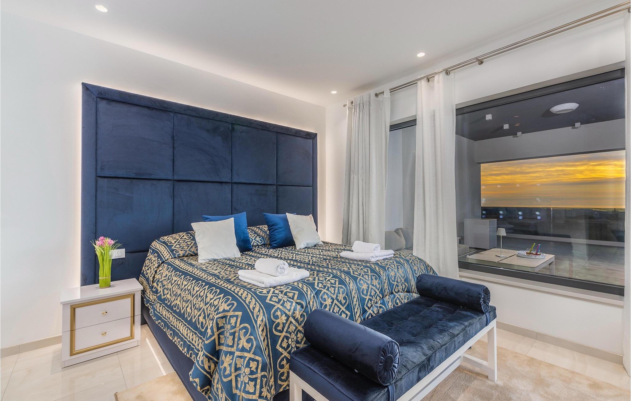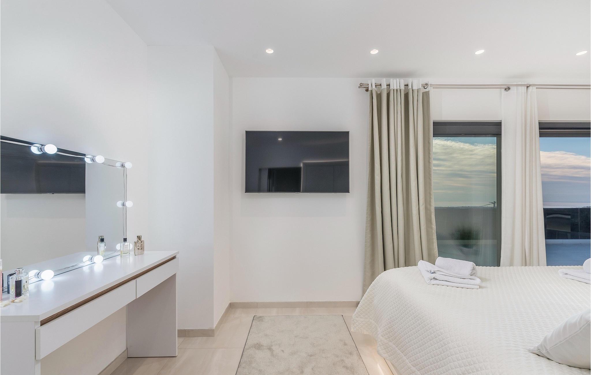 Går du inn i villaen via terrassen, kommer du inn i den moderne, lyse stuen med spiseplass og fullt utstyrt kjøkken. Interiøret er møblert og innredet med mange interessante detaljer, og er også en wow-effekt! I første etasje er det to store, komfortable soverom med dobbeltsenger. Ytterligere tre elegante soverom i andre etasje lover avslappende søvn og vakre drømmer. Alle soverommene er individuelt og smakfullt innredet og har eget, vakkert bad, TV og klimaanlegg.